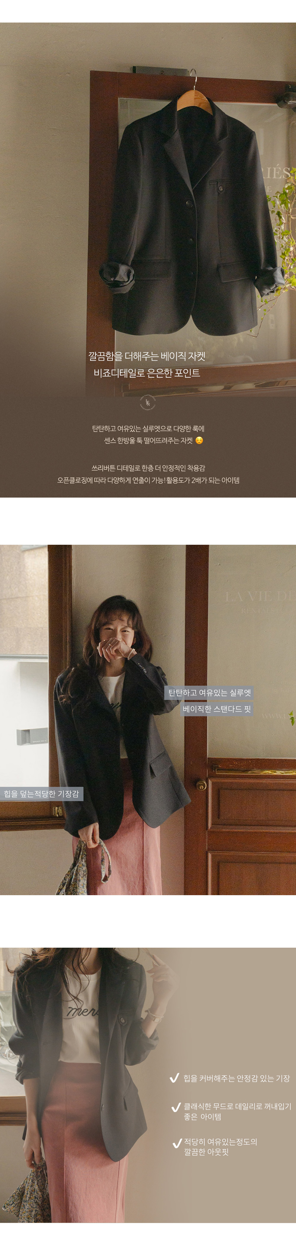 한껏 따뜻해진 날씨에 설레는 마음으로 휘뚤마뚤 입기좋은 베이직 자켓 소개해요! 탄탄하고 여유있는 실루엣으로 다양한 룩에 센스 한방울 툭 떨어뜨려주는 아이에요~ 유연한 원단감으로 더욱 편안하게 입어지며 거슬림없는 안감으로 다양한 이너와 함께 입어도 탈착의가 간편하답니다! 뒷트임 디자인으로 활동성을 더해주어 장시간 착용에도 거슬림없는 아이구요~ 바스트 비죠디테일로 베이직한 디자인에 은은한 포인트가 되어주는 아이구요:) 양사이드에 스냅포켓으로 수납을 더해주어 실용성까지 챙겨준 아이랍니다! 쓰리버튼 디테일로 한층 더 안정적인 착용감과 오픈클로징에 따라 다양하게 연출이 가능하여 활용도가 2배가 되는 아이템이에요:) 모델컷처럼 반팔티셔츠나 셔츠,니트 등 다양한 이너와 매치해도 손색없는 아이에요~ 하의 아이템도 다양하게 어울려 코디걱정 끝:) 베이지,그레이,블랙 세가지 베이직한 컬러로 어떤 컬러든 활용도 높게 입어질 아이템이라 자신있게 추천드리는 아이템이에요!