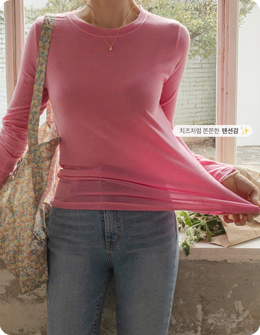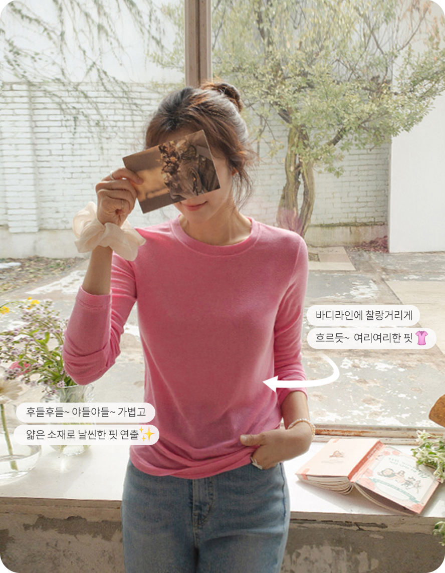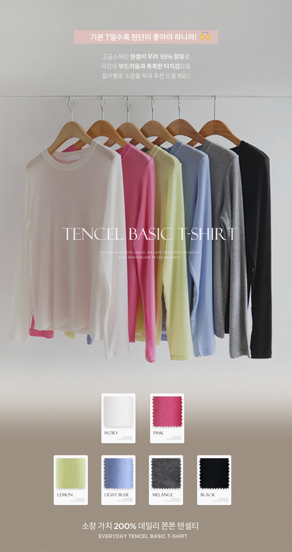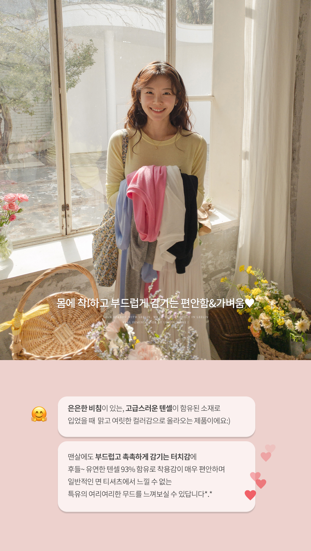 미친 스판끼!!! 정말 입자마자 미쳤다~ 이런 말이 자연스레 나오는 티셔츠 *.* 꼭 소개해 드리고 싶었어요 ㅎㅎ 기본 티셔츠 막상 구매하려고 보면 잘 없잖아요~ 소재랑 핏도 너무 완벽한 요물같은 아이라 꼭 소장하시길 바라는 마음!! 딱 봄부터 여름까지 쭉~ 여기저기 막 껴입기 딱 좋은 데일리 기본템으로 소장하시기 너무 좋아서 발 빠르게 소개해 드려요♥ 기본 티셔츠인 만큼 소재&핏 너무너무 중요하잖아요~! "미친 스판끼" 라고 소개해 드린 만큼, 쫀쫀한 치즈스판이 정말 너무너무 편하구요 입고 벗을때 뻣뻣하면 불편한데 쫀득한 신축성으로 너무 편하게 착용되는 티셔츠 :) 거기다 찰랑찰랑~~ 후들후들~~ 가볍고 얇은 소재로 자연스레 흐르듯 표현되는 티셔츠여서 입었을때 여리여리한 핏이 연출되어준답니다 ^^ 그만큼 몸도 슬림해 보이는 효과까지!! 그렇다고 바디라인에 쫙 하고 달라붙는 핏 아니구요~ 흐르듯 연출되어서 더 예쁘답니다 ㅎㅎ 촉촉하게 바디라인에 살포시~ 감겨주는 텍스처라 너무 부드럽구요 피부 예민하신 분들도 전혀 까슬거림 없이 착용되실 거예요~ 그 이유는~ 텐셀 93% 함유 덕분이에요! 그만큼 편안하고 부드러운 착용감이 정말 우수해요♥ 기장감도 적당하게 나와서 하의에 넣어서 연출해도, 빼고 자연스레 연출해도 딱 예쁜 기장감! 컬러는 라이트블루 / 핑크 / 레몬 / 메란지 / 아이 / 블랙까지 다양한 컬러 소장해 두시라고 6컬러 다양하게 준비했어요♥ 기본으로 무조건 소장하셔야할 아이, 블랙, 메란지 컬러와 라이트블루, 핑크, 레몬은 산뜻하고 상큼한 봄 컬러로 딱 좋아요 :) 포인트컬러로 즐기기도 좋구요~ 치즈같은 야들야들 스판끼에 부드러운 텍스처, 흐르듯 늘씬해 보이는 핏감까지- 정말 여기저기 막 껴입기 딱 좋은 티셔츠라 무조건 여러 컬러 소장해 두시길 바래요 ㅎㅎ♥