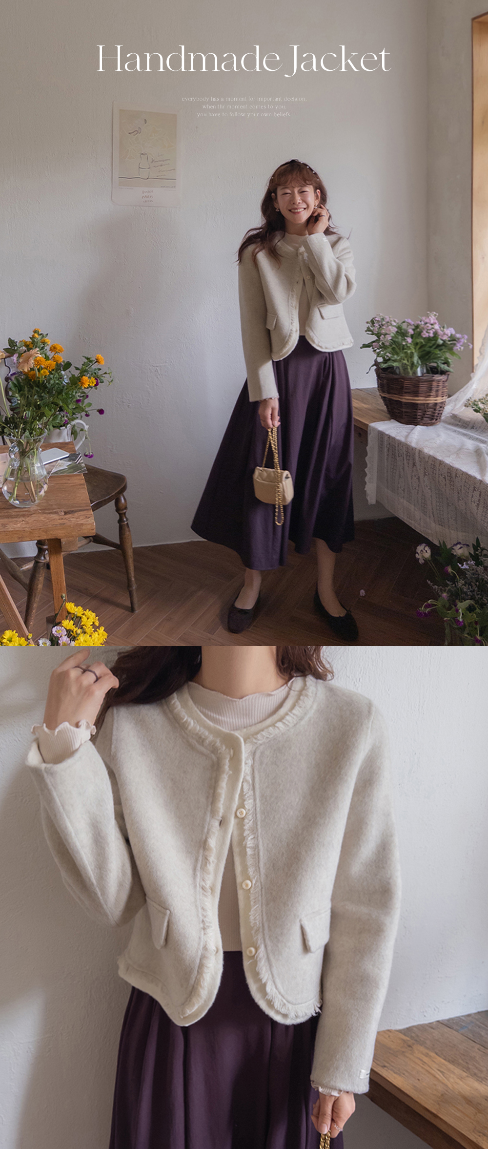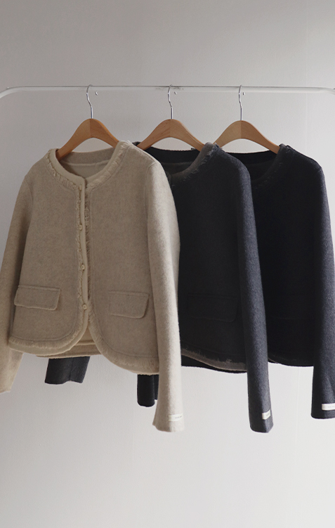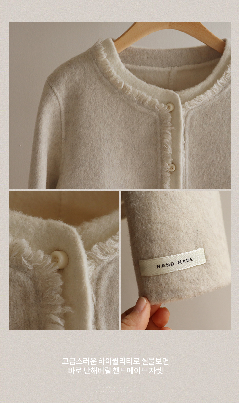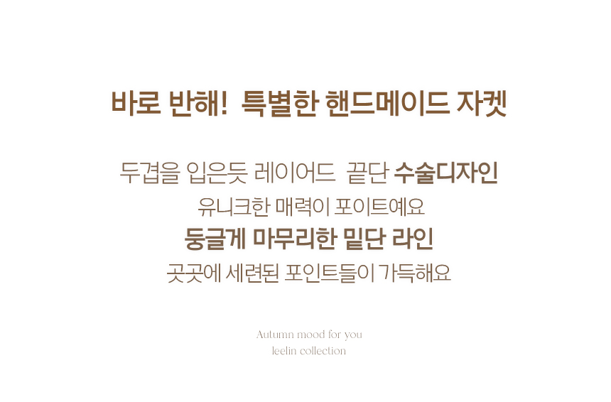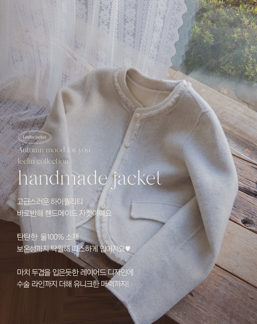 고급스러운 하이퀄리티로 실물보면 바로 반해버릴 핸드메이드 자켓이에요~ 울100% 소재로 탄탄함은 물론이고 보온성까지 탁월해 따스하게 입어져요♥ 마치 두겹을 입은듯한 레이어드 디자인에 수술 라인까지 더해 유니크한 매력까지! 노카라 넥라인으로 이너랑 매치하기도 쉬운~^^ 둥글게 마무리한 밑단 라인으로 영한 느낌도 놓치지 않아 캐쥬얼룩에도 찰떡같이 어울려요 버튼 또한 두께감이 느껴지는 독특한 쉐입이구요! 곳곳에 세련된 포인트들이 가득해 소장미 넘치는 자켓이랍니다~✨