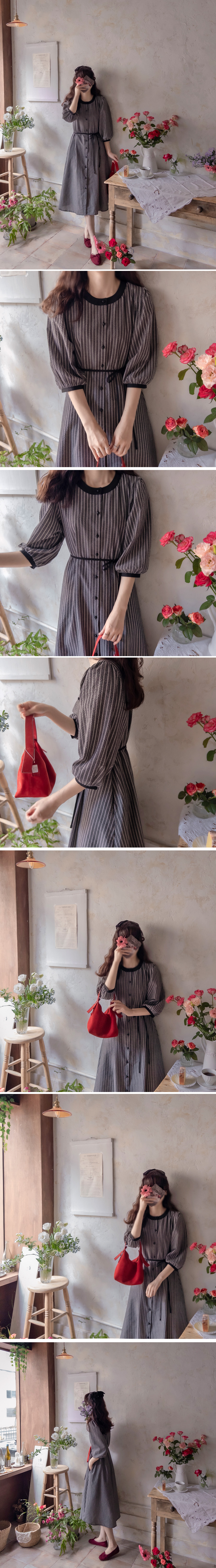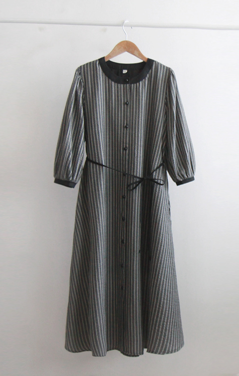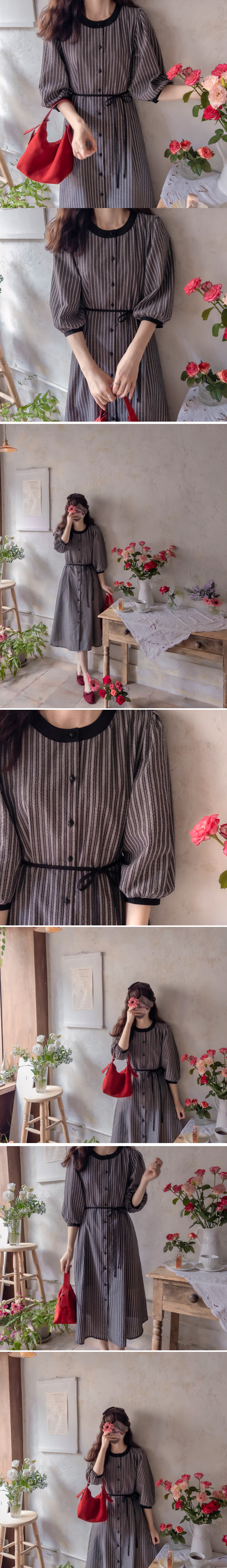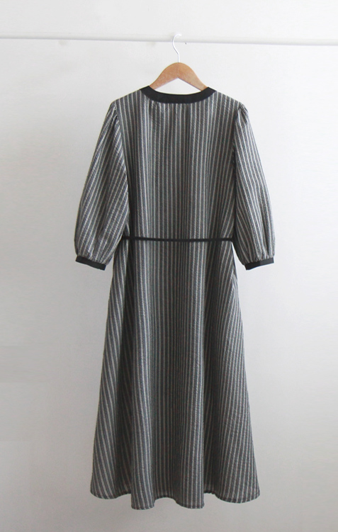 [Lining: Poly] [Button closure] [Separate waist strap set] [A pretty one-piece with a striped pattern and an elegant line that is perfect for fall] [The neck and sleeve color combination is also very pretty] [Complete the stylish fit by tying the waist strap] [Highly recommended as a one-piece that covers the body shape and is elegant and sophisticated]
