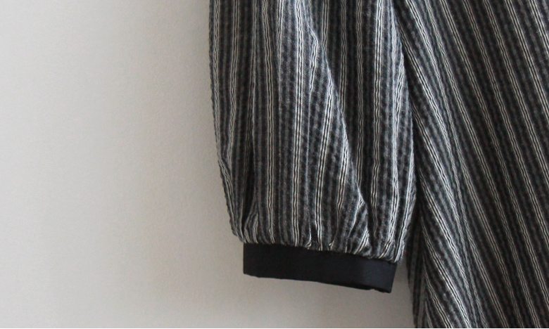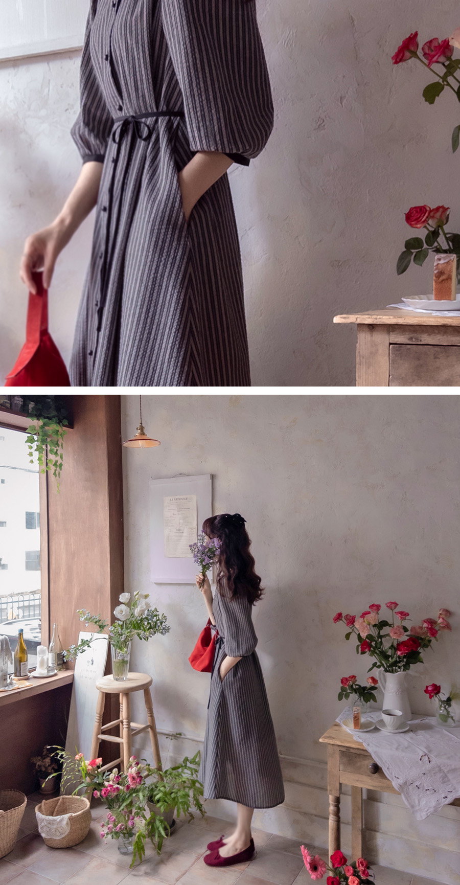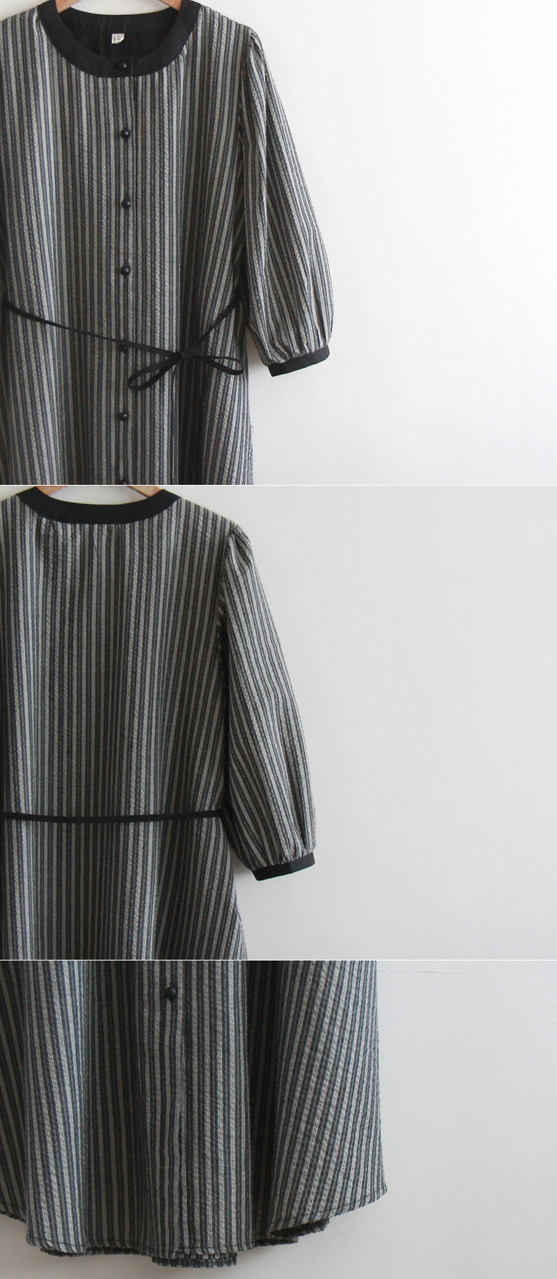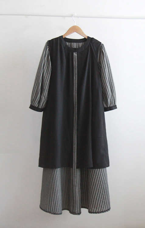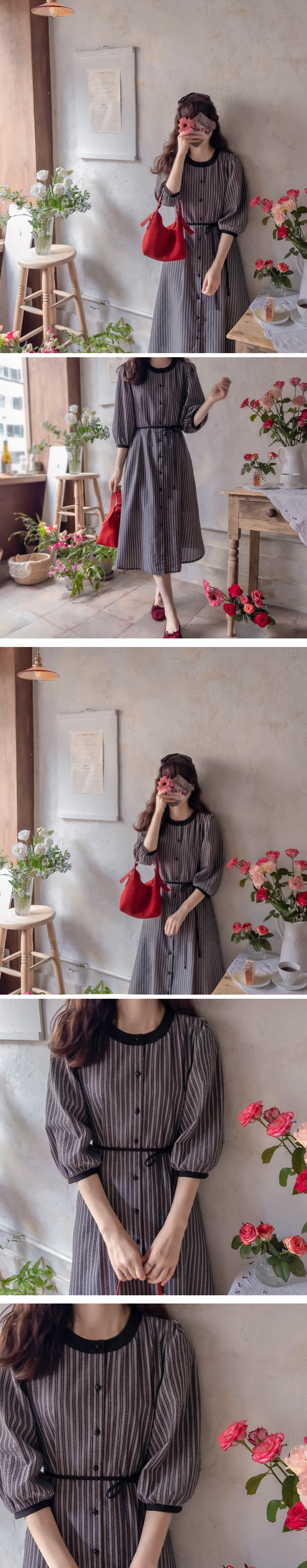 [Lining: Poly] [Button closure] [Separate waist strap set] [A pretty one-piece with a striped pattern and an elegant line that is perfect for fall] [The neck and sleeve color combination is also very pretty] [Complete the stylish fit by tying the waist strap] [Highly recommended as a one-piece that covers the body shape and is elegant and sophisticated]