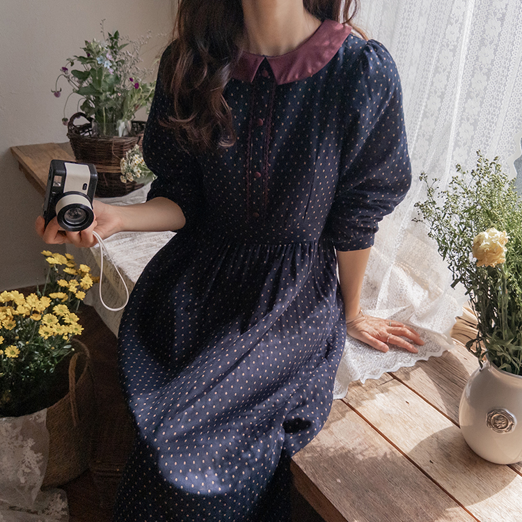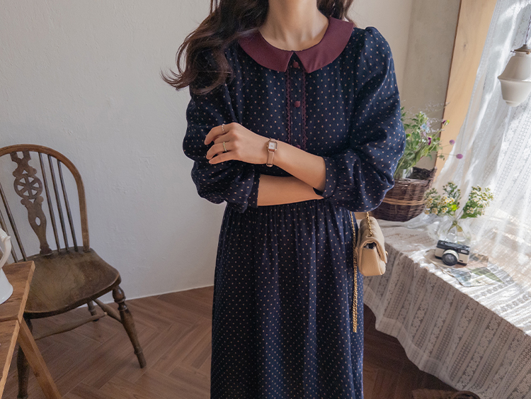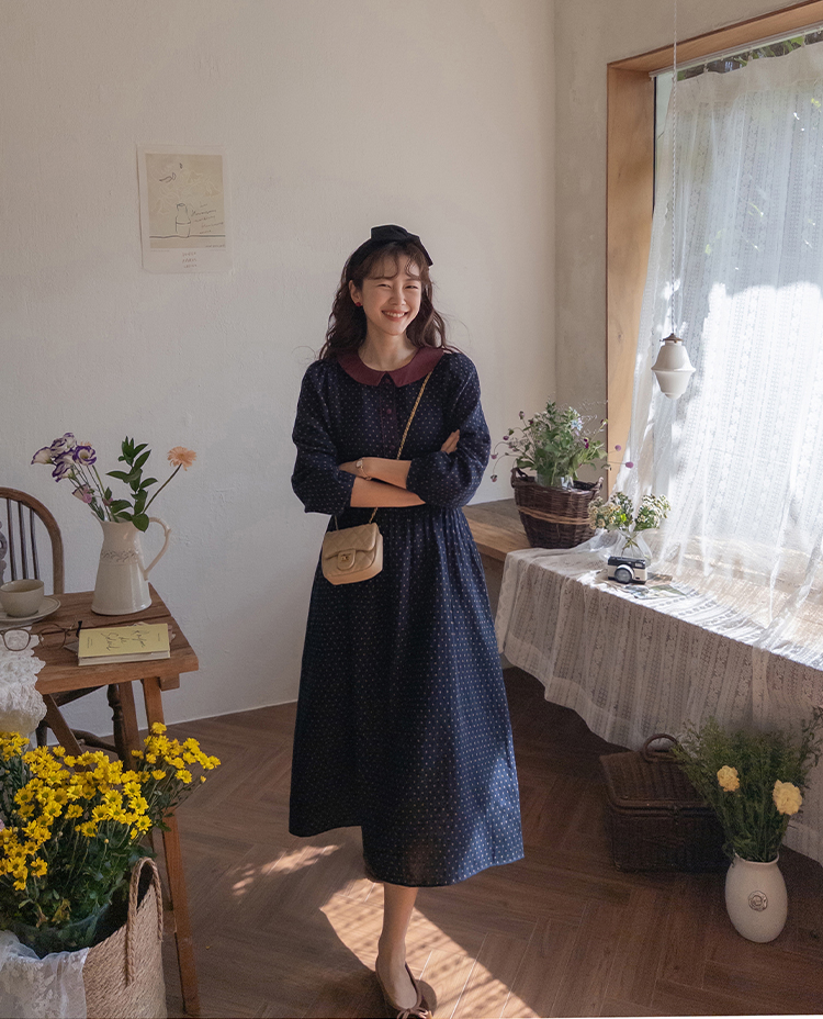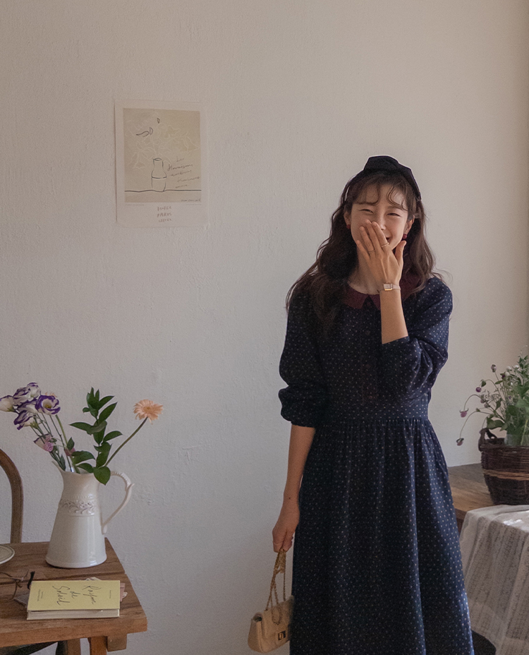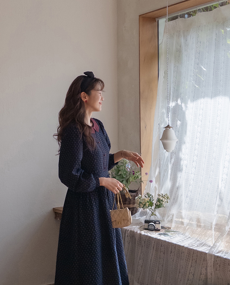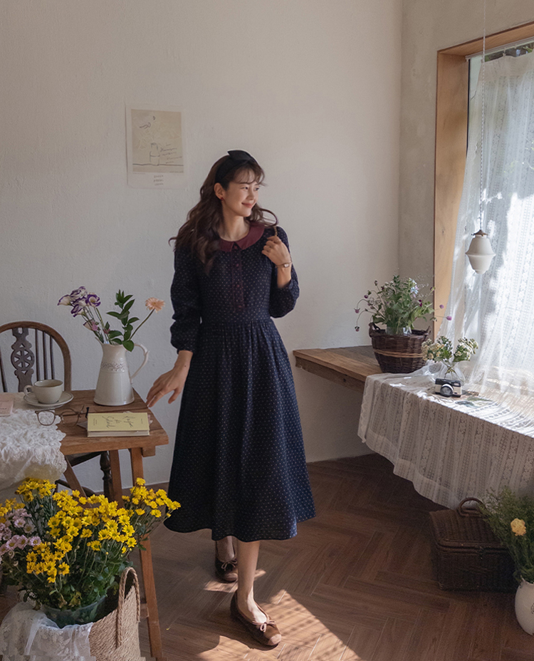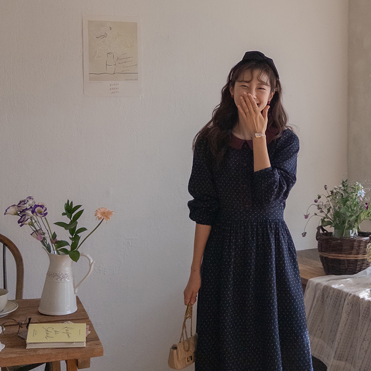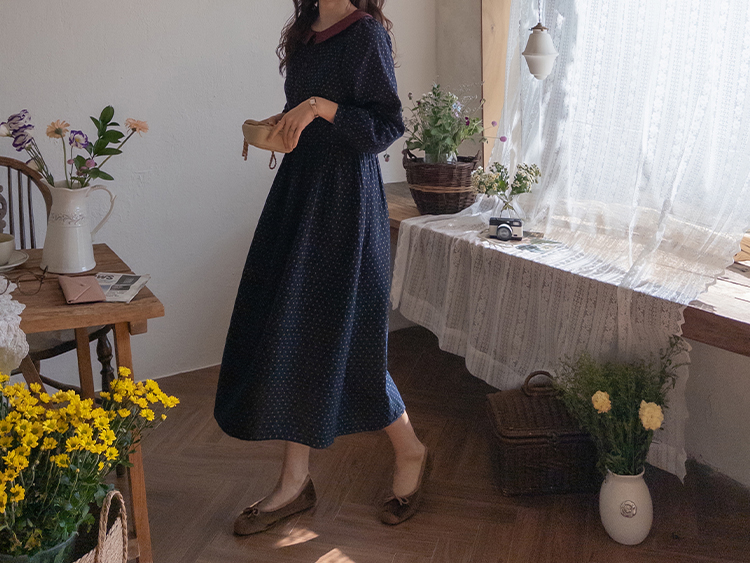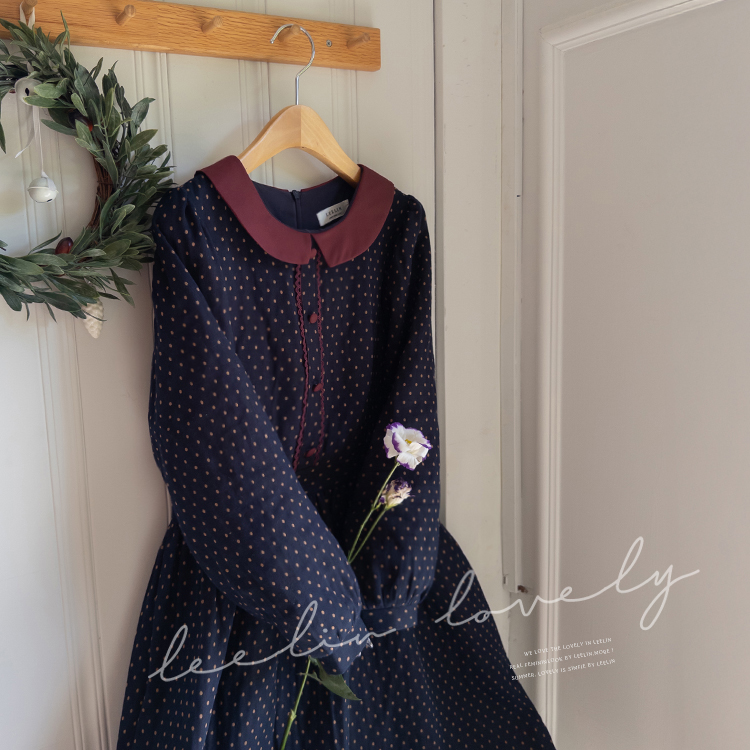 도트 패턴에 배색 카라&레이스 디테일로 리린만의 사랑스러운 감성을 듬뿍 담은 원피스 소개드려요~! 편하면서도 예쁜 스타일링으로는 원피스만한게 없죠 ㅎㅎ 가을시즌에도 원피스 코디는 빼놓을 수 없는데요~ 오늘 보여드리는 요 원피스는 롱한 길이감에 여성스러운 실루엣과 디자인으로 아마 리린 고객님들이라면 정말 좋아해주시지 않을까 싶어요>< 전체적으로 도트 원단에 컬러감도 가을무드가 물씬 느껴져 무드있는 디자인이구요 카라부분과 버튼&레이스는 배색으로 디테일을 넣어주어서 은근한 포인트가 된답니다! 여유있는 실루엣에 롱한 길이감으로 체형을 자연스레 커버하는건 물론, 아방하고 여성스러운 무드라 편하면서도 예쁘게 착용되실거에요-♡ 스커트 부분은 플레어로 퍼지는 디자인으로 풍성한 훌라인까지 더해져 고급미까지 살짝쿵 더해주었어요~ 컬러감부터 디자인까지 무엇하나 빠짐없이 예쁜 아이라 소장하시면 데일리&데이트룩 등으로 다양하게 즐겨주세요!