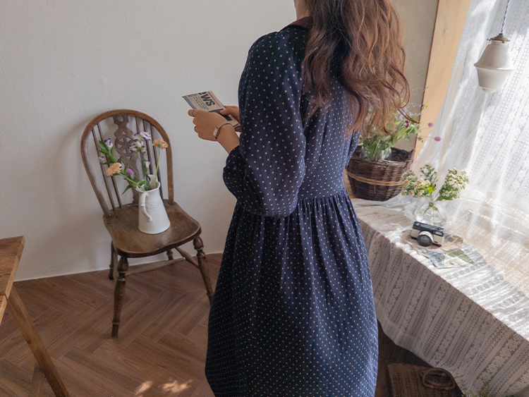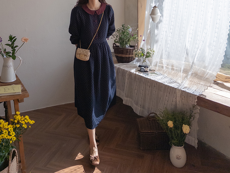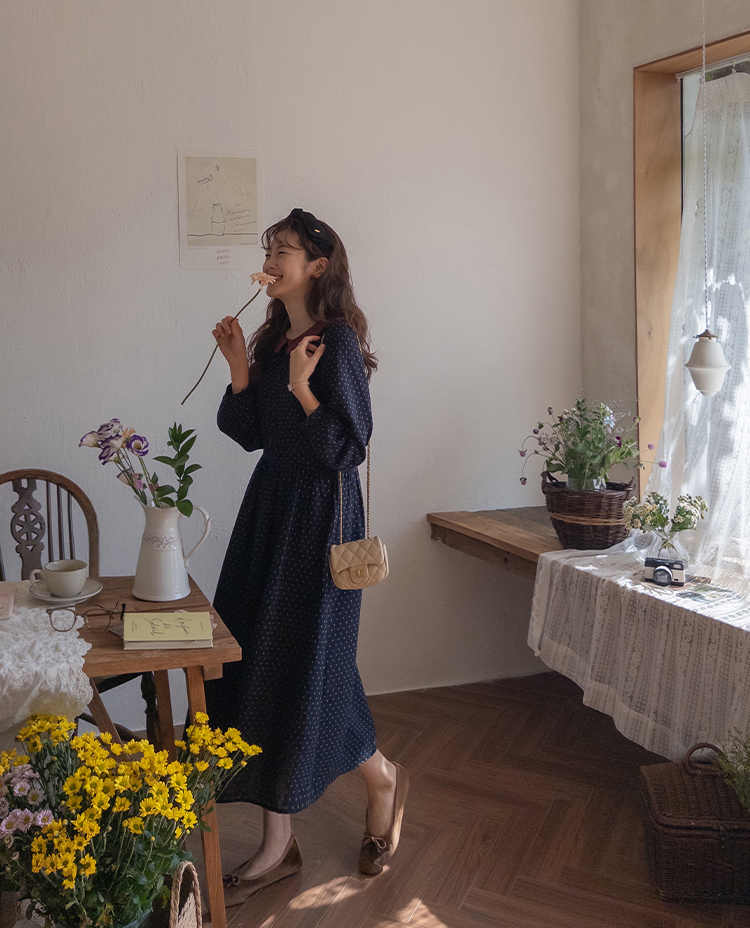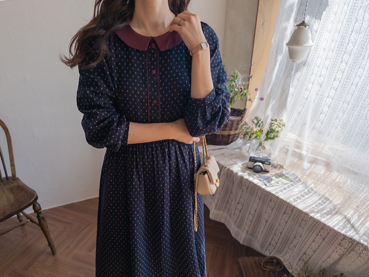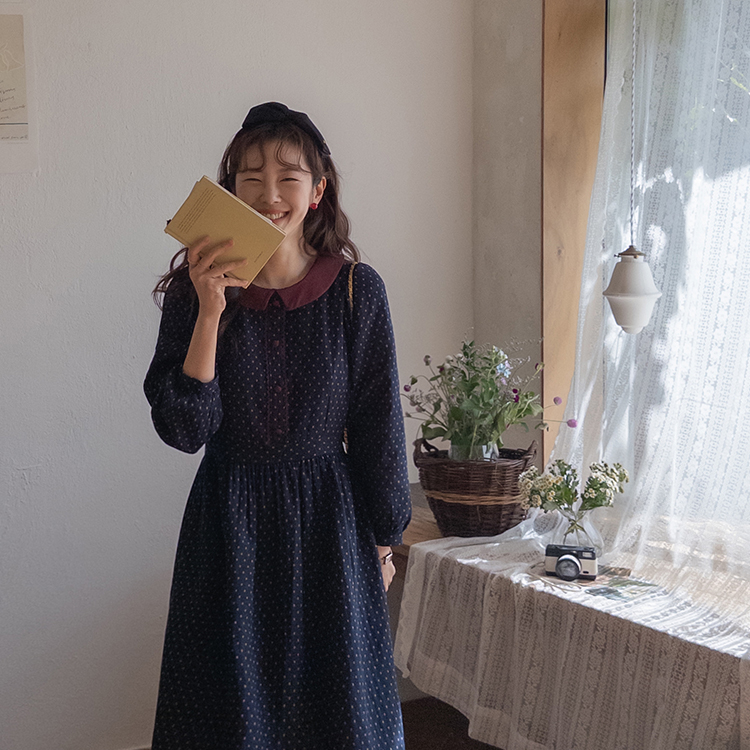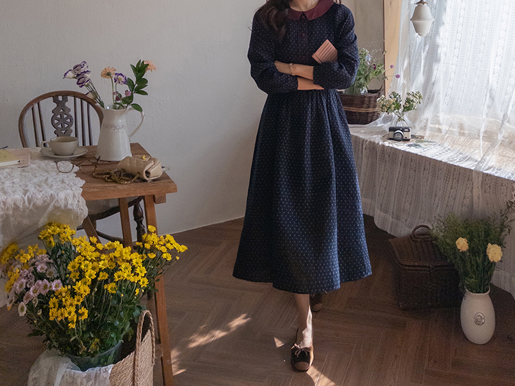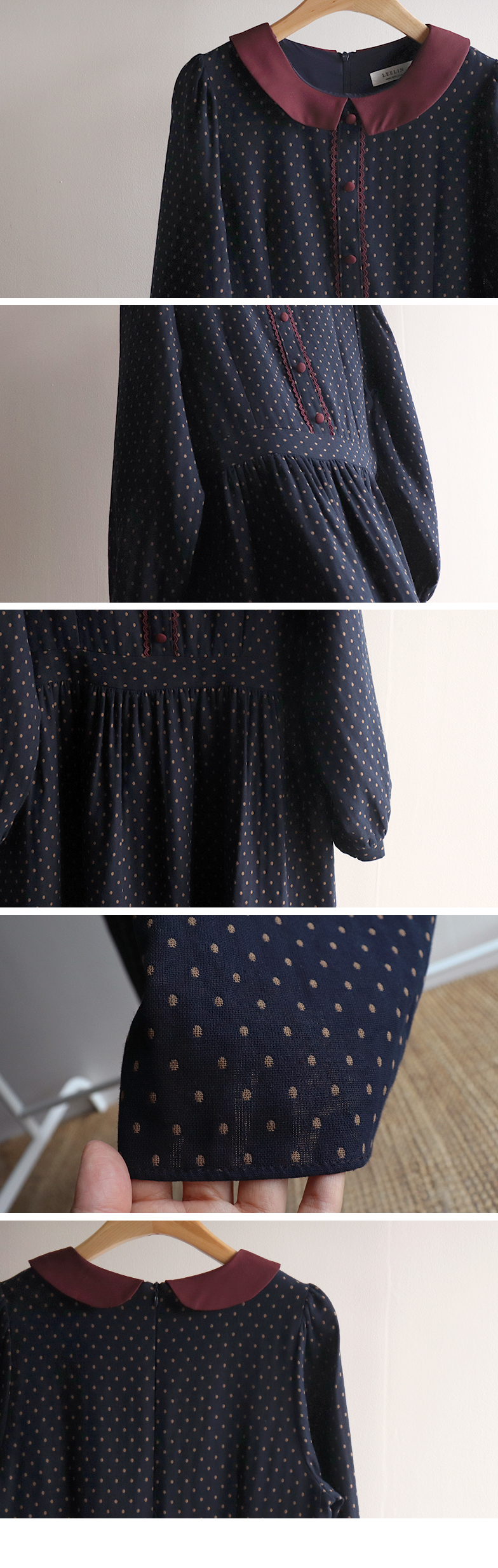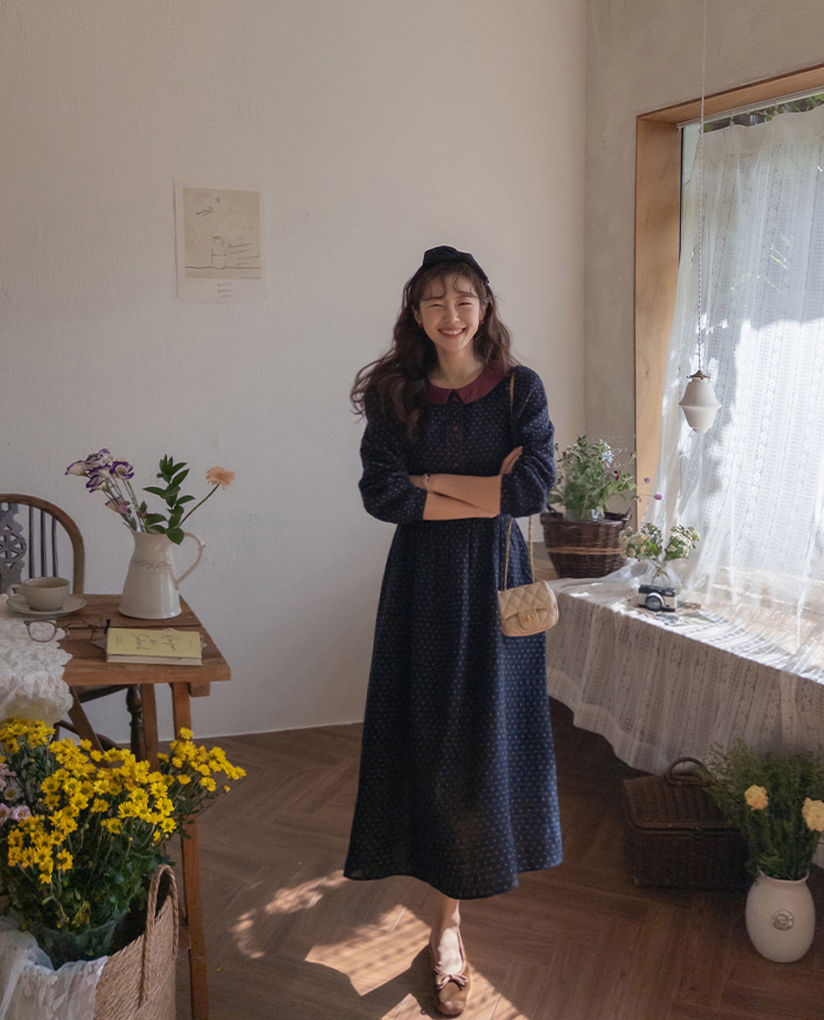 도트 패턴에 배색 카라&레이스 디테일로 리린만의 사랑스러운 감성을 듬뿍 담은 원피스 소개드려요~! 편하면서도 예쁜 스타일링으로는 원피스만한게 없죠 ㅎㅎ 가을시즌에도 원피스 코디는 빼놓을 수 없는데요~ 오늘 보여드리는 요 원피스는 롱한 길이감에 여성스러운 실루엣과 디자인으로 아마 리린 고객님들이라면 정말 좋아해주시지 않을까 싶어요>< 전체적으로 도트 원단에 컬러감도 가을무드가 물씬 느껴져 무드있는 디자인이구요 카라부분과 버튼&레이스는 배색으로 디테일을 넣어주어서 은근한 포인트가 된답니다! 여유있는 실루엣에 롱한 길이감으로 체형을 자연스레 커버하는건 물론, 아방하고 여성스러운 무드라 편하면서도 예쁘게 착용되실거에요-♡ 스커트 부분은 플레어로 퍼지는 디자인으로 풍성한 훌라인까지 더해져 고급미까지 살짝쿵 더해주었어요~ 컬러감부터 디자인까지 무엇하나 빠짐없이 예쁜 아이라 소장하시면 데일리&데이트룩 등으로 다양하게 즐겨주세요!