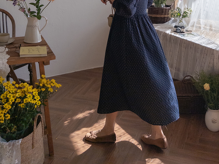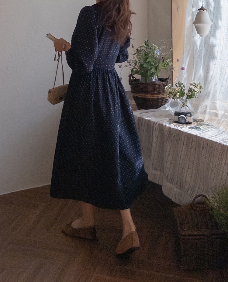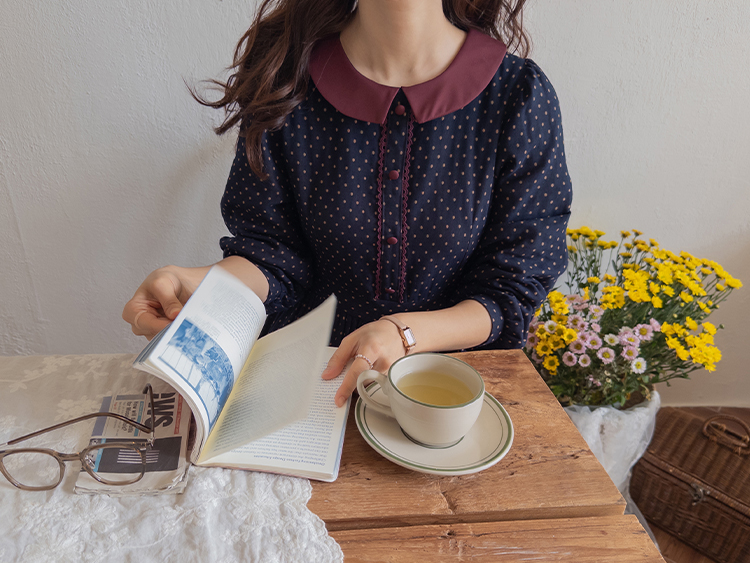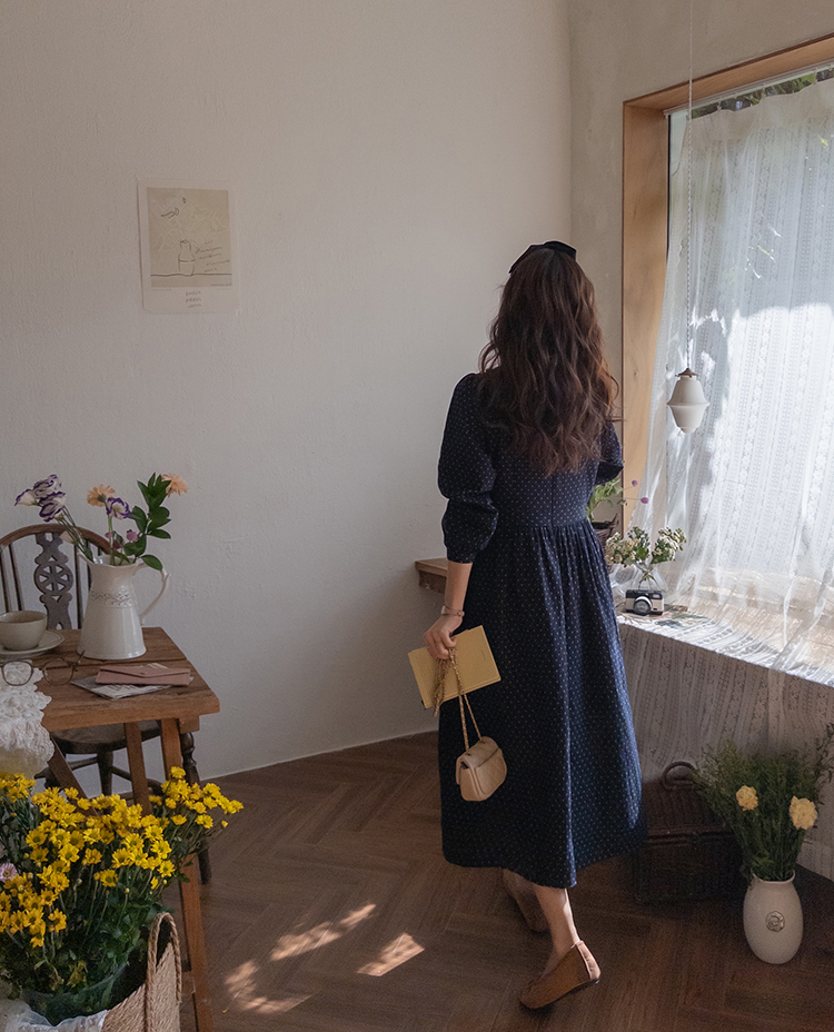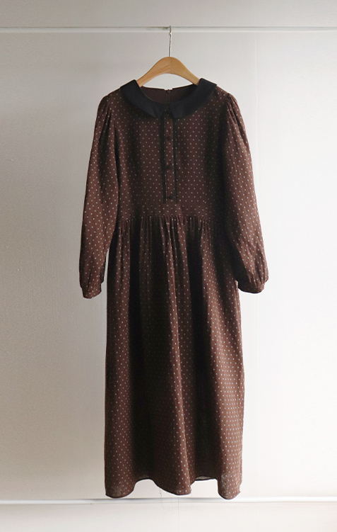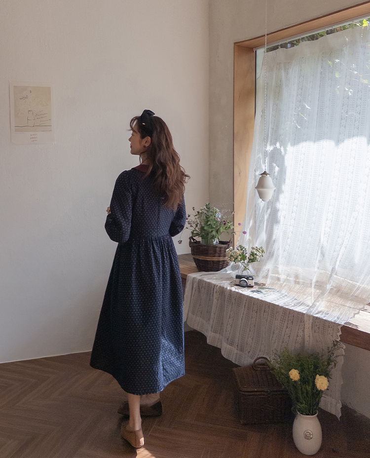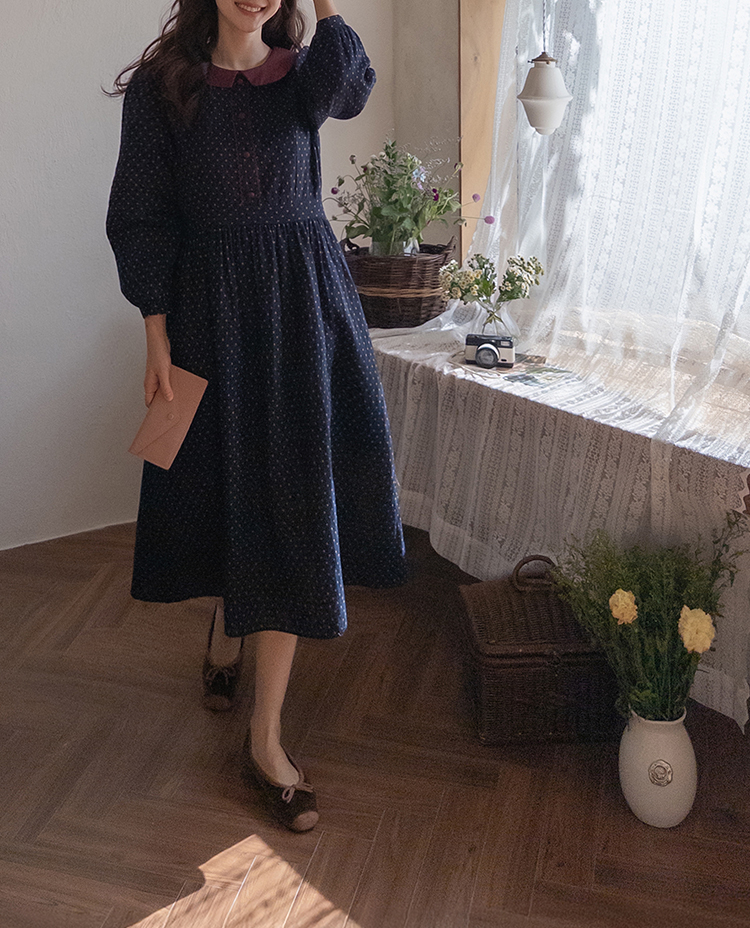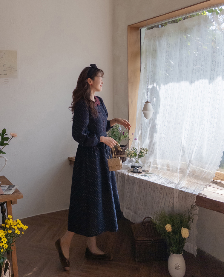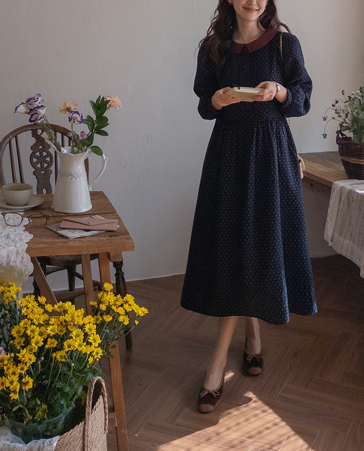 도트 패턴에 배색 카라&레이스 디테일로 리린만의 사랑스러운 감성을 듬뿍 담은 원피스 소개드려요~! 편하면서도 예쁜 스타일링으로는 원피스만한게 없죠 ㅎㅎ 가을시즌에도 원피스 코디는 빼놓을 수 없는데요~ 오늘 보여드리는 요 원피스는 롱한 길이감에 여성스러운 실루엣과 디자인으로 아마 리린 고객님들이라면 정말 좋아해주시지 않을까 싶어요>< 전체적으로 도트 원단에 컬러감도 가을무드가 물씬 느껴져 무드있는 디자인이구요 카라부분과 버튼&레이스는 배색으로 디테일을 넣어주어서 은근한 포인트가 된답니다! 여유있는 실루엣에 롱한 길이감으로 체형을 자연스레 커버하는건 물론, 아방하고 여성스러운 무드라 편하면서도 예쁘게 착용되실거에요-♡ 스커트 부분은 플레어로 퍼지는 디자인으로 풍성한 훌라인까지 더해져 고급미까지 살짝쿵 더해주었어요~ 컬러감부터 디자인까지 무엇하나 빠짐없이 예쁜 아이라 소장하시면 데일리&데이트룩 등으로 다양하게 즐겨주세요!