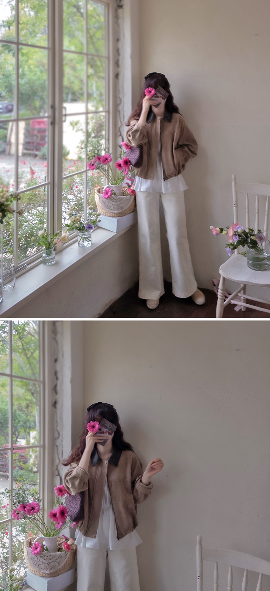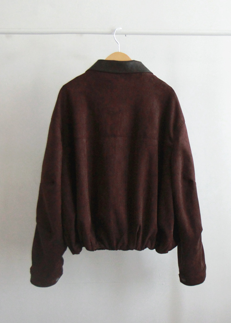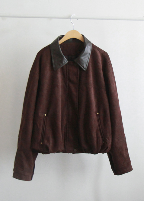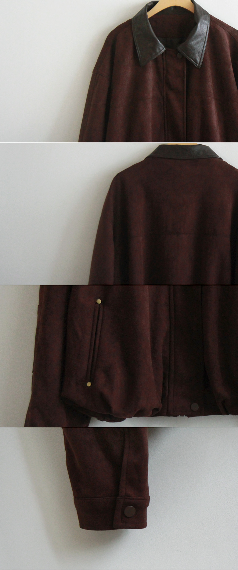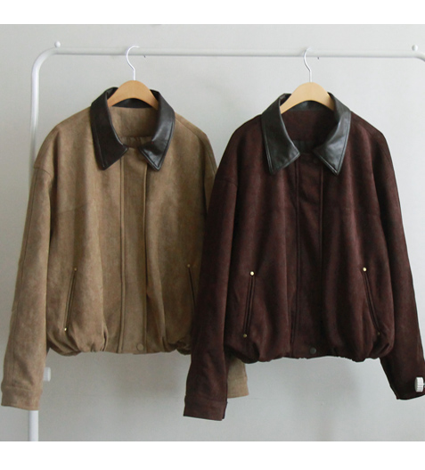 [Flexible, soft, and stretchy Suede Outer] [Lovely leather color-block collar is the focal point] [Jacket that is good to wear all season long with its matte fit] [Partial band treatment at the bottom creates a sophisticated look] [Simple, lively pocket design] [Easy zip-up design]