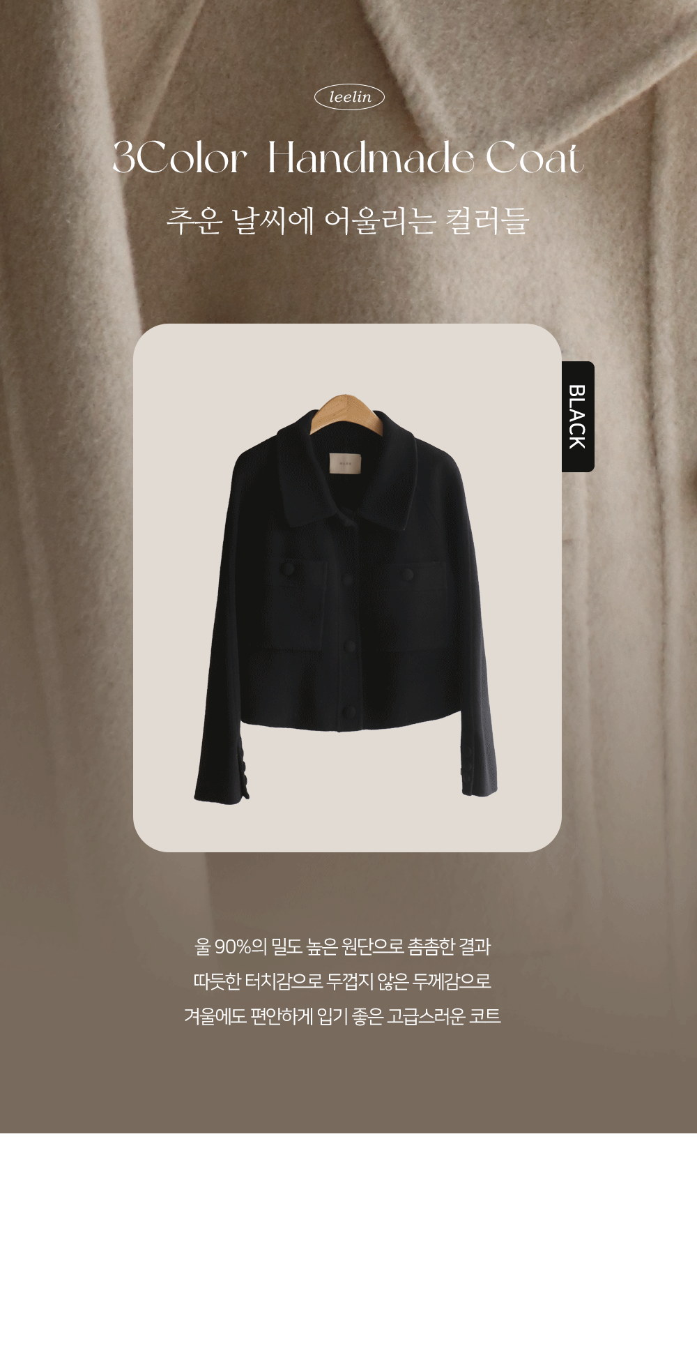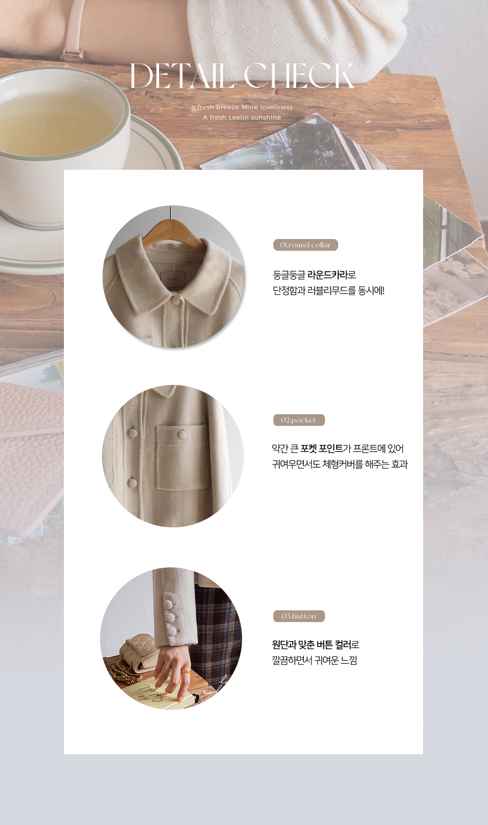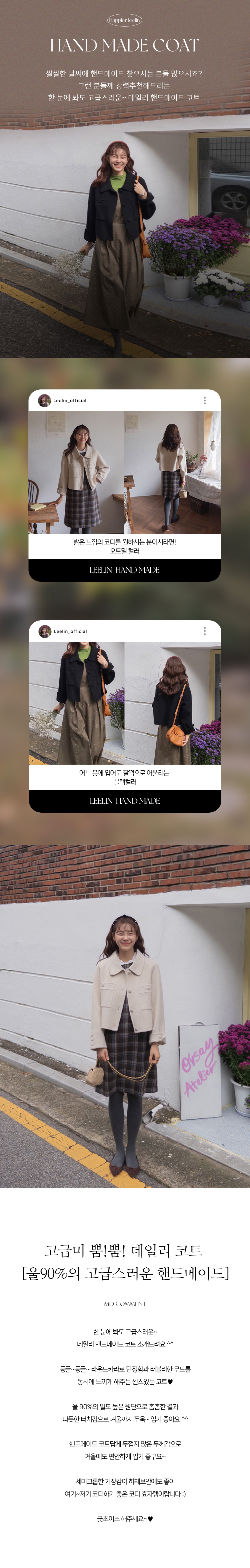 한 눈에 봐도 고급스러운~ 데일리 핸드메이드 코트 소개드려요 ^^ 둥글~둥글~ 라운드카라로 단정함과 러블리한 무드를 동시에 느끼게 해주는 센스있는 코트♥ 울 90%의 밀도 높은 원단으로 촘촘한 결과 따듯한 터치감으로 겨울까지 쭈욱~ 입기 좋아요 ^^ 핸드메이드 코트답게 두껍지 않은 두께감으로 겨울에도 편안하게 입기 좋구요~ 세미크롭한 기장감이 하체보안에도 좋아 여기~저기 코디하기 좋은 코디 효자템이랍니다 :) 굿초이스 해주세요~♥