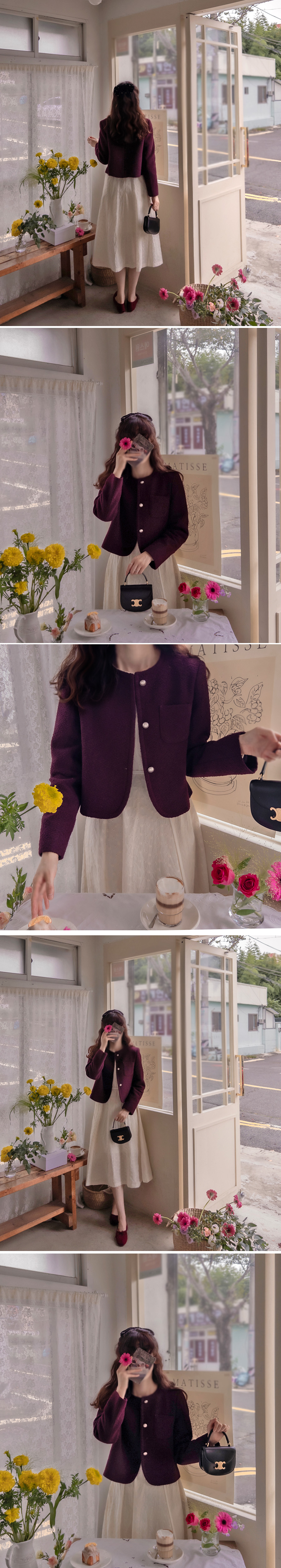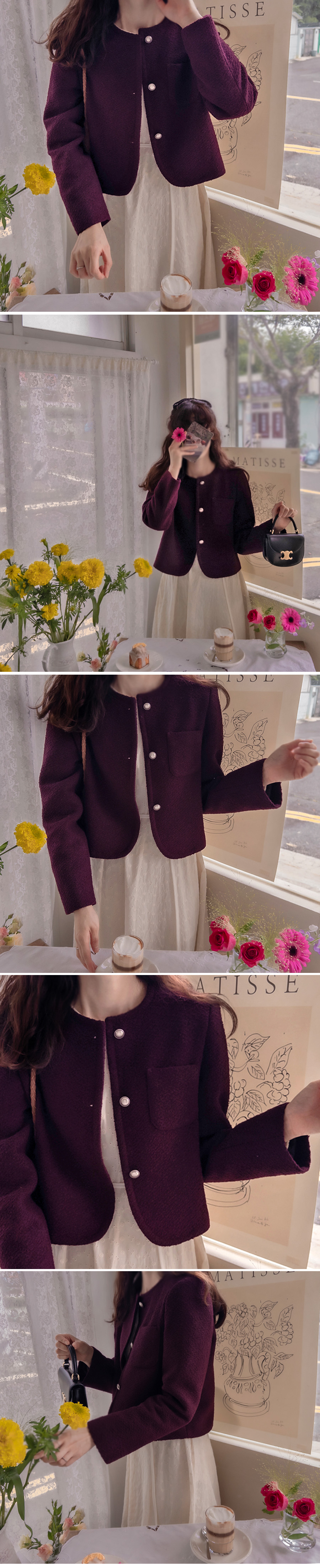 [Chic Outerwear with a sophisticated feel] [Seasonable and stylish jacket] [A jacket with vibrant colors adds sophistication when coordinated] [Delicate Tweed fabric with a three-dimensional feel creates a stylish mood] [Buttons are also a focal point]