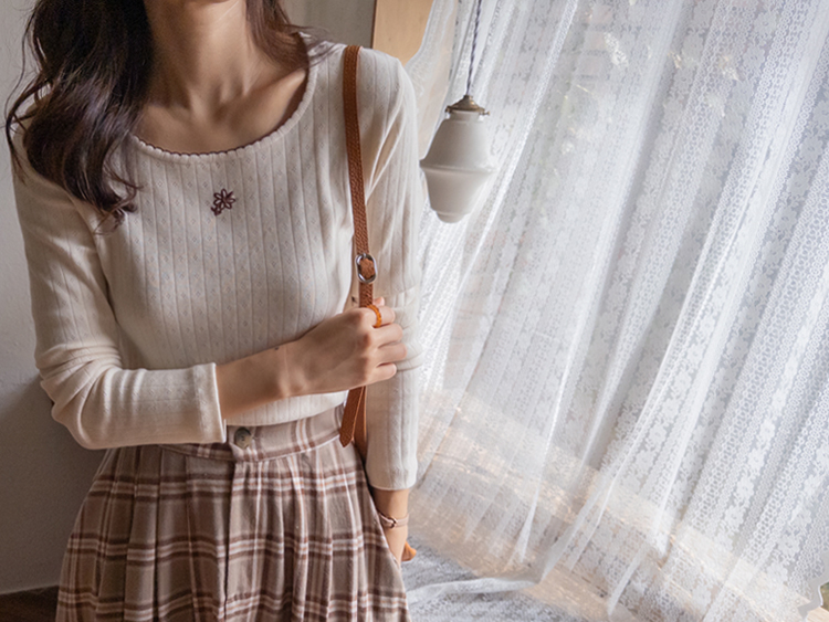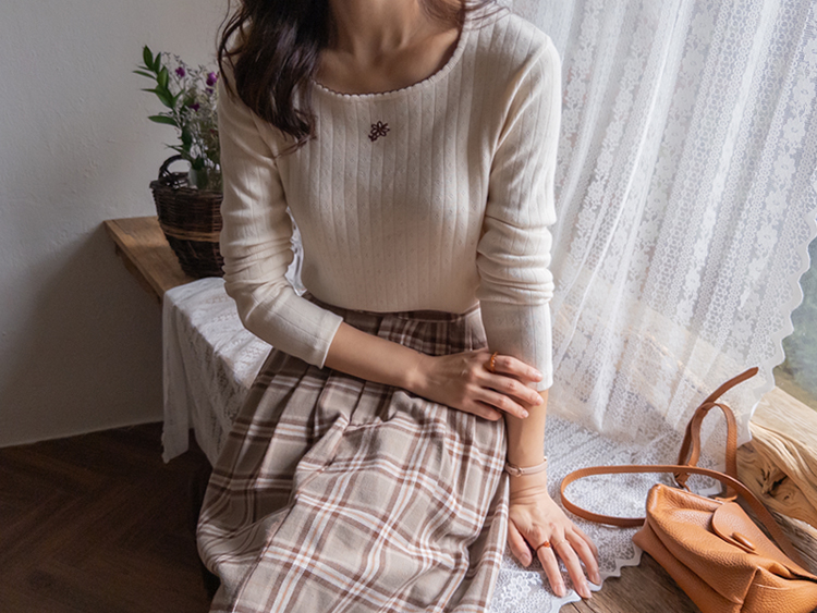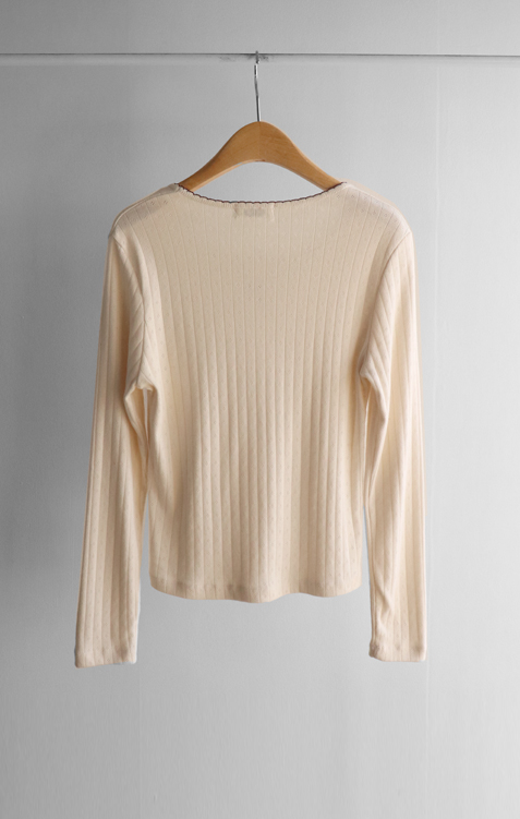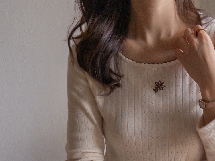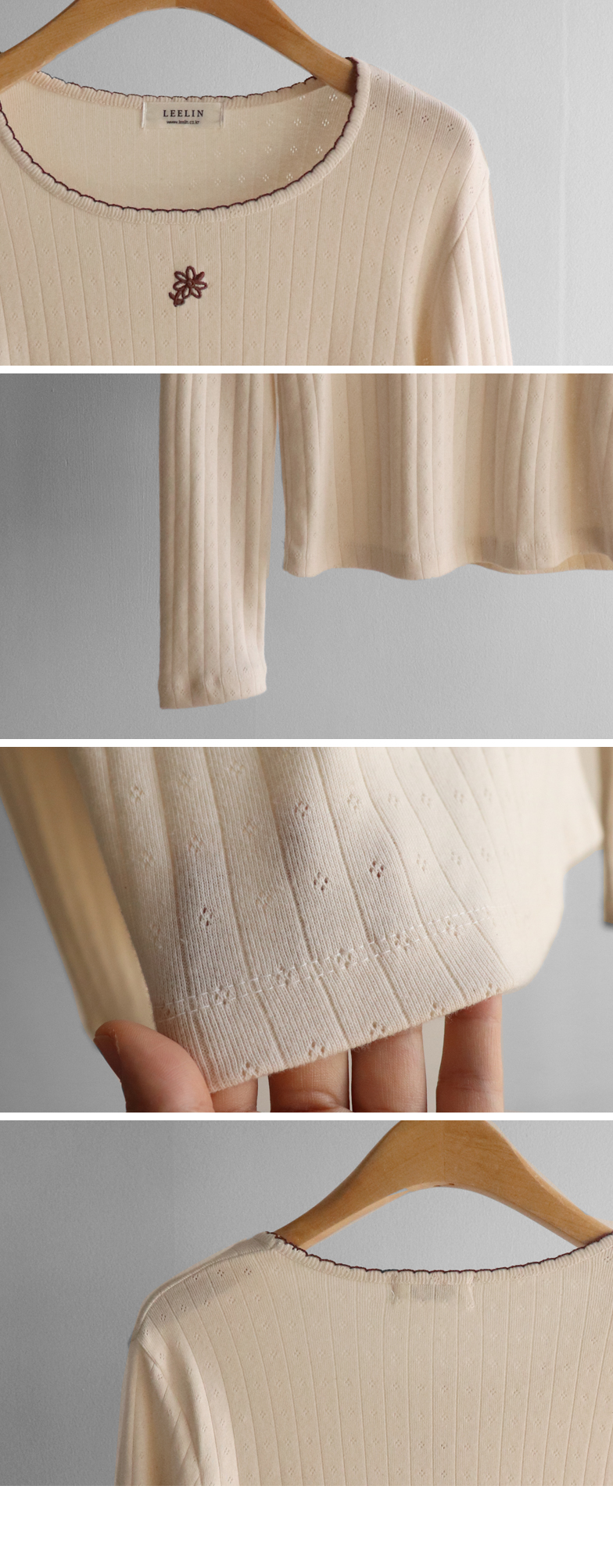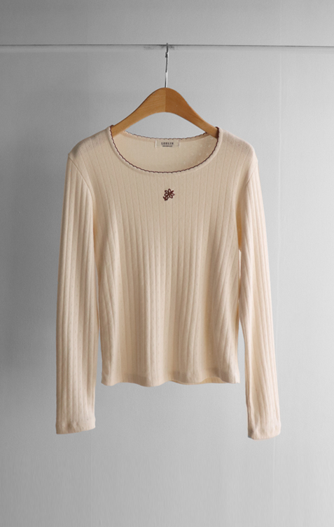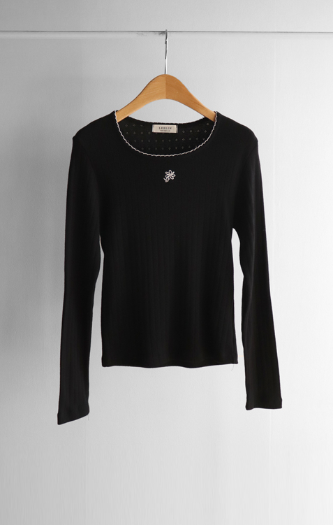 짱짱~하게 늘어나는 신축성 좋은 펀칭 원단에 넥부분 배색 트리밍으로 포인트를 주어 기본인듯~ 디테일을 살려준 티셔츠 보여드릴게요~! 요런 긴팔 티셔츠는 하나 소장하시면 시즌리스하게 단독&이너로 활용도 높게 입기 좋은 아이템인데요ㅎㅎ 미니멀한 펀칭이 들어가 있어서 은근한 사랑스러움이 느껴지는 골지 원단에 세로결 골지 라인으로 상체라인이 전체적으로 늘씬해 보이는 효과까지 있답니다~ 게다가 요 아이의 포인트! 바로 넥 배색 디테일인데요~ 넥라인에 물결 쉐입으로 트리밍을 더해주었구요 넥 아래부분에 플라워 자수를 더해주어서 밋밋하지 않고 포인트가 되도록 만들어 주었어요*.* 스탠다드한 실루엣으로 데일리 티셔츠로도 좋구요 기본 티셔츠처럼 매일 입기 좋지만 무언가 포인트가 있는 아이 찾으셨다면 강추! 컬러도 크림, 블랙 두가지로 보여드리니 취향에 따라 초이스 해주셔서 예쁘게 즐겨주세요~♡