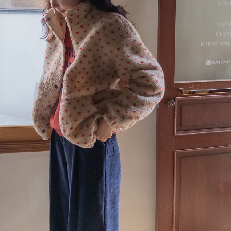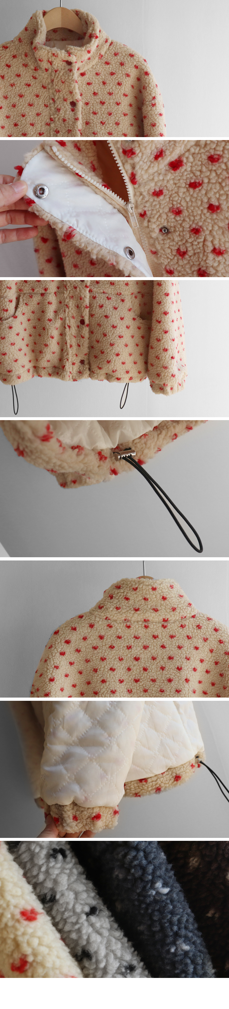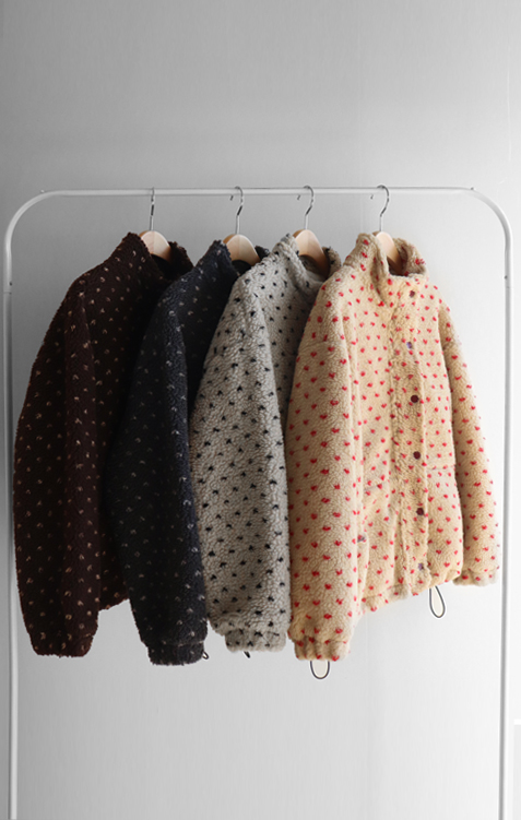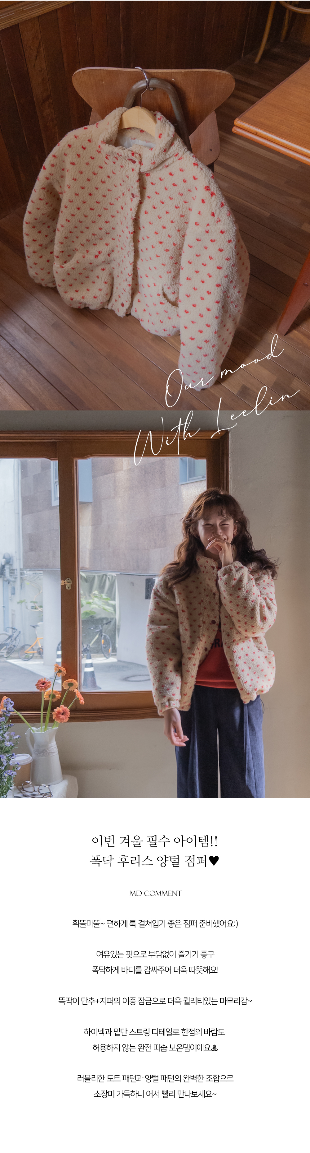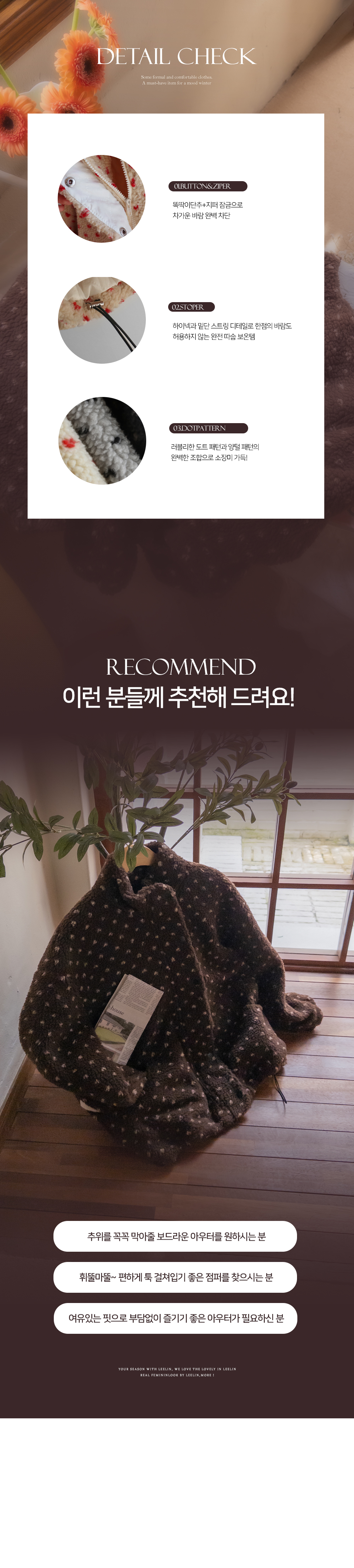 휘뚤마뚤~ 편하게 툭 걸쳐입기 좋은 점퍼 준비했어요:) 여유있는 핏으로 부담없이 즐기기 좋구 폭닥하게 바디를 감싸주어 더욱 따뜻해요! 똑딱이 단추+지퍼의 이중 잠금으로 더욱 퀄리티있는 마무리감~ 하이넥과 밑단 스트링 디테일로 한점의 바람도 허용하지 않는 완전 따숩 보온템이에요♨ 러블리한 도트 패턴과 양털 패턴의 완벽한 조합으로 소장미 가득하니 어서 빨리 만나보세요~