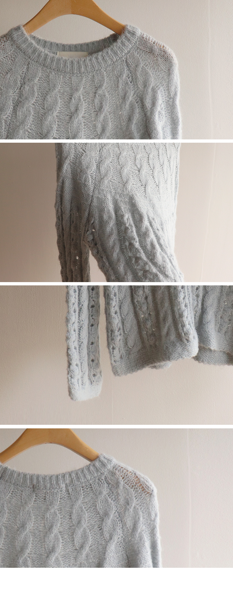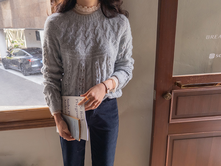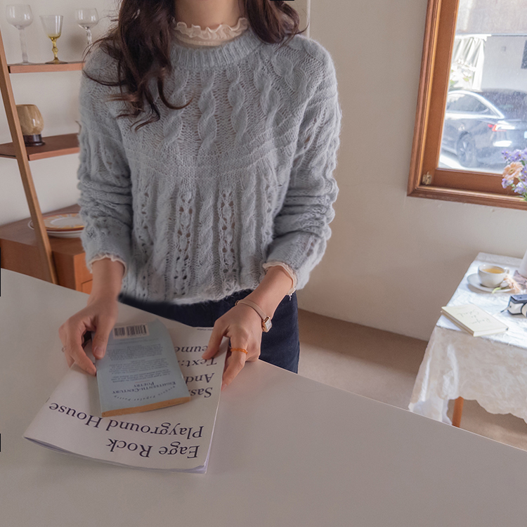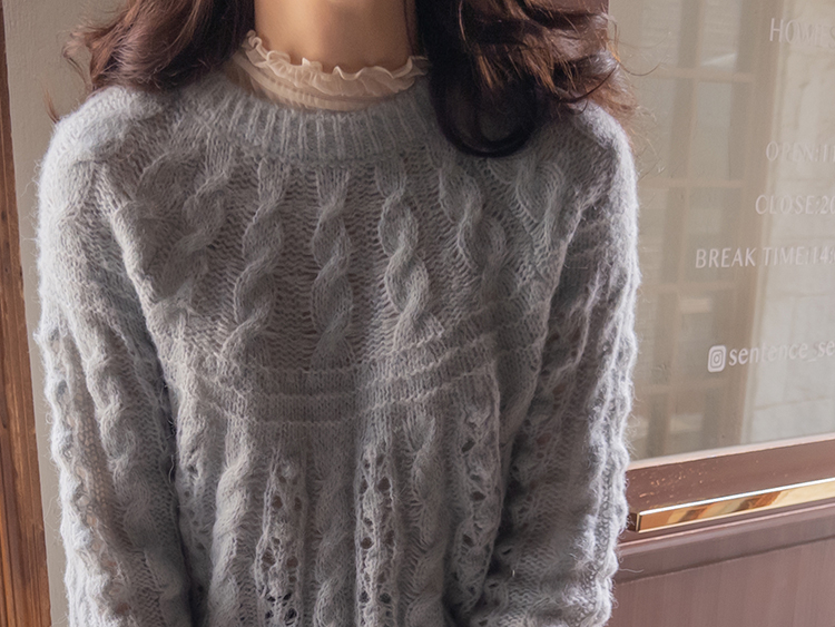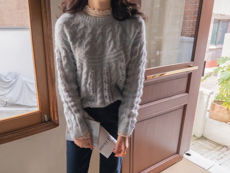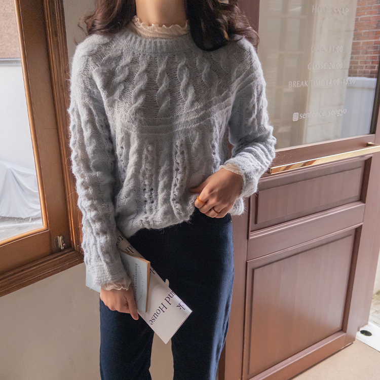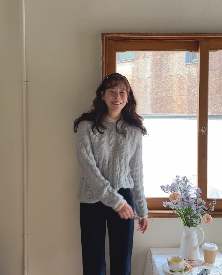 포근한 무드가 잔~뜩 느껴지는 케이블 짜임의 은은한 니트 보여 드려요~! 헤어리한 소재감으로 피부에 닿았을 때 너무 부드럽고 따뜻한 니트랍니다ㅎ.ㅎ 아방한 핏에 케이블 짜임 속 은은하게 비치는 펀칭 디테일로 여리~여리한 실루엣 완성~ 단독은 물론 티,셔츠등 레이어드하기 좋고, 리린 감성이 듬~뿍 단긴 예쁜 니트 꼭 소장하세요♡
