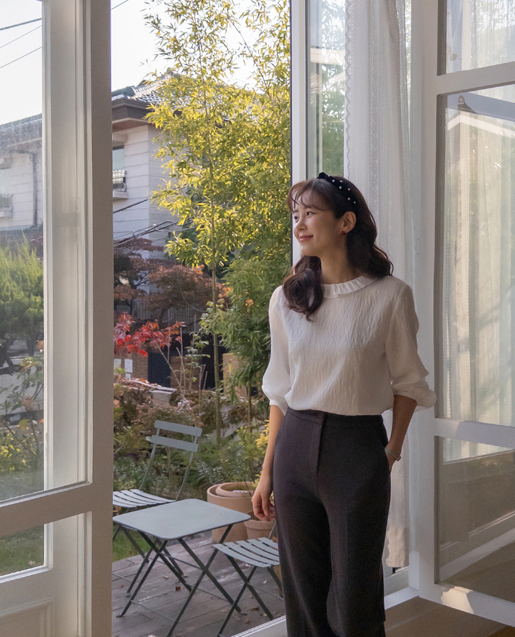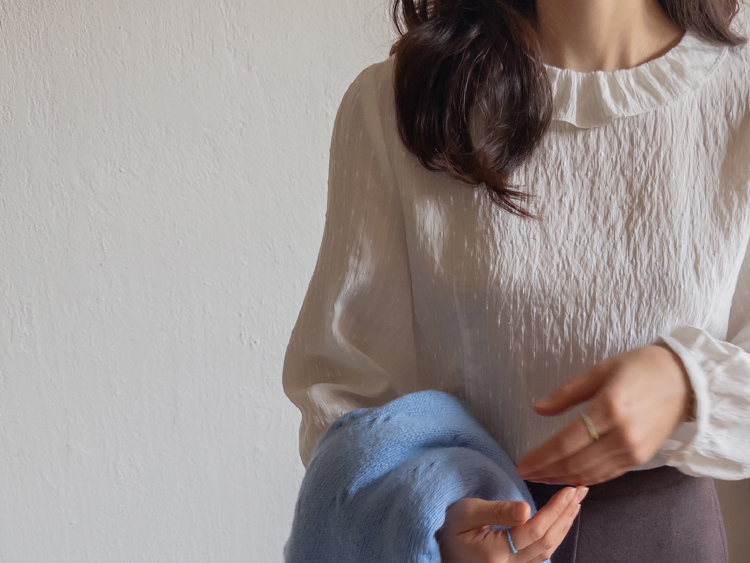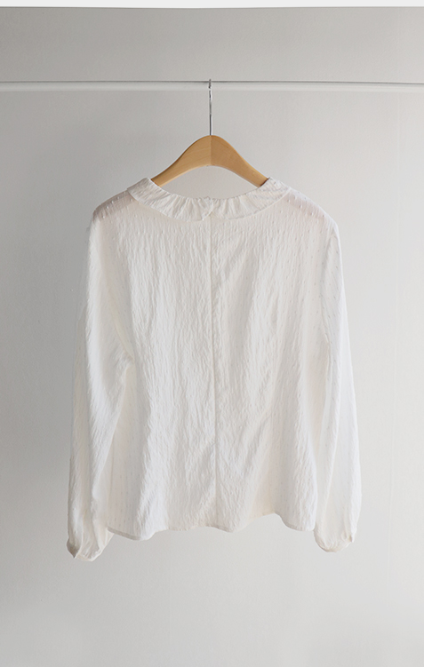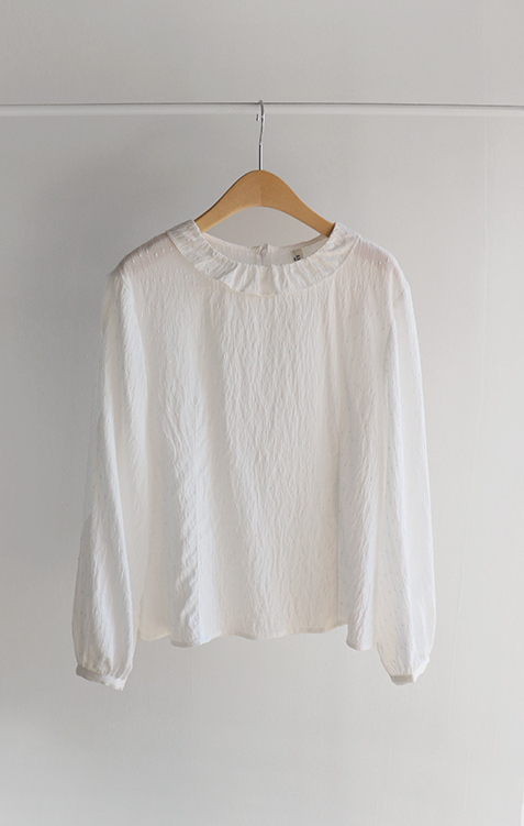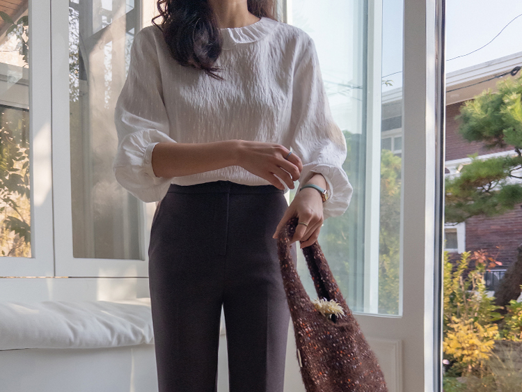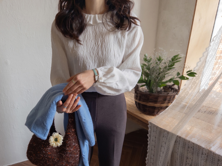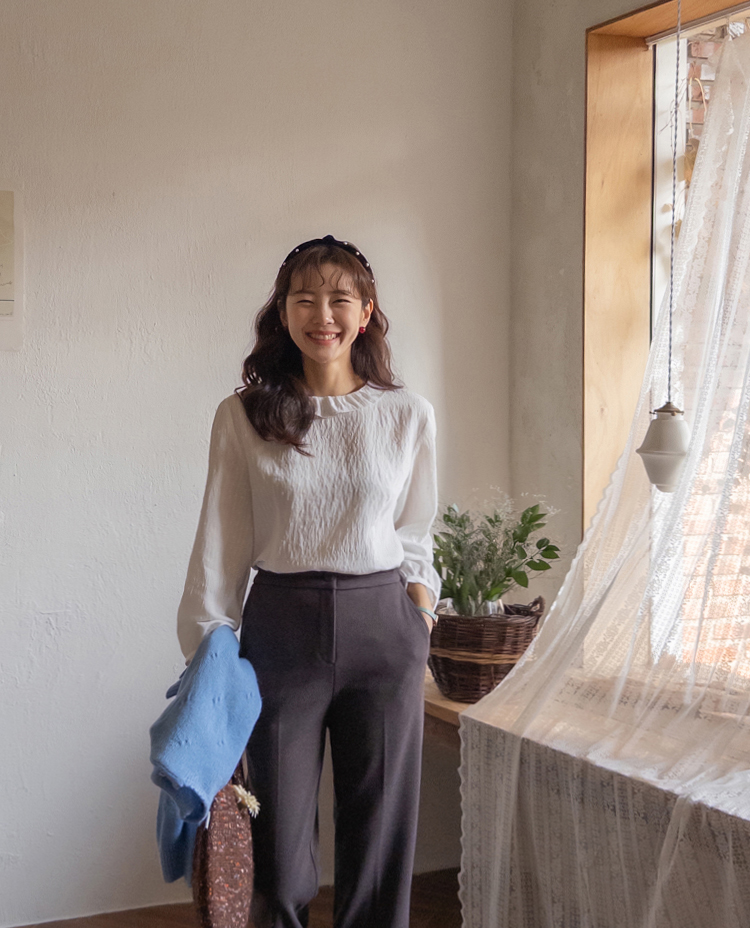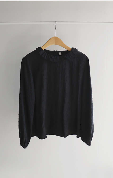 청순 여리함 가득..♡ 보기만 해도 사랑스러운 무드의 LIN.MADE 블라우스 보여드려요~! FW시즌에도 이너 블라우스는 빼놓을 수 없죠ㅎㅎ 오늘 보여드리는 블라우스는 은은한 세로 결감이 느껴지는 패턴이 더해져서 그 자체로 포인트가 되는 아이에요:) 후들후들~ 찰랑이는 소재로 입는 순간 몸선을 가녀려보이게 만들어주는건 물론이구요 원단으로 포인트를 주어서 디자인 자체는 군더더기 없이 깔끔하게 제작해 주었어요-! 심플한 라운드넥에 프릴을 넣어주어 여성스러운 무드는 살리고 뒷부분 콘솔 지퍼로 깔끔하고 이지한 오픈클로징이 가능해요~ 컬러는 아이, 블랙 두가지로 제작해주어서 어느 룩에나 부담없이 매치할 수 있으니 취향에 따라 초이스하셔서 시즌리스하게 함께해주세요-♡
