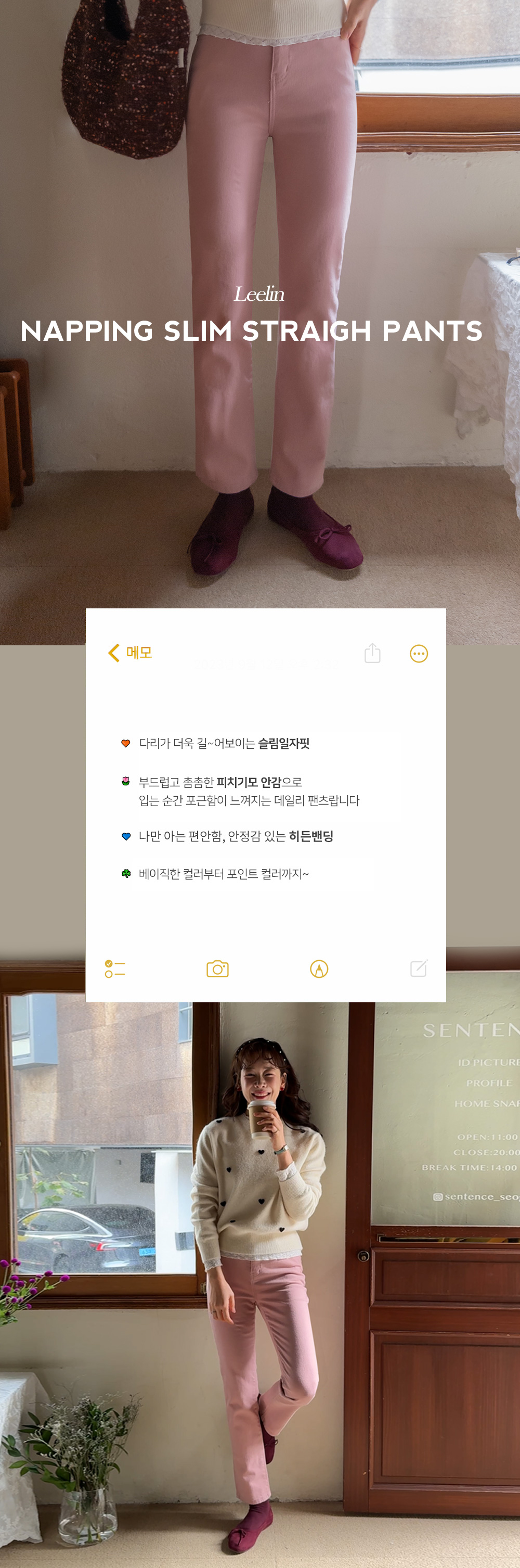 부드럽고 촘촘한 피치기모 안감으로 입는 순간 포근함이 느껴지는 데일리 팬츠랍니다♡ 쫀쫀하게 늘어나는 사방 스판 소재로 움직임이 많은 날에도 편안하게~!! 과하지 않은 슬림 일자핏이라 다리가 길~고 늘~씬해보이는 인생핏 팬츠!! 꽉 조이지않구요 라인을 부드럽게 잡아줘 다리 실루엣이 예뻐보여요!! 베이직한 컬러부터 포인트 컬러까지~ 어떤 상의와도 잘 어울려 하나쯤 소장하시면 데일리룩에 딱이에요♡