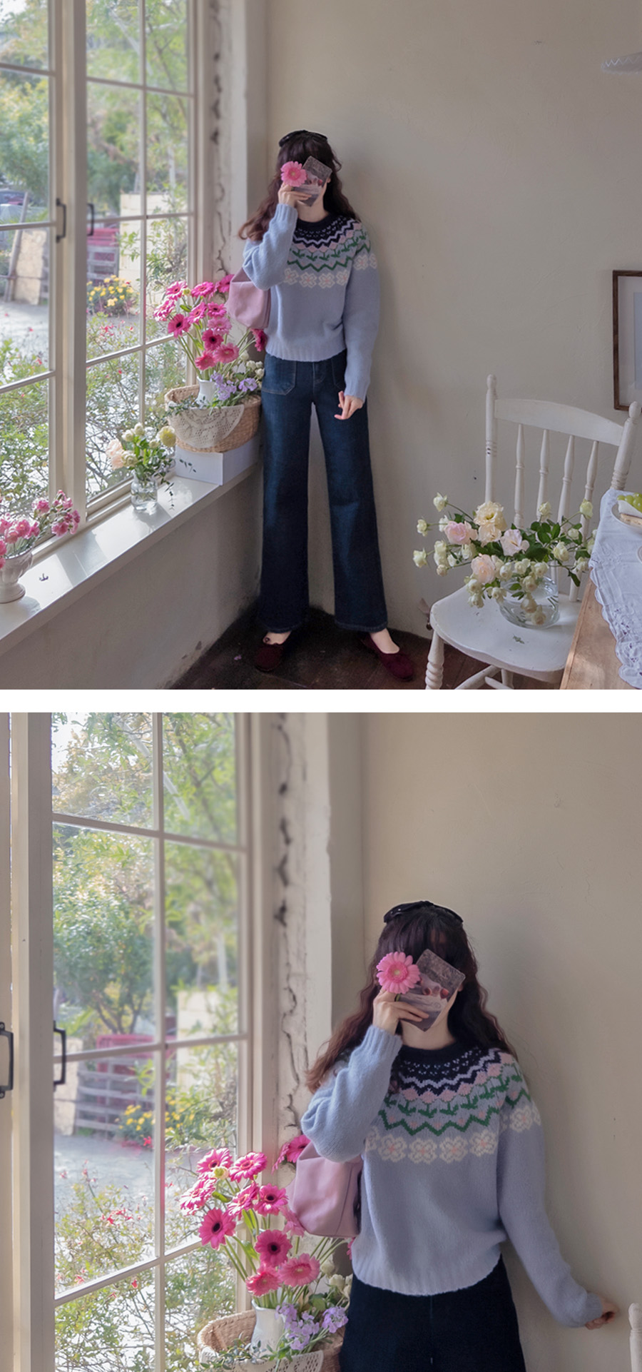 도톰한 두께감으로 단독으로 입어도 포근하게~ 보온성을 챙겨준 울니트에요 :) 자가드느낌의 다양한 패턴과 사랑스러운 플라워 패턴 포인트,,! 귀여운 컬러조합으로 단품만으로도 포인트되며, 은은한 스카이블루 컬러와 베이비핑크 포인트패턴으로 보자마자 반해서 바잉해온 제품이에요~ 바디를 폭닥하게 감싸주는 루즈핏으로 여리여리하면서도 포근하게 입어져요~ 도톰한 넥라인으로 늘어짐없어 깔끔한 아웃핏을 연출해주며 아크릴,울혼방 소재로 포근한 착용감이 느껴지는 니트에요 유연한 짜임과 골반라인을 살짝 덮어주는 기장이라 하이웨스트 하의들과 매치하기 좋구요~ 과하지않은 플라워패턴으로 사랑스러운 포인트가 되어주는 니트♥ 스커트와 함께 귀엽게 매치해도좋고, 크림색상의 팬츠와 매치해도 사랑스러운 룩을 완성시켜줄 니트라 사심담아 추천드려요*.*