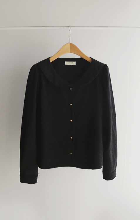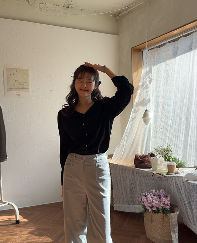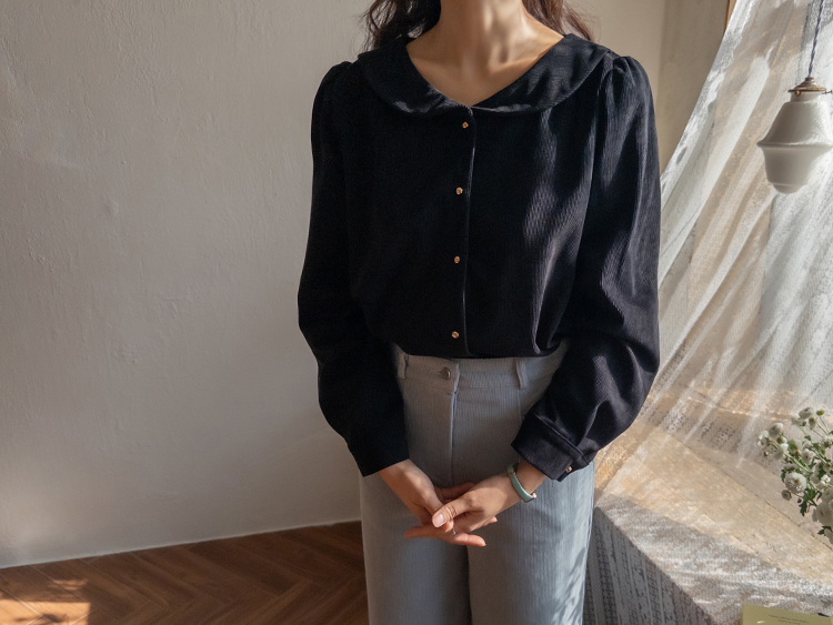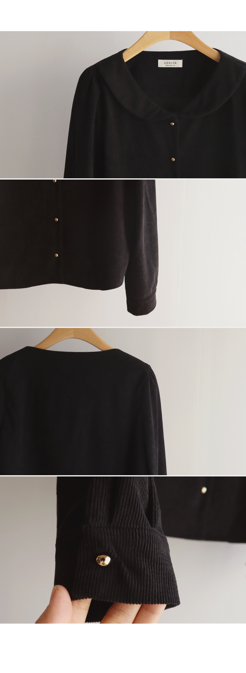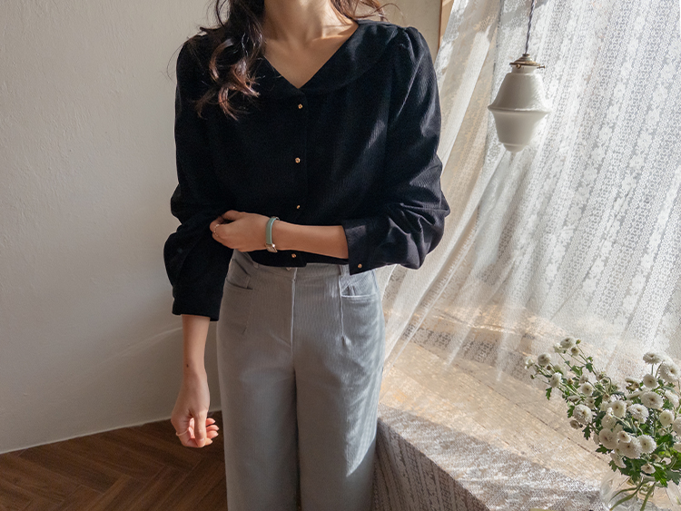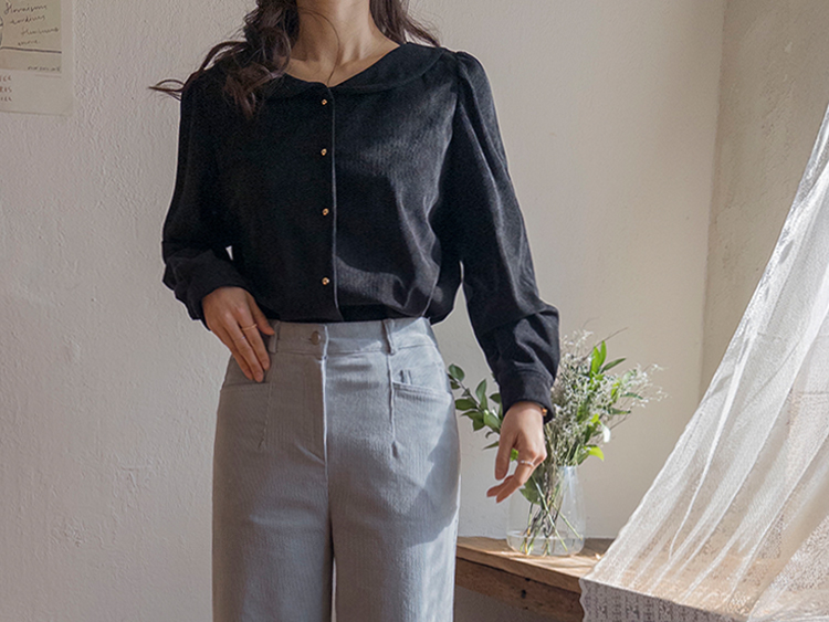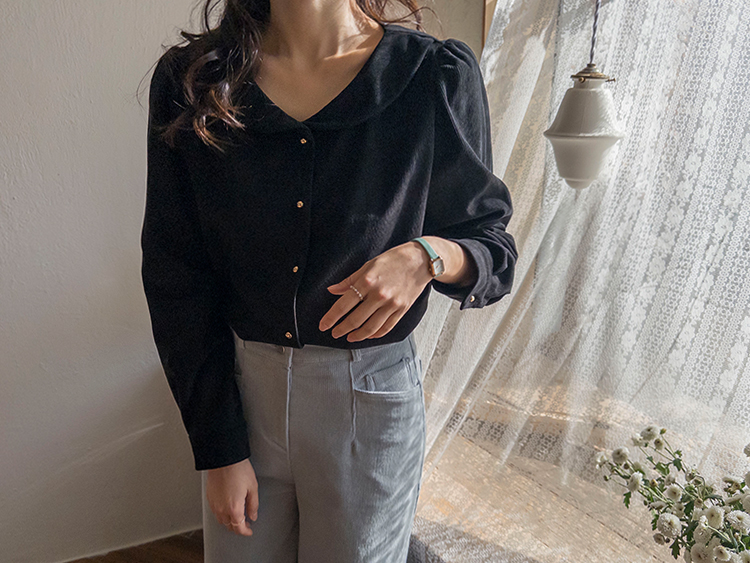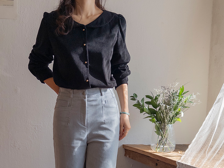 부드런 코듀로이 소재로 단정하면서도 사랑스러운 무드로 착용되는 블라우스 보여드려요~! 요 블라우스, 잔잔한 코듀로이 소재감으로 FW시즌에 정말 딱! 즐기기 좋은 그런 블라우스인데요*.* 쁘띠한 라운드 카라 디테일로 마치 꽃잎이 피어난듯한 카라도 포인트로 넘 예쁘구요 블라우스지만 여유있는 실루엣으로 딱 예쁜 핏으로 연출된답니다ㅎㅎ 버튼은 라운드쉐입의 골드 버튼으로 귀엽게 연출되는건 물론이구요~ 세미크롭한 길이감으로 하의에 넣어입지 않아도 예쁘게 떨어지는 기장이라 다양한 하의템에 매치하기도 좋은 블라우스라 추천드려요~♡