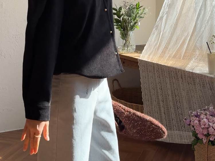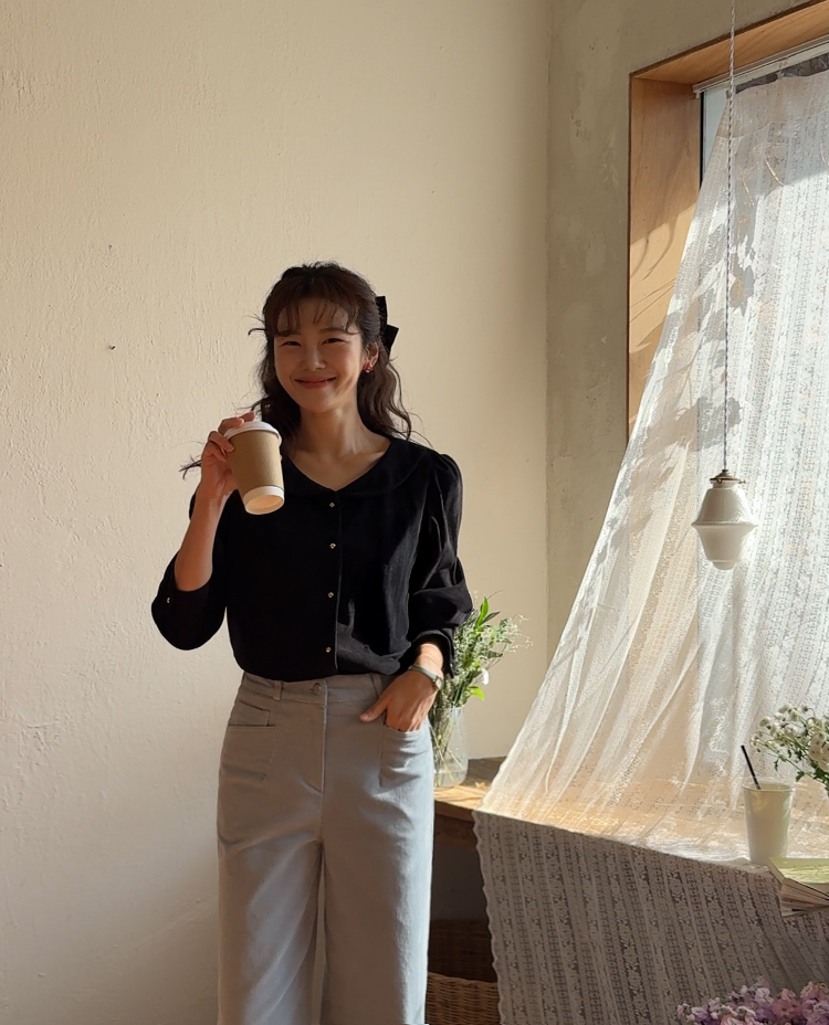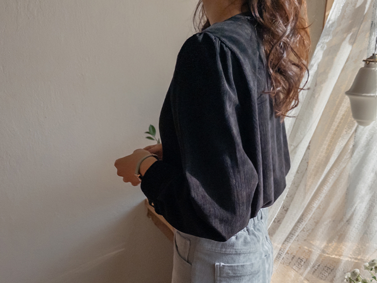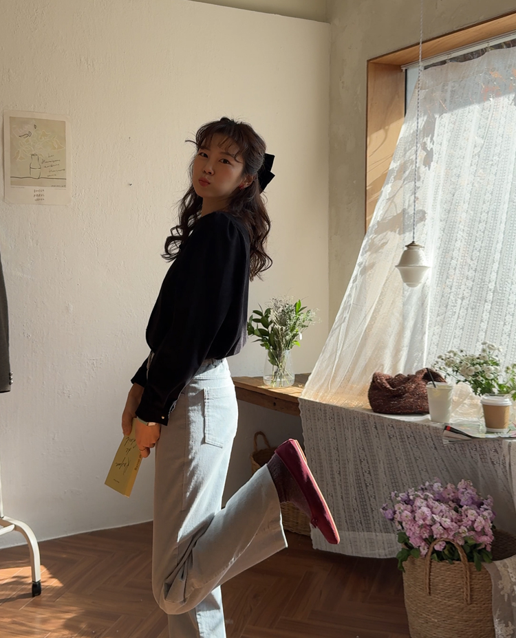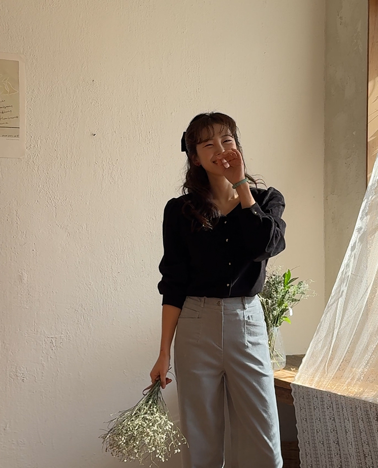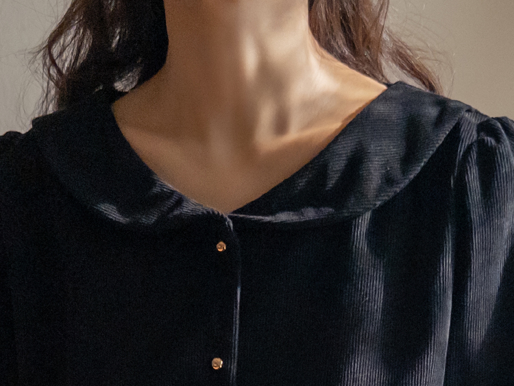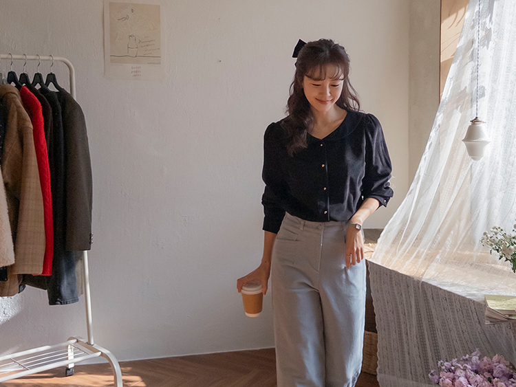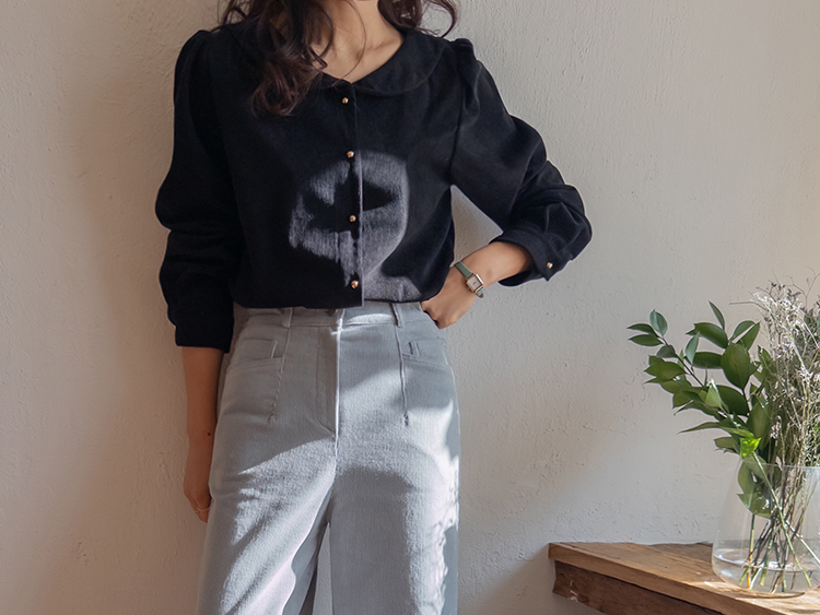 부드런 코듀로이 소재로 단정하면서도 사랑스러운 무드로 착용되는 블라우스 보여드려요~! 요 블라우스, 잔잔한 코듀로이 소재감으로 FW시즌에 정말 딱! 즐기기 좋은 그런 블라우스인데요*.* 쁘띠한 라운드 카라 디테일로 마치 꽃잎이 피어난듯한 카라도 포인트로 넘 예쁘구요 블라우스지만 여유있는 실루엣으로 딱 예쁜 핏으로 연출된답니다ㅎㅎ 버튼은 라운드쉐입의 골드 버튼으로 귀엽게 연출되는건 물론이구요~ 세미크롭한 길이감으로 하의에 넣어입지 않아도 예쁘게 떨어지는 기장이라 다양한 하의템에 매치하기도 좋은 블라우스라 추천드려요~♡
