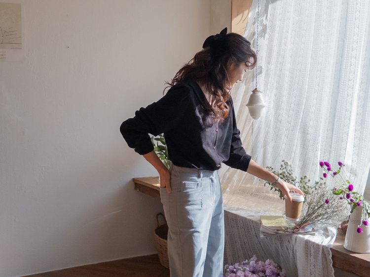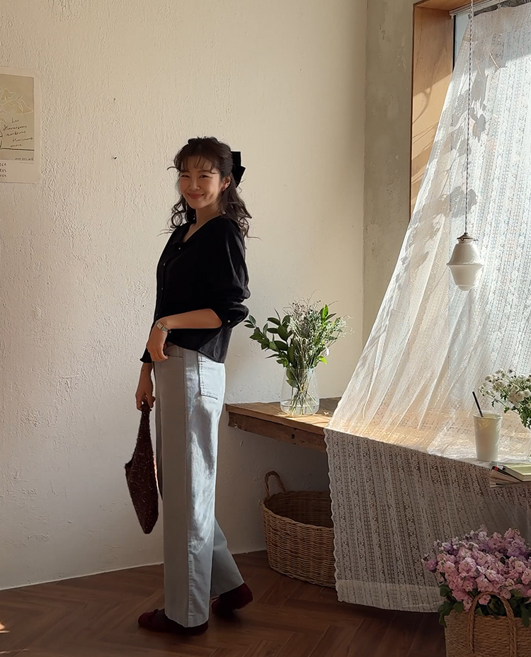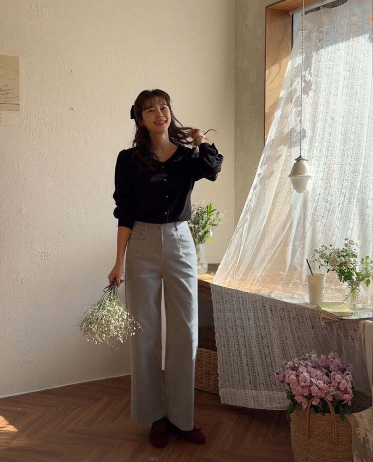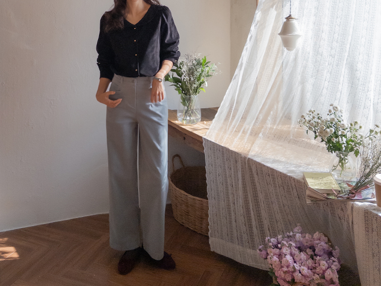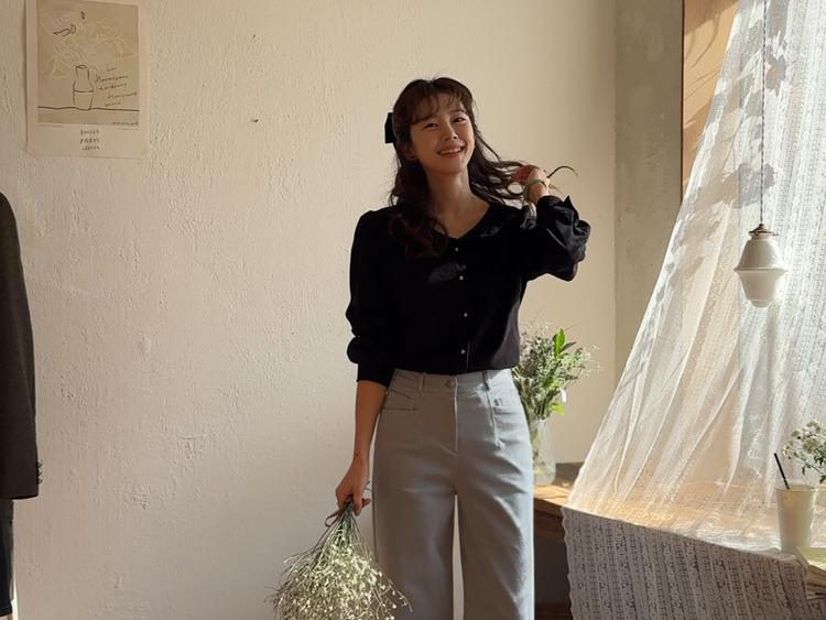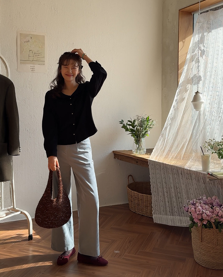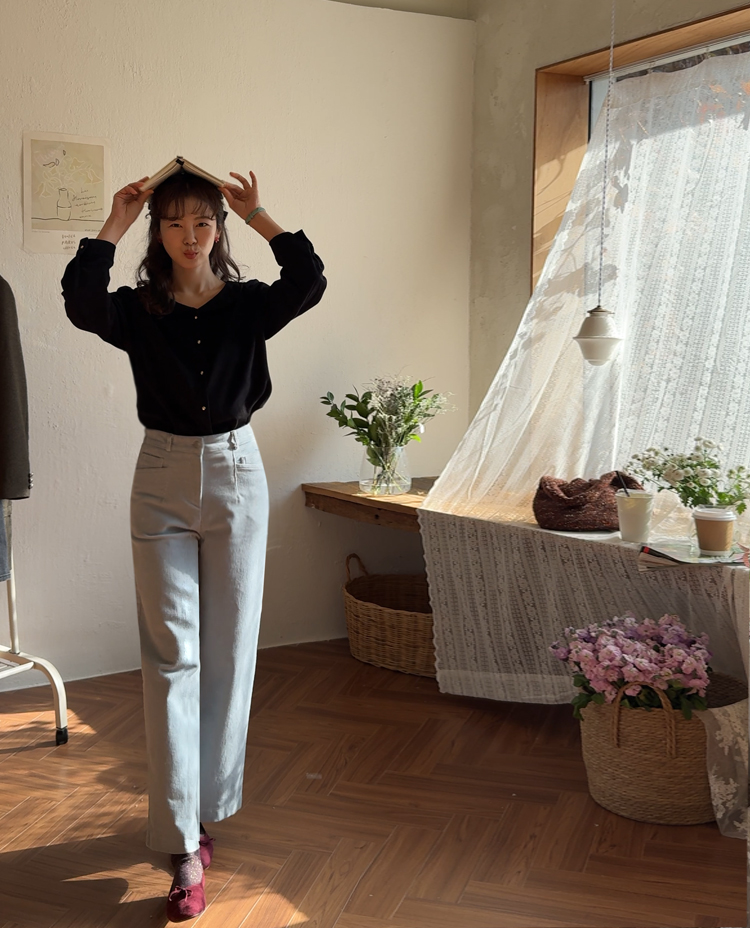 부드런 코듀로이 소재로 단정하면서도 사랑스러운 무드로 착용되는 블라우스 보여드려요~! 요 블라우스, 잔잔한 코듀로이 소재감으로 FW시즌에 정말 딱! 즐기기 좋은 그런 블라우스인데요*.* 쁘띠한 라운드 카라 디테일로 마치 꽃잎이 피어난듯한 카라도 포인트로 넘 예쁘구요 블라우스지만 여유있는 실루엣으로 딱 예쁜 핏으로 연출된답니다ㅎㅎ 버튼은 라운드쉐입의 골드 버튼으로 귀엽게 연출되는건 물론이구요~ 세미크롭한 길이감으로 하의에 넣어입지 않아도 예쁘게 떨어지는 기장이라 다양한 하의템에 매치하기도 좋은 블라우스라 추천드려요~♡
