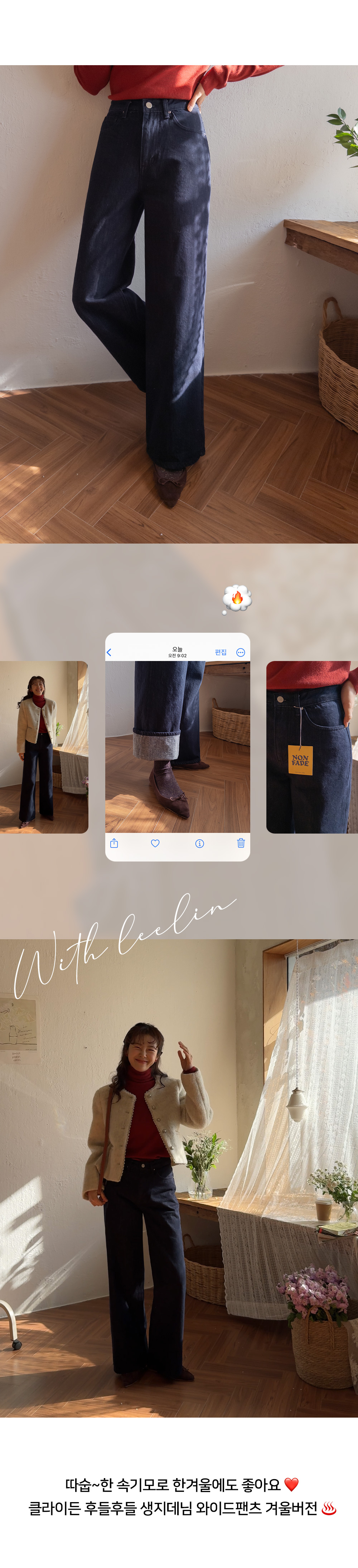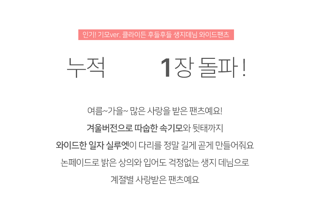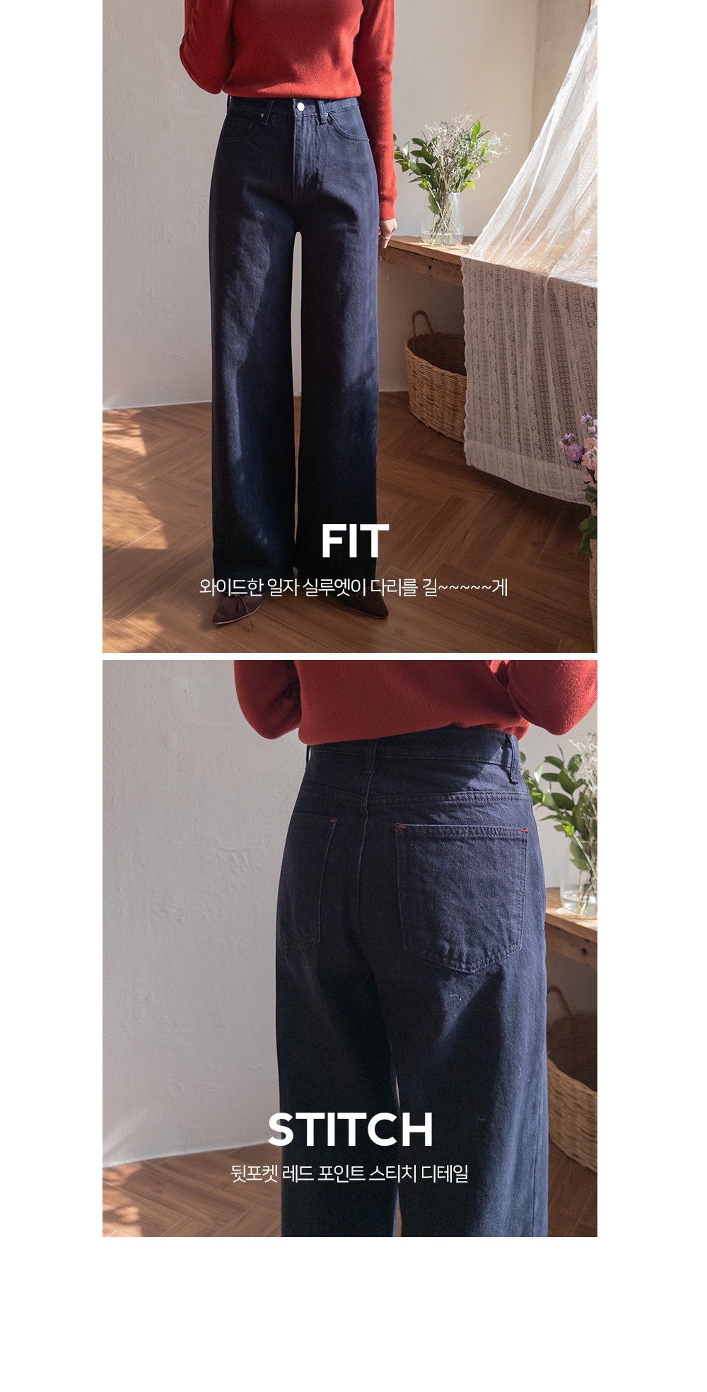 여름~가을~ 많은 사랑을 받은 그 바지 ! ! 기억하실까요~? 모델언니도 구매한 매직 핏이니 믿고 구매하는 팬츠랍니다 ㅎㅎ 와이드한 일자 실루엣이 다리를 정말 길게 만들어주고요~ 겨울버전으로 따숩한 속기모와 뒷태까지 신경 쓴~ 레드 포인트 스티치가 더해져 더욱 멋스러운 :D 논페이드로 밝은 상의와 입어도 걱정없는 생지 데님이라 소장가치 UP↑ 굿초이스해주세요~♥