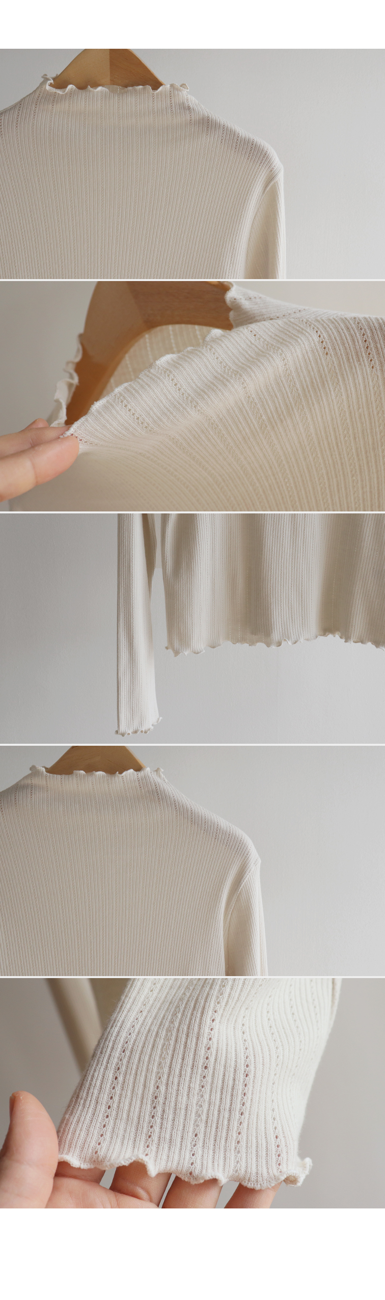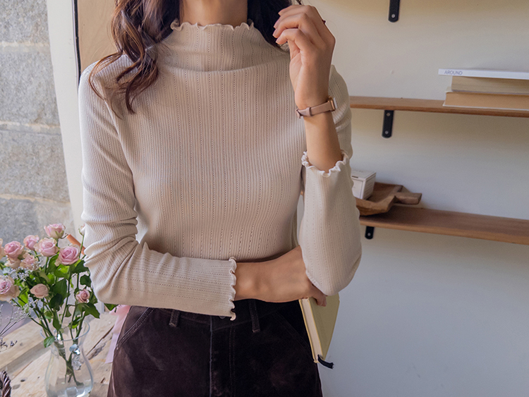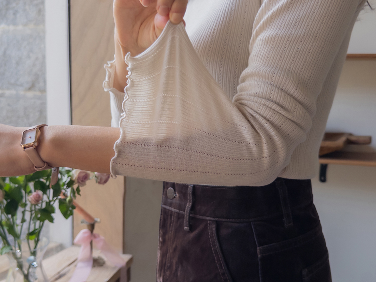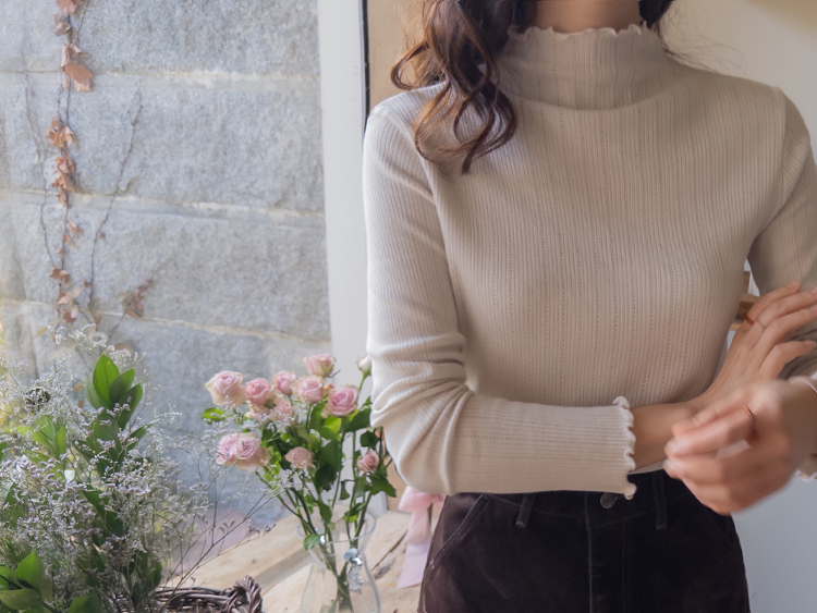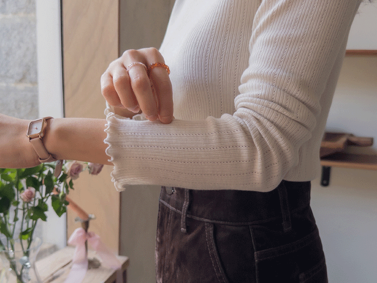 세로 골지에 미니멀한 펀칭이 더해져 슬림한 실루엣으로 연출되는 티셔츠에요! 자연스레 올라오는 반목 디자인에 끝단은 웨이브 물결 디테일이 있어서 다양한 아이템에 레이어드해서 착용하기에도 좋구요 바디에 적당히 슬림하게 연출되는 실루엣으로 단독이나 레이어드로도 강추>< 세로결의 골지로 바디라인도 말라보이구요 미니멀한 펀칭이 더해져있어서 여성스러움도 물씬 느껴진답니다 ㅎㅎ 또 신축성도 정말 좋아서 하루종일 부담없이 편하게 착용이 가능하니 소장하셔서 데일리로 매일 함께해주세요:)