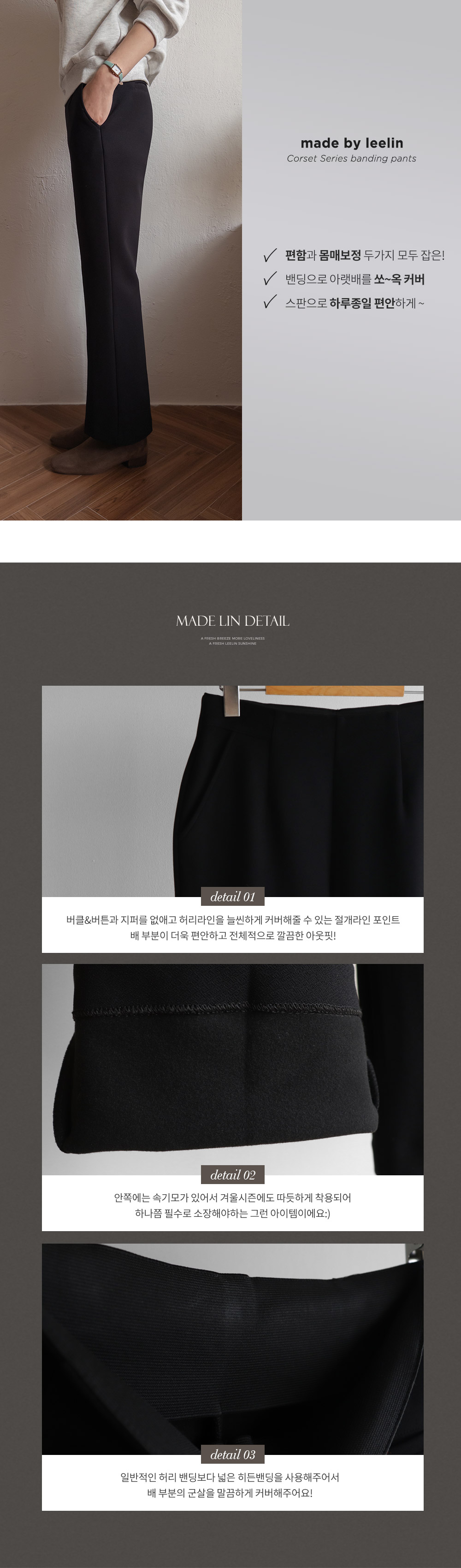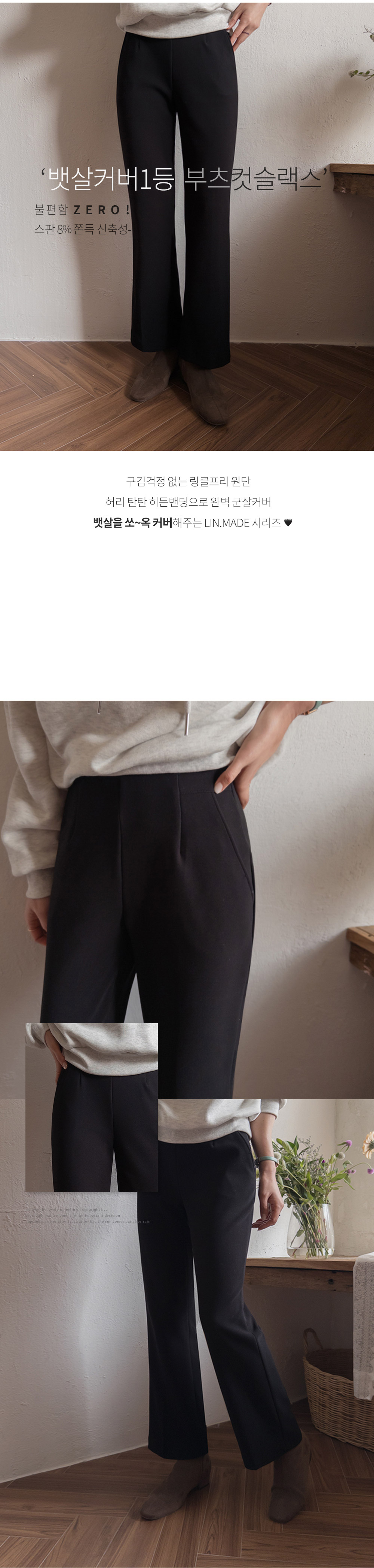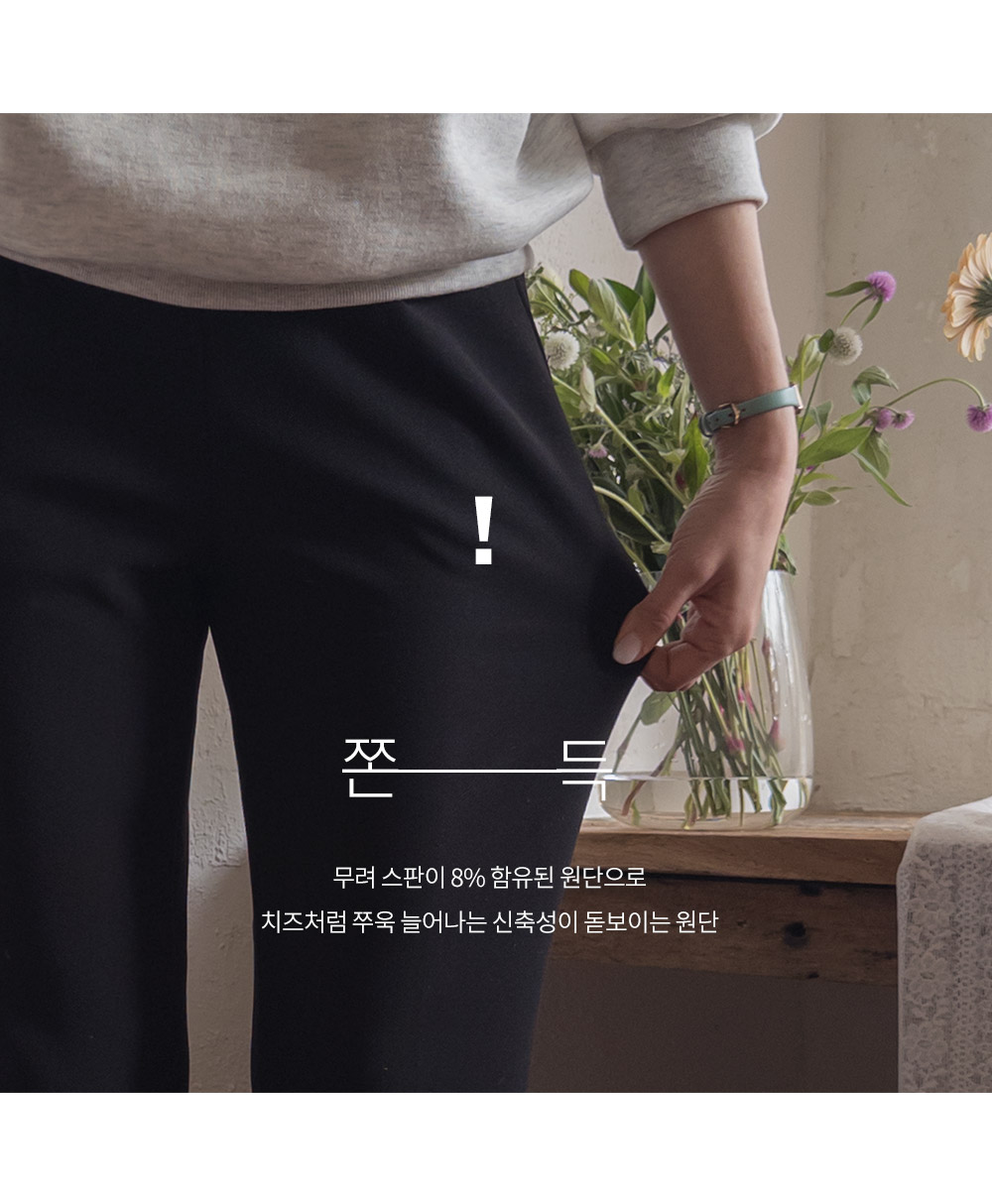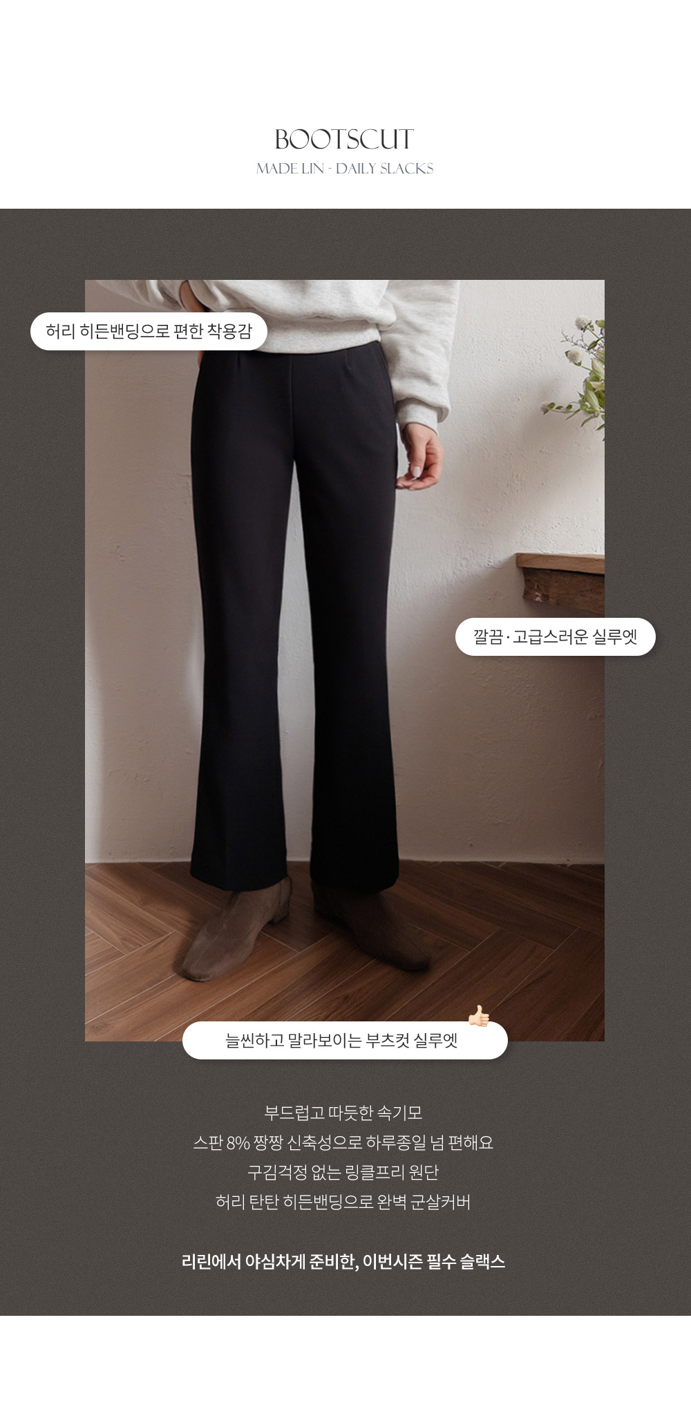 속기모에 짱짱한 신축성이 더해져 하루종일 착용해도 넘 편하고 예쁜 슬랙스 보여드려요~! 무려 스판이 8% 함유된 원단으로 치즈처럼 쭈욱 늘어나는 신축성이 돋보이는 원단인데요 링클프리로 구김도 없어서 하루종일 착용해도 핏 흐트러짐 없고 편안하게 착용되는 마법의 슬랙스랍니다 ㅎㅎ 그리고 안쪽에는 속기모가 있어서 겨울시즌에도 따듯하게 착용되어 하나쯤 필수로 소장해야하는 그런 아이템이에요:) 또한 허리는 전체 히든밴딩으로 되어있는데요 일반적인 허리 밴딩보다 넓은 밴딩을 사용해주어서 배 부분의 군살을 말끔하게 커버해주어요! 부츠컷 실루엣으로 다리라인도 늘씬하고 말라보이고 어느 체형에나 호불호없이 누구나 즐기기 좋은 실루엣이라 강추! 겨울시즌 매일매일 함께하기 좋은 데일리 슬랙스로 꼬~옥 추천드려요🤍