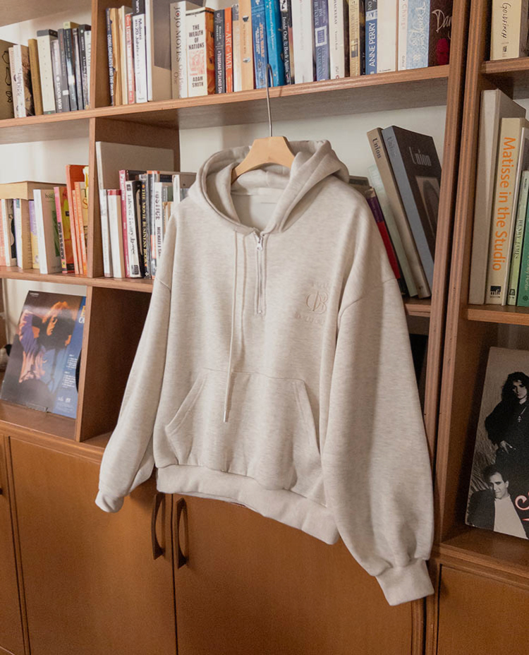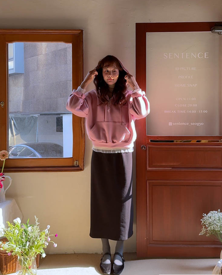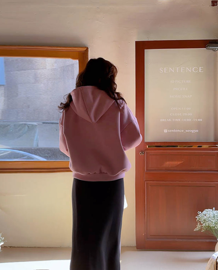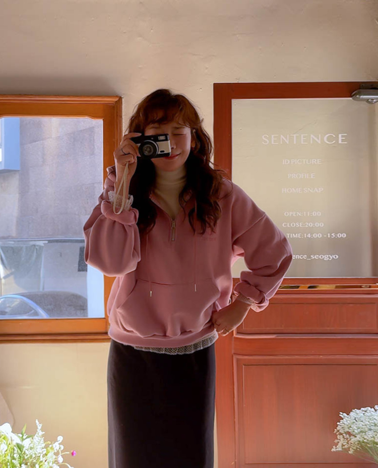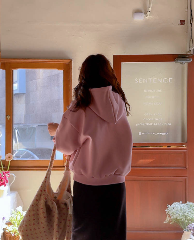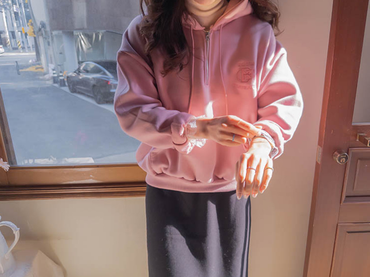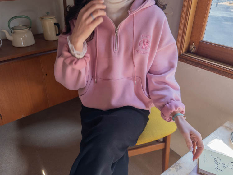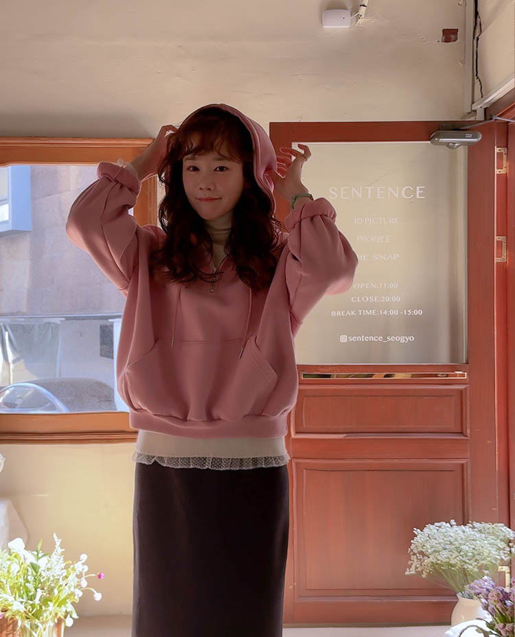 리린 감성의 러블리함과 포근함을 가득~ 담은 반집업 후드티 소개해 드려요 :) 보들~보들~한 속기모 안감으로 입는 순간 포근함이 느껴지는 아이템이에요☁️ 부드러운 터치감으로 피부 자극 없이 편안하게 착용 가능해요:) 요 아이템의 포인트는 바로 하프 집업 디테일! 지퍼를 조절해 넥 라인의 분위기를 취향에 맞게 연출해요*.* 완전히 올리면 더욱 따뜻하게~ 살짝 내려 입으면 내추럴한 캐주얼 무드로 특히 레이어드 티와 함께 매치하면 스타일리쉬함 UP!! 전체적으로 살짝 아방한 핏이라 귀엽고 포근한 실루엣이 연출되어 데일리용으로 부담 없이 입기 좋답니다❤️ 데일리하게~ 꾸안꾸룩으로 여기저기 매칭하기 좋은 만능템! 굿초이스 해주세요~♥
