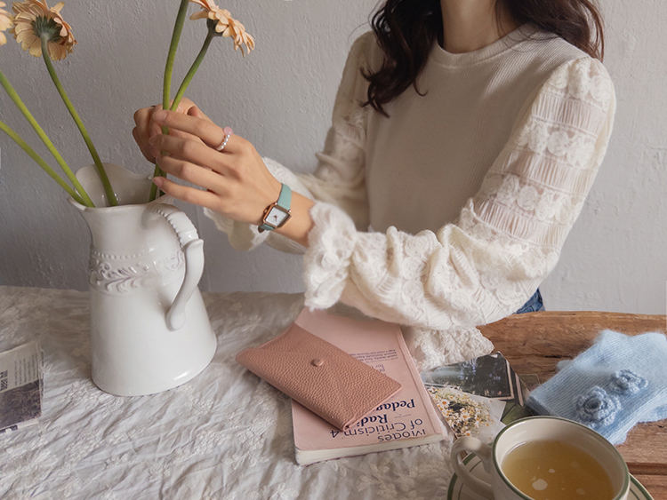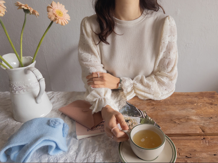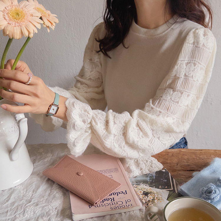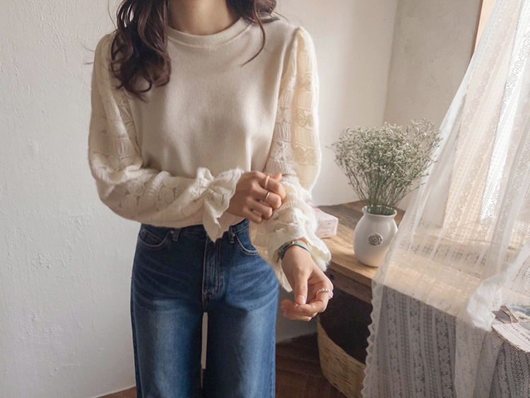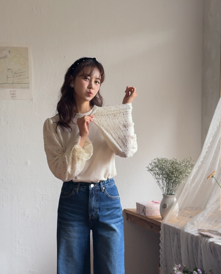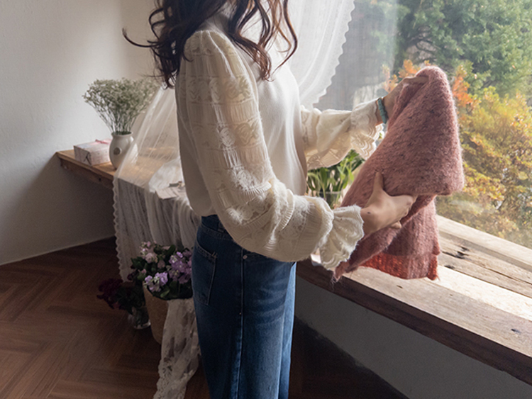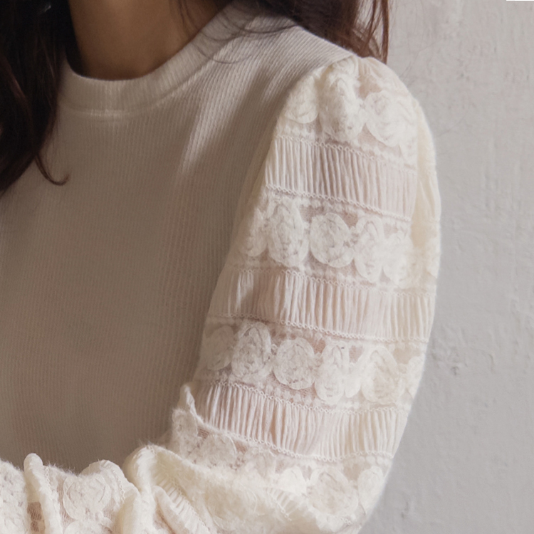 [Feminine mood filled Race Puff Knit Blouse♥] [Soft body and voluminous sleeves with lace are the key points!!] [The light and feminine silhouette is pretty~] [The moment you put it on, it's the ultimate in delicatenessㅎㅎ]