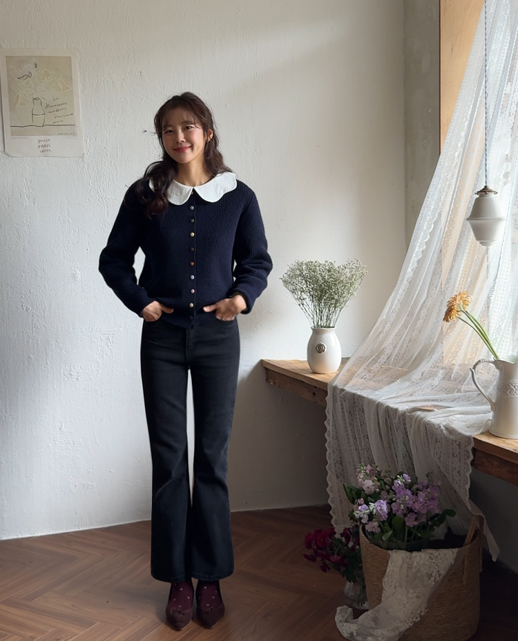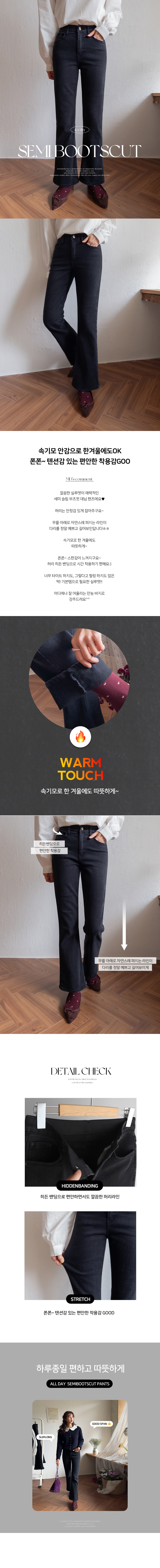 깔끔한 실루엣이 매력적인 세미 슬림 부츠컷 데님 팬츠에요♥ 허리는 안정감 있게 잡아주구요~ 무릎 아래로 자연스레 퍼지는 라인이 다리를 정말 예쁘고 길어보인답니다ㅎㅎ 속기모로 한 겨울에도 따뜻하게~ 쫀쫀~ 스판감이 느껴지구요~ 허리 히든 밴딩으로 시간 착용하기 편해요:) 너무 타이트 하지도, 그렇다고 헐렁 하지도 않은 딱! 기본템으로 필요한 실루엣!! 어디에나 잘 어울리는 만능 바지로 강추드려요^^