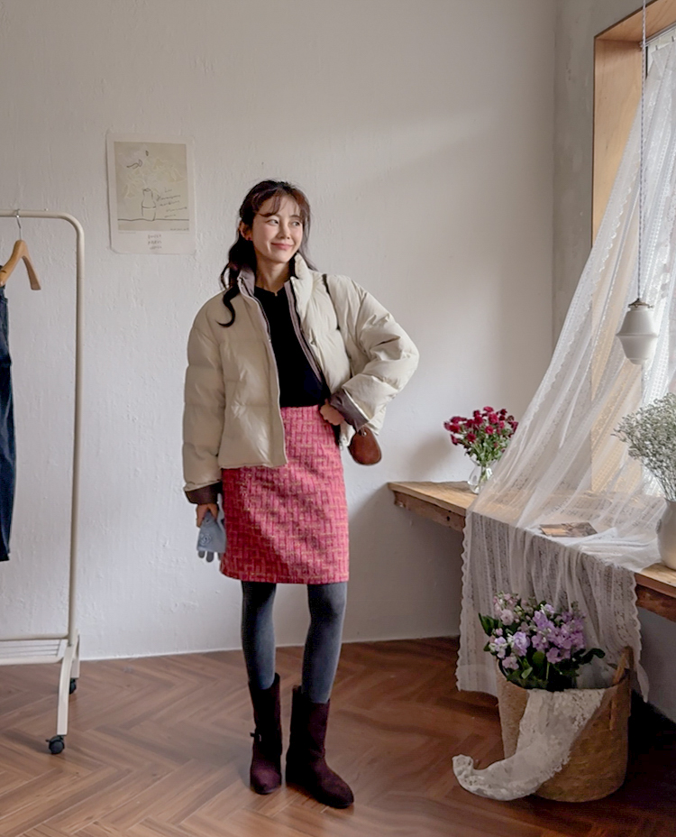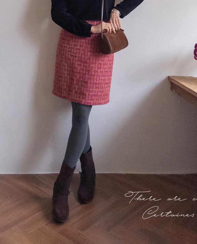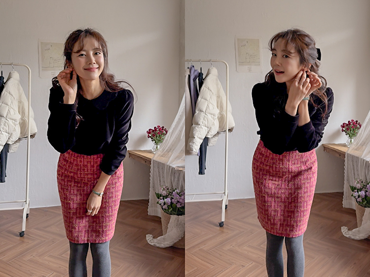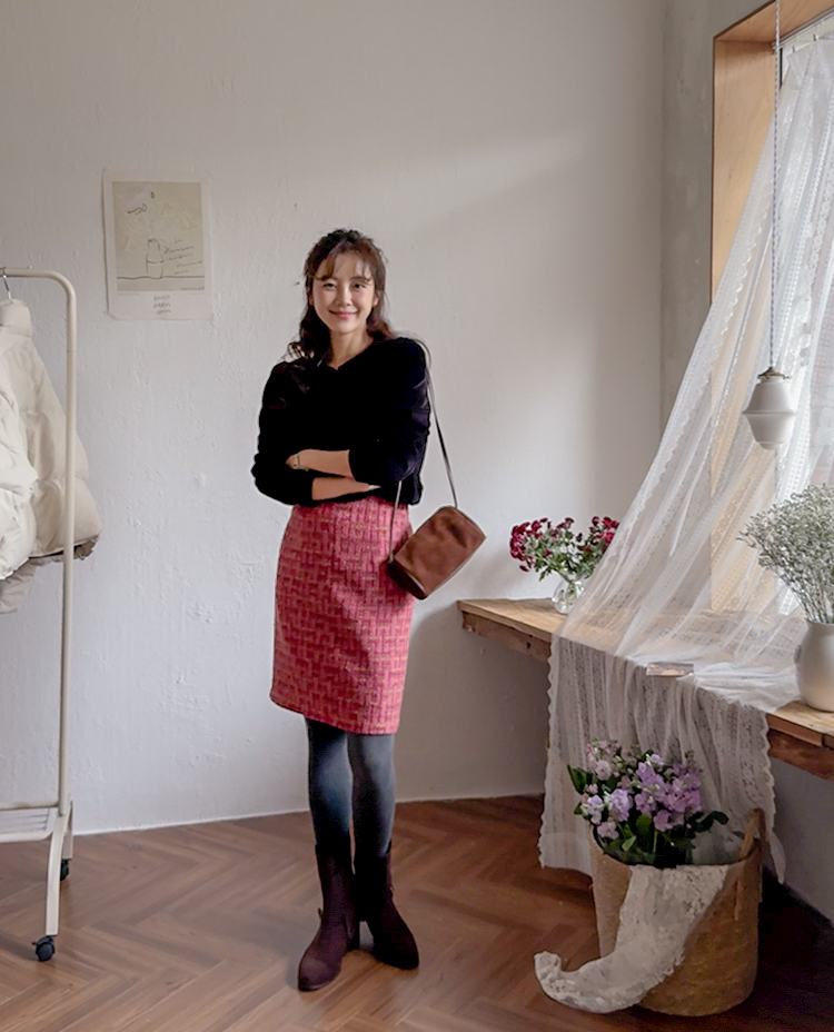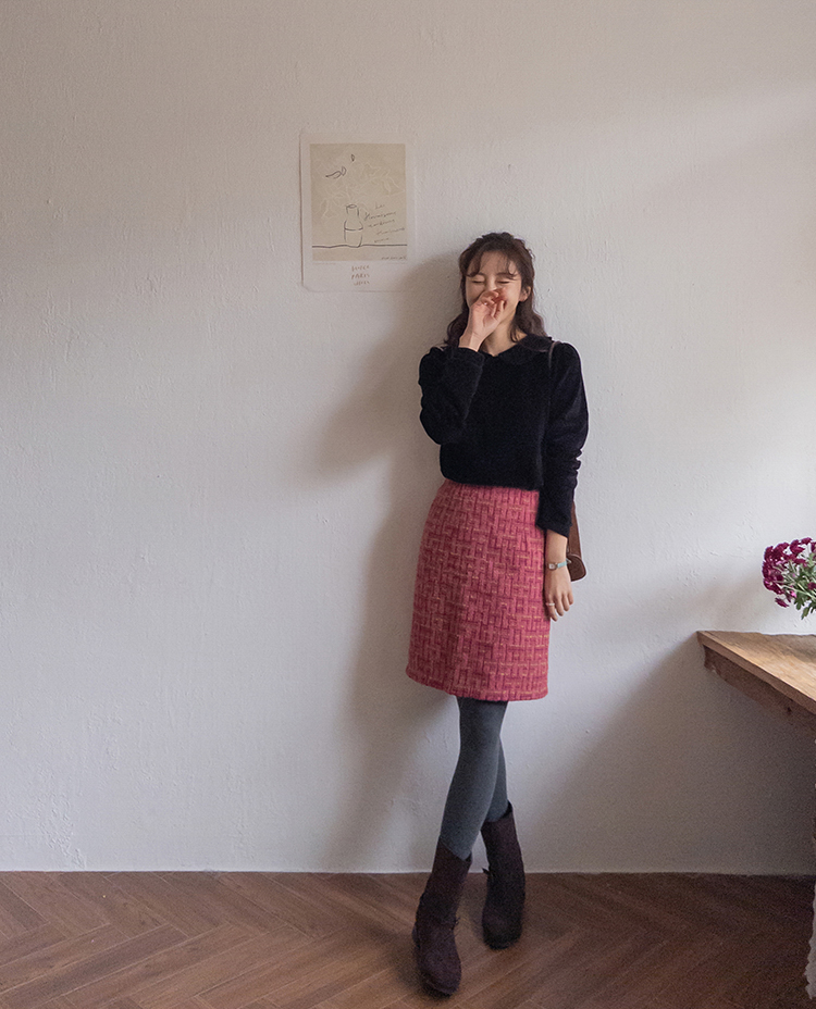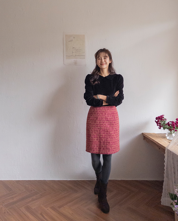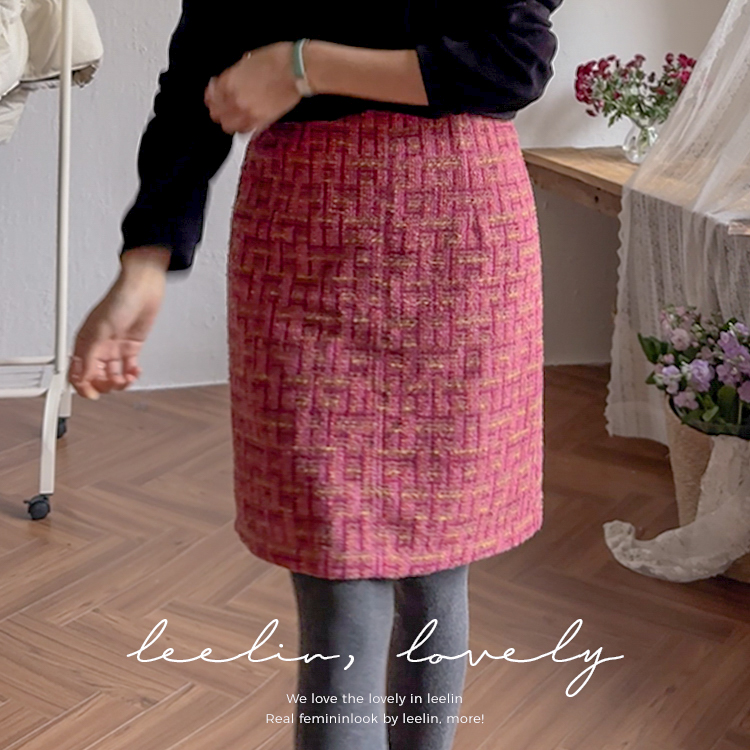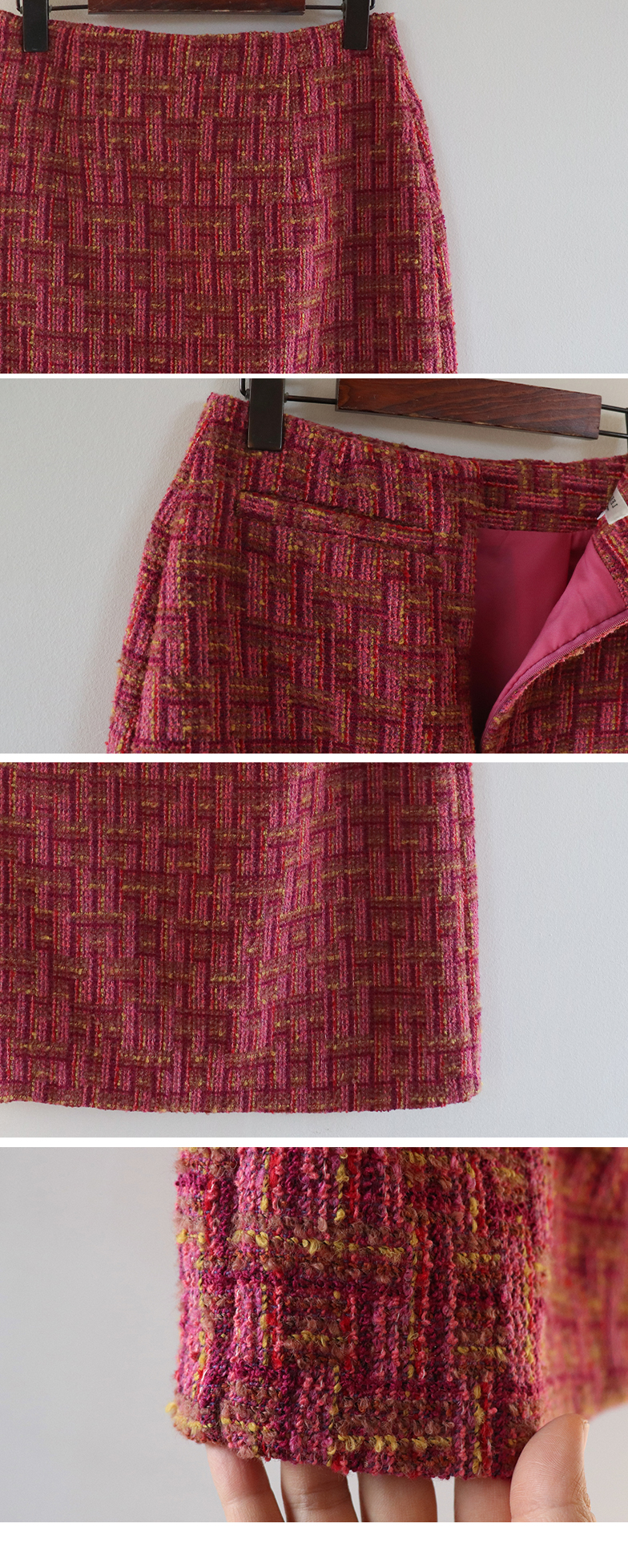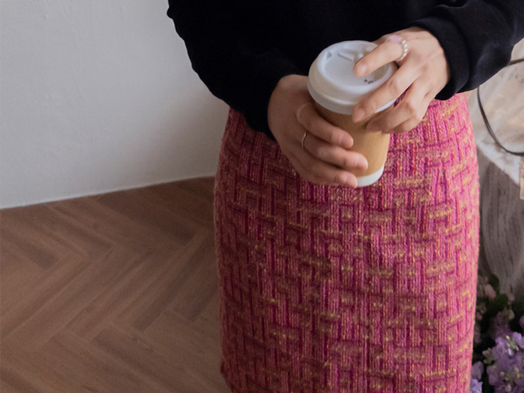 다채로운 매력의 실컬러와 패턴으로 흔하지 않은 매력의 LIN.MADE 트위드 스커트 보여드려요~! 트위드의 계절이 점점 다가오고 있는데요~ 톡톡한 두께감으로 지금부터 봄 시즌까지 활용도 높게 입어질 아이에요ㅎㅎ 요 스커트는 원단이 너무 특별해요*.* 가로세로가 믹스된듯 지그재그 패턴에 옐로우와 핑크가 믹스된 트위드 원단으로 컬러까지 넘 예쁘답니다:) 미니와 롱 중간정도의, 힙라인과 허벅지를 커버하는 미디 길이감으로 모델기준 무릎 위로 올라오는 기장이구요~ 미니스커트가 부담스러우셨던 분들도 안정적이고 부담없이 착용하기 좋아서 강추! 콘솔지퍼로 깔끔한 오픈클로징까지 가능해 전체적인 아웃핏도 단정해서 하객룩, 격식룩으로도 손색없답니다~! 컬러는 비비드한 핑크로 준비했어요~ 요 스커트만으로 룩에 포인트를 주기 좋은데다 다가오는 봄 시즌까지 쭈욱 즐기기 좋아 추천드려요~♡