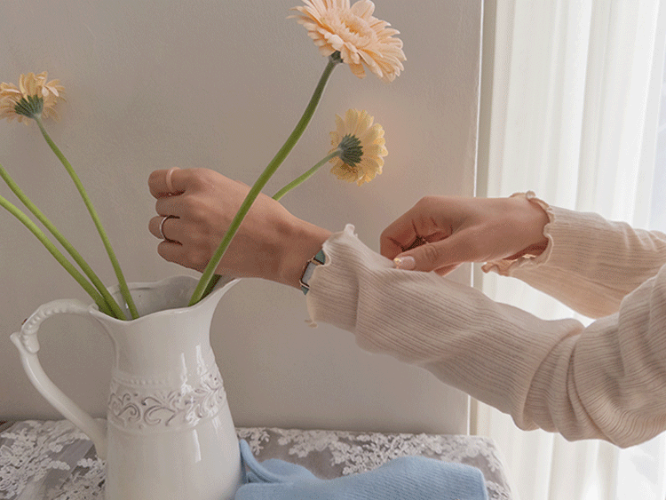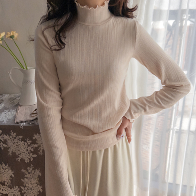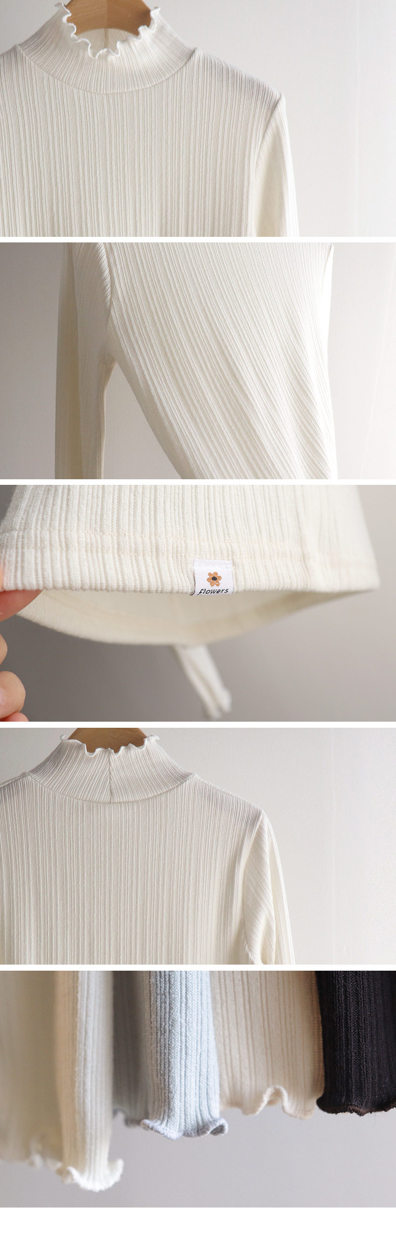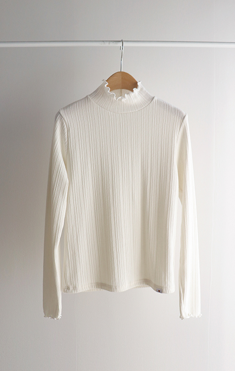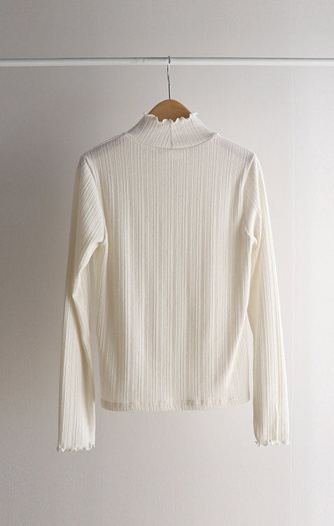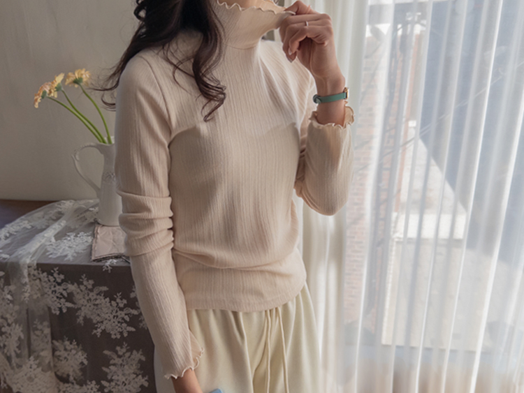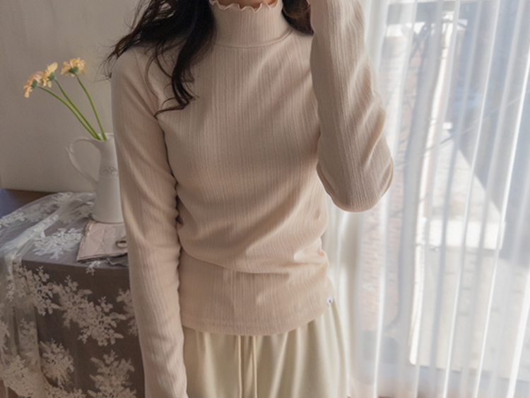 넥라인과 소매라인의 프릴 디테일이 겨울 코디에 러블리함을 더해주는 이너 폴라 티셔츠에요💕 잔골지 디테일로 몸 라인이 더 슬림하게 표현되고 쫀쫀한 텍스처로 하루종일 입어도 부담없이 편안하답니다~^^ 적당히 얇은 두께로 니트나 맨투맨 안에 레이어드하면 프릴포인트가 겨울 코디에 러블리한 감성 한스푼~💕 여기저기 매치하기 좋아 활용도가 매우 높은 올 겨울 필수템이랍니다🤍✨ 굿 초이스 해주세요~♥