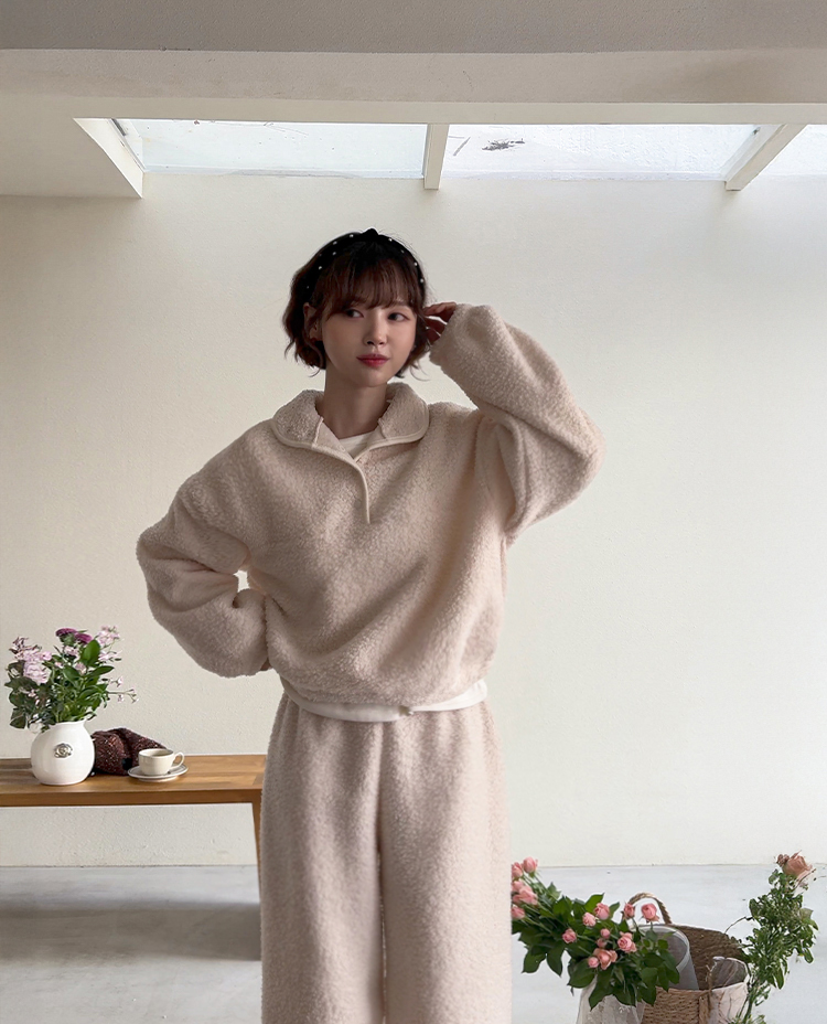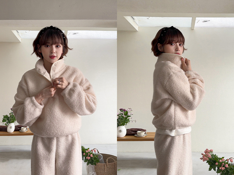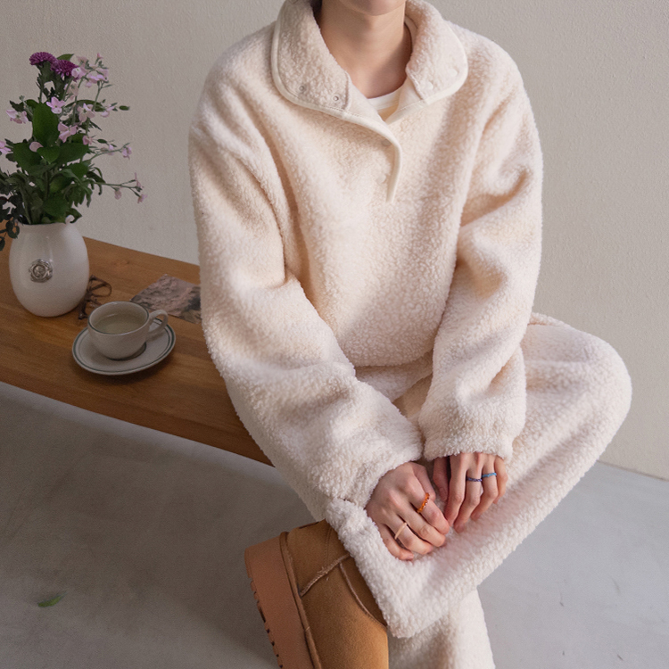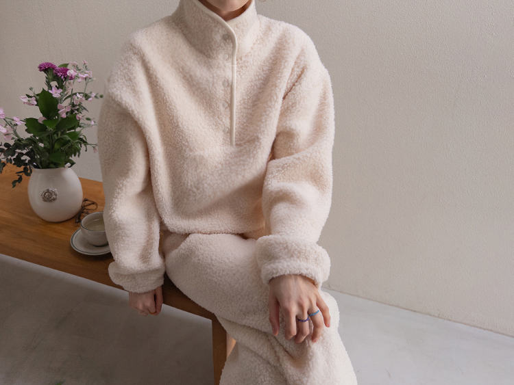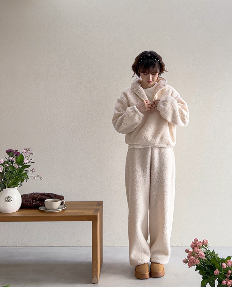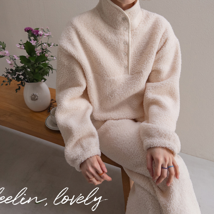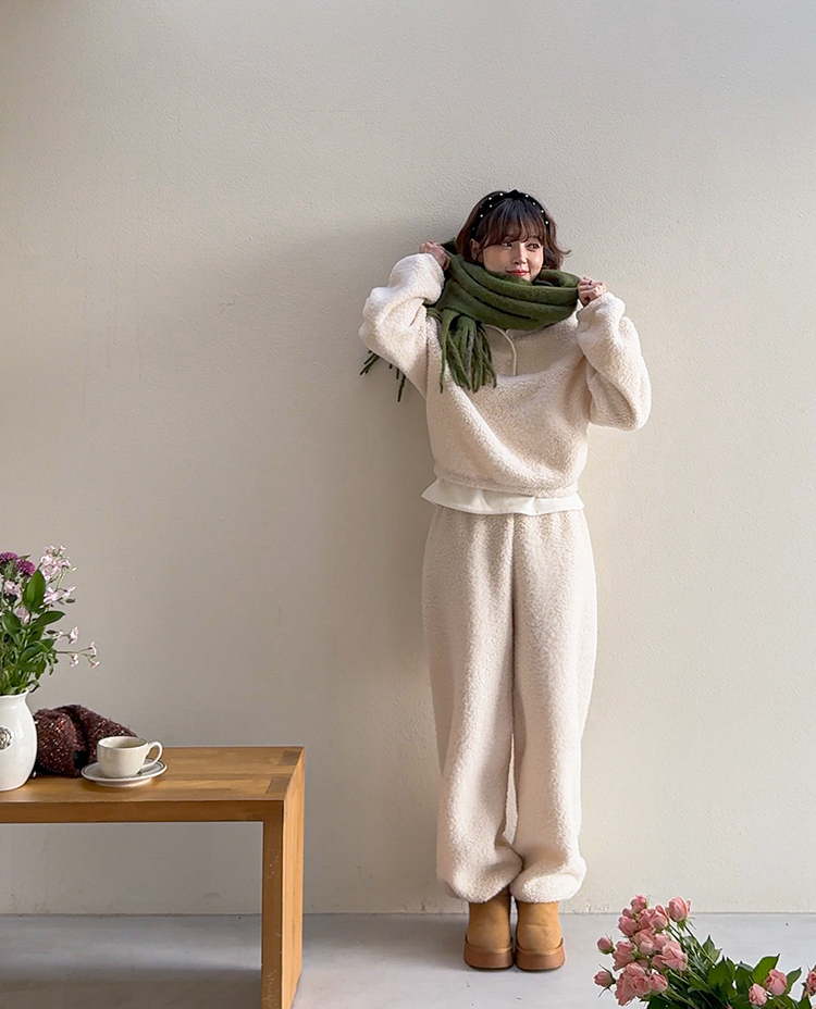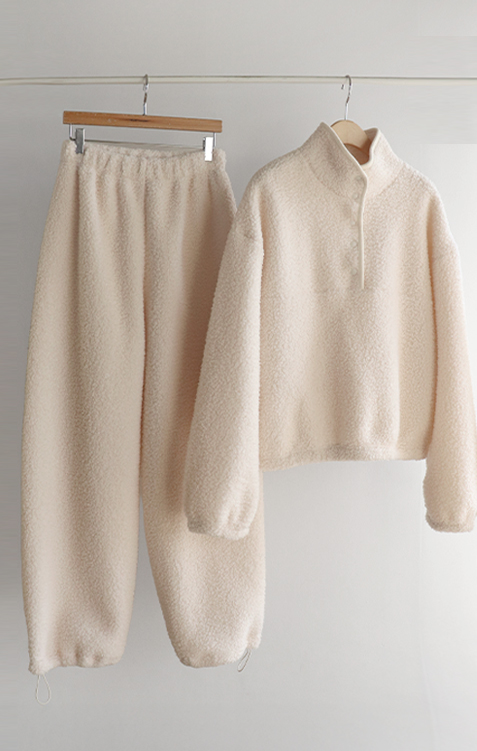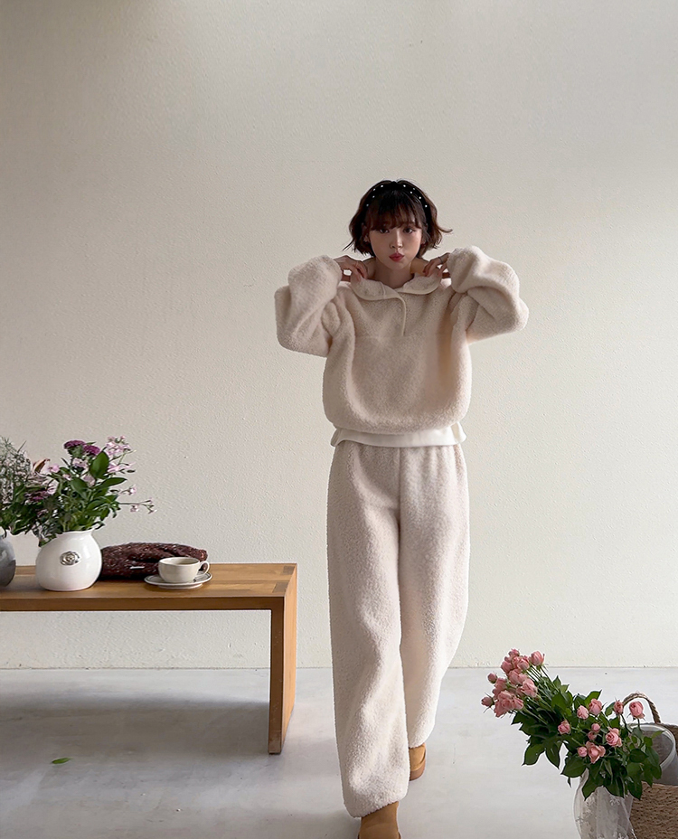 뽀글~뽀글~보기만 해도 포근하고 러블리한 분위기 가득한 뽀글이 셋업이에요~💕 포근함이 느껴지는 텍스처로 입는 순간 귀여운 무드가 확 살아나고~ 넉넉한 핏이라 하루 종일 편안하게 입기 좋아요♡.♡ 팬츠는 허리 전체 밴딩으로 장시간 착용해도 부담 없이 편안하구요~ 밑단 스트링 조절로 조거 스타일, 일자 팬츠 두 가지 연출이 가능해 취향에 따라 다양하게 즐길 수 있답니다!*.* 휘뚤~마뚤~ 데일리룩은 물론 여행룩, 캠핑룩으로도 찰떡인 아이템이라 편안함과 귀여움 둘 다 챙기기 딱이 요 아이템!! 굿 초이스 해주세요~♡