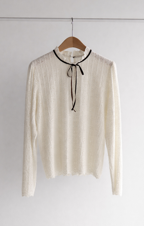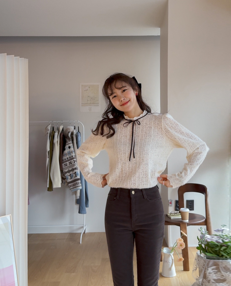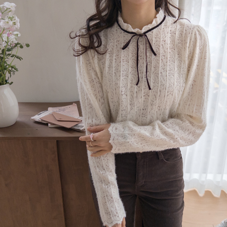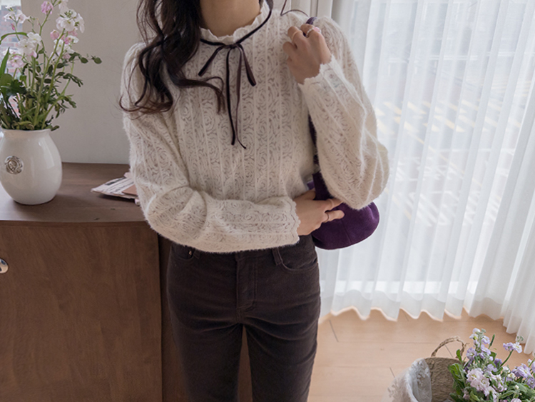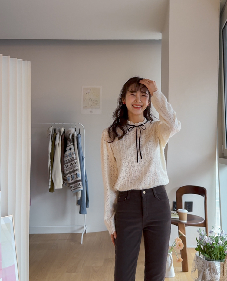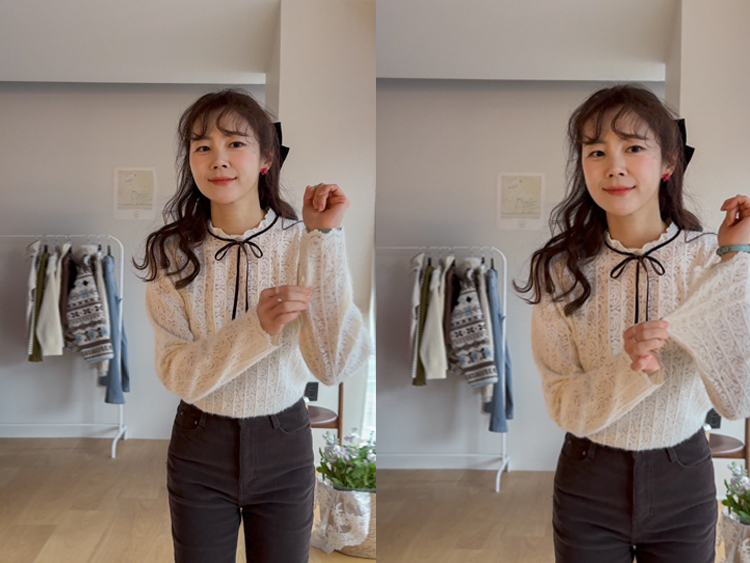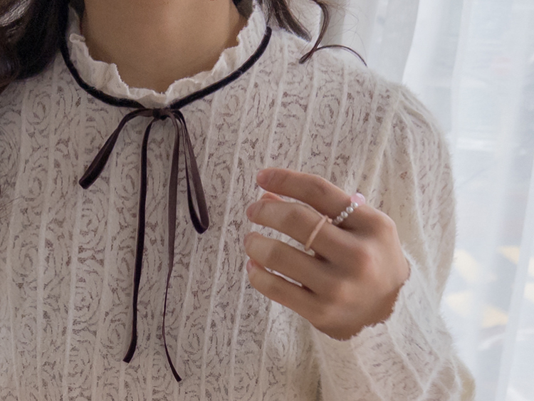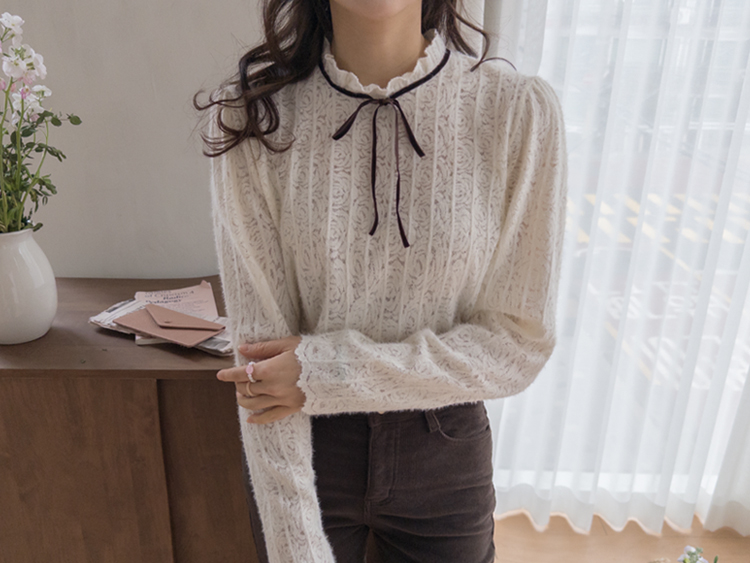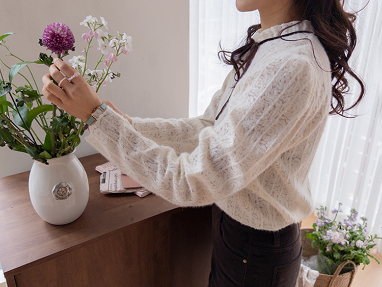 잔잔한 텍스처가 느껴지는 단정하면서 여성스러운~ 블라우스 소개드려요^^ 넥라인 프릴과 배색의 리본 스트랩이 분위기를 한층 더 러블리하게 ><♥ 부드러운 촉감과 유연한 소재감으로 단독은 물론이구요~ 모델언니처럼 니트와 매치해주면 좀 더 센스있는 룩 완성 ~*.* 쫀-쫀한 텐션감과 적당히 슬림한 실루엣이 편안한 착용감까지 ㅎㅎ 굿초이스 해주세요~♥
