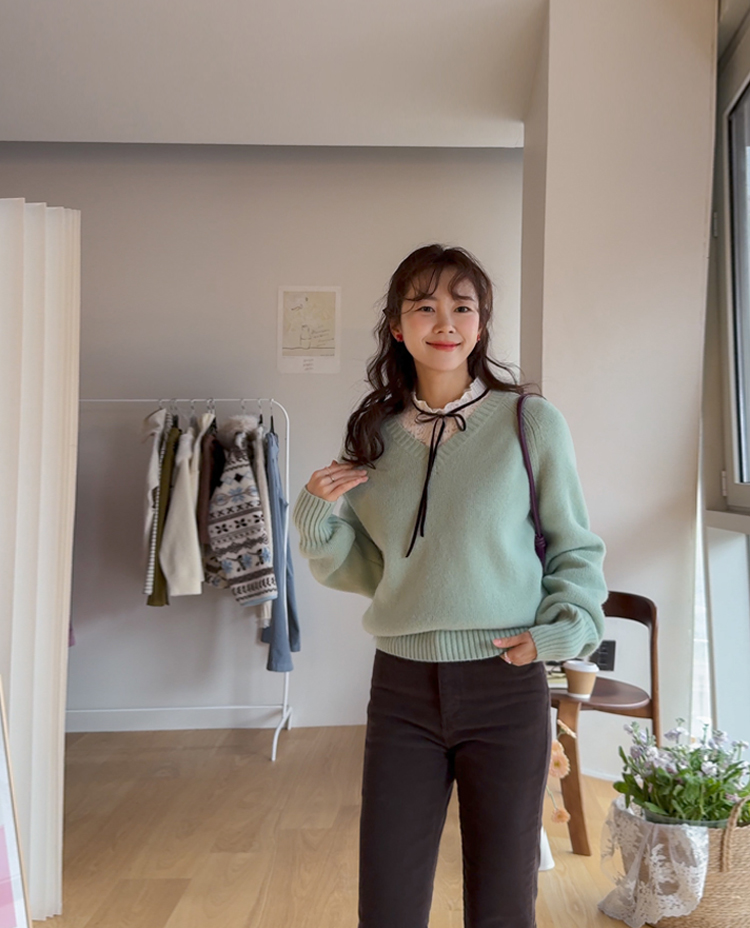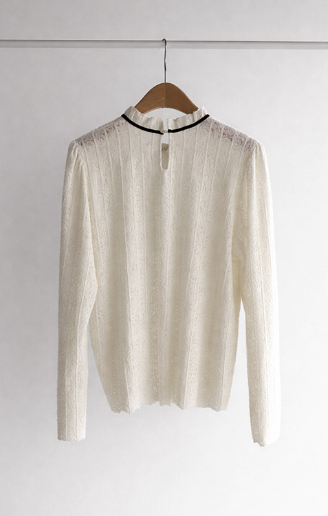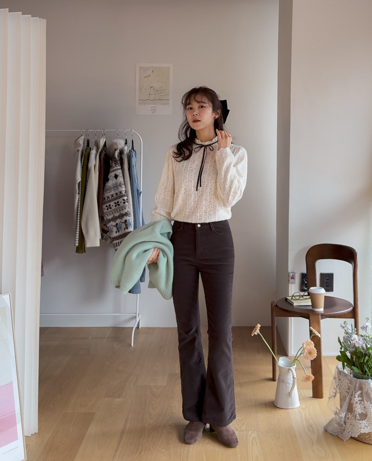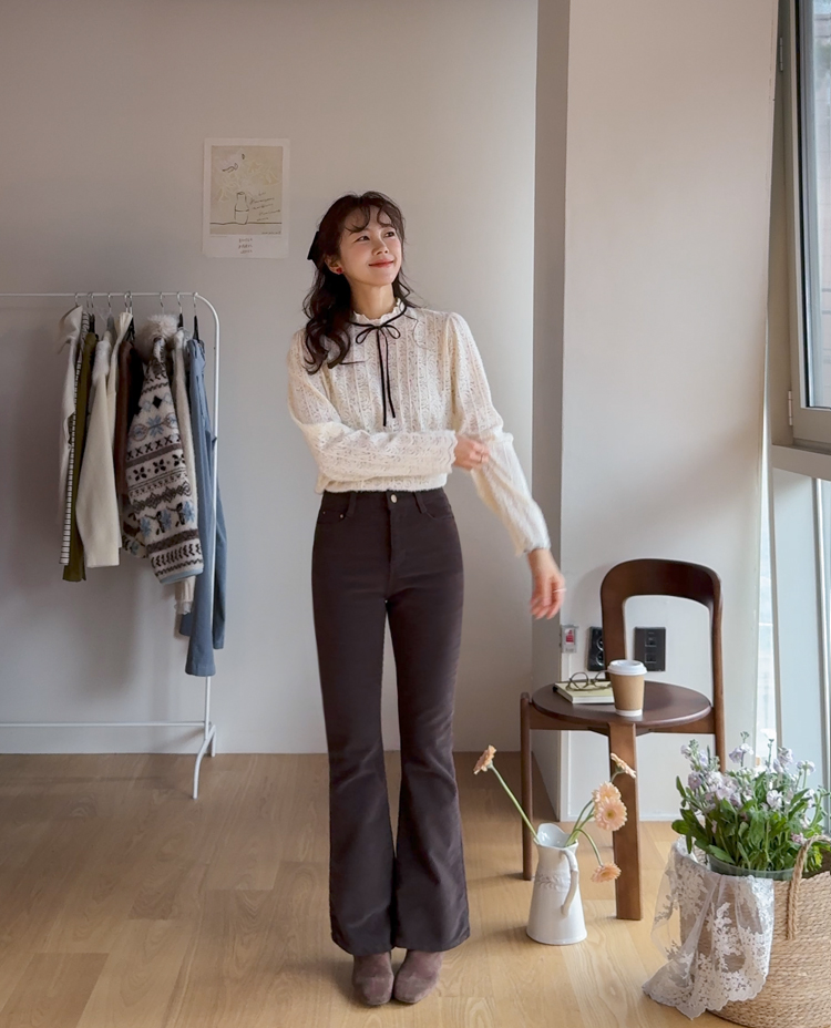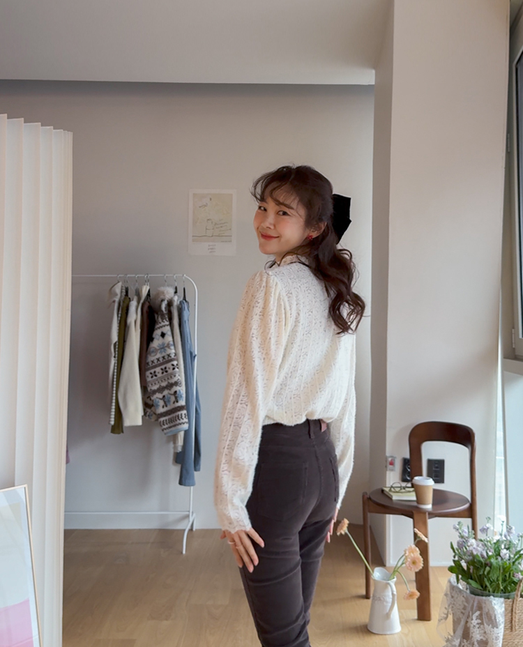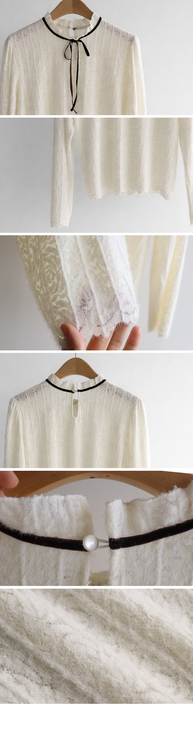 잔잔한 텍스처가 느껴지는 단정하면서 여성스러운~ 블라우스 소개드려요^^ 넥라인 프릴과 배색의 리본 스트랩이 분위기를 한층 더 러블리하게 ><♥ 부드러운 촉감과 유연한 소재감으로 단독은 물론이구요~ 모델언니처럼 니트와 매치해주면 좀 더 센스있는 룩 완성 ~*.* 쫀-쫀한 텐션감과 적당히 슬림한 실루엣이 편안한 착용감까지 ㅎㅎ 굿초이스 해주세요~♥