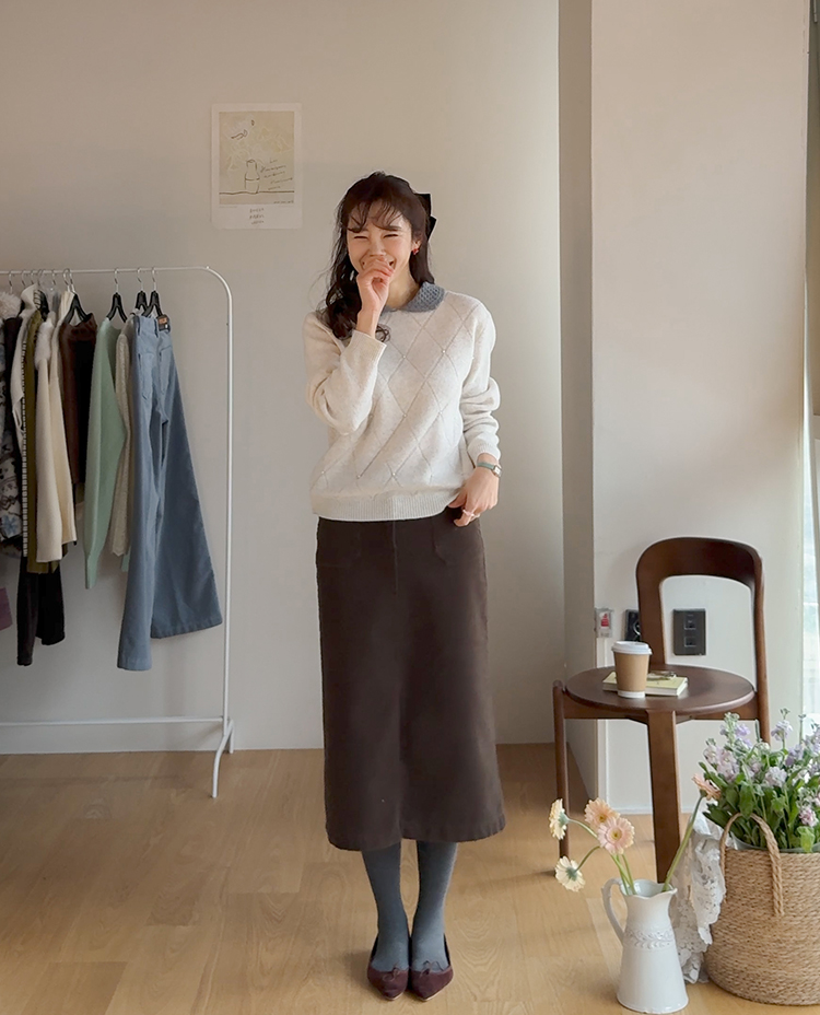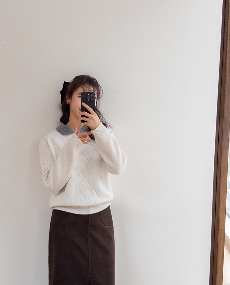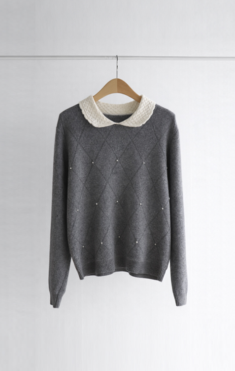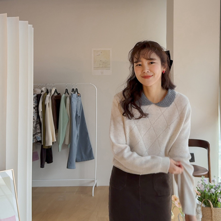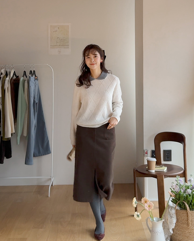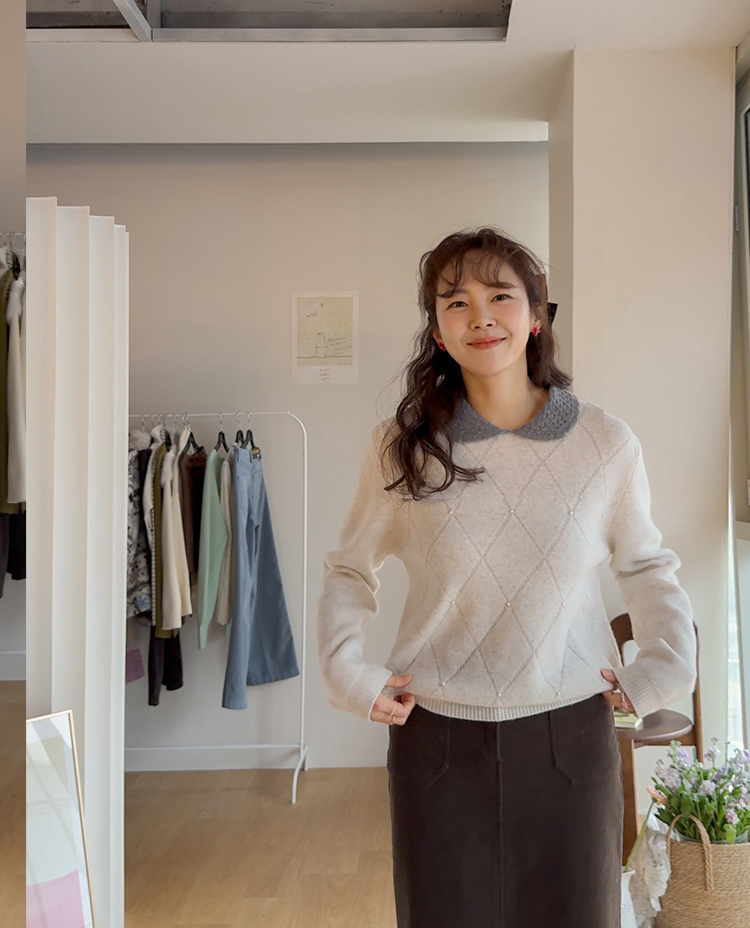 깔끔하면서도 포인트 있는 니트 찾으셨다면 요 아이 정말 딱이에요~^^ 둥근 카라 디자인에 진주 디테일이 더해져 페미닌한 무드가 뿜뿜 하는데요ㅎㅎ 니트 전체에 은은하게 들어간 다이아 패턴과 자연스럽게 더해진 진주 디테일이 과하지 않게 고급스러운 포인트가 되어준답니다~ 부드럽고 포근한 니트 소재로 맨살에 입어도 까슬거림 없이 편안하고, 여유 있는 핏감으로 하루 종일 착용해도 부담 NO!! 슬랙스와 매치하면 단정한 출근룩으로, 스커트와 함께하면 로맨틱한 데이트룩으로 다양하게 연출 가능한 니트♥ 하나만 입어도 분위기 살아나는 아이템이라 소장가치 좋답니다^^