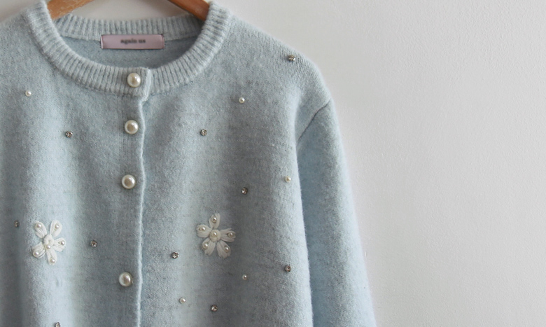 [A warm and bright cardigan with jewel decoration] [Jewel decoration: made of jing] [The flower embroidery adds a lovely mood] [The pearl buttons are also very pretty] [The pastel color adds a touch of sophistication when coordinating] [Highly recommended as a warm and key point cardigan]