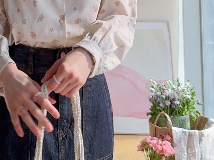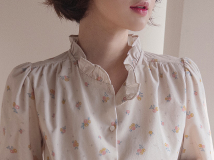 부드러운 골덴 소재감이 단독은 물론~ 모델언니처럼 레이어드해서 입으면 룩을 더 업그레이드 시켜주는 블라우스 소개드려요! 넥 러플 디자인으로 발랄한 무드를 주고요~ 어깨 핀턱으로 자연스러운 볼륨감을 만들어주어 상체 보안에 너무 좋아요 ^^ 따뜻한 색감의 아이보리 컬러감과 사랑스러운 패턴이 단독으로 포인트 톡!톡!하니~ 굿초이스 해주세요 ♥