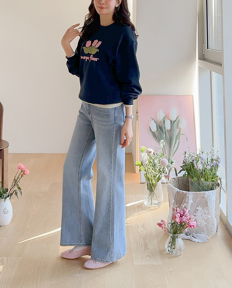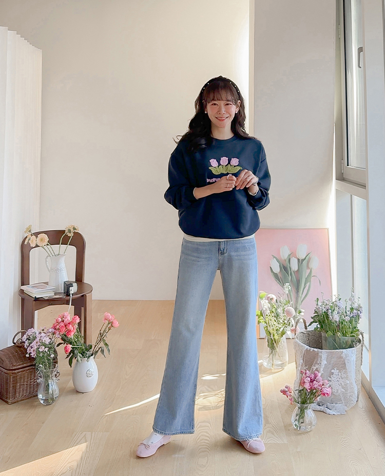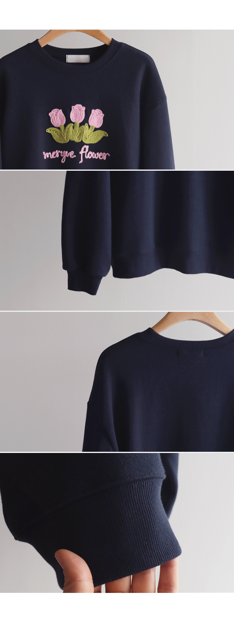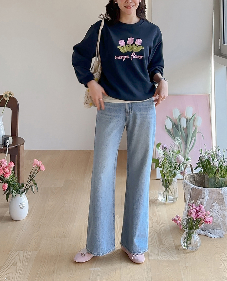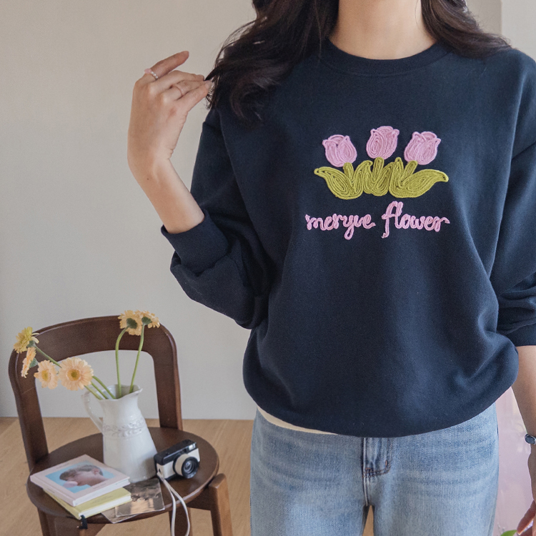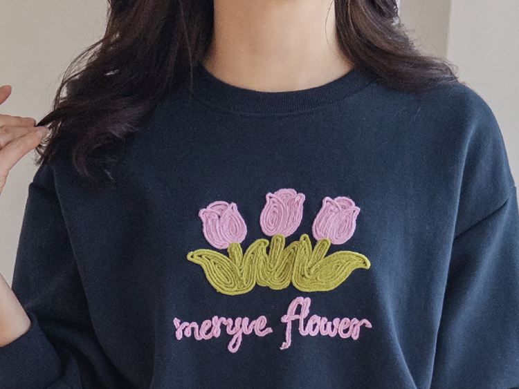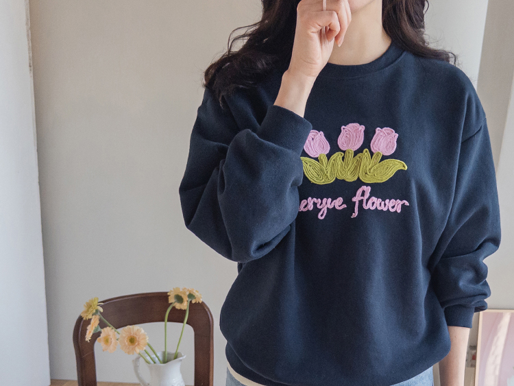 은은~하게 입체감이 느껴지는 튤립자수로 사랑스러운 맨투맨 소개 드려요~ 여유가 있는 핏으로 여러 이너와 레이어드하기 좋아 다양한 연출이 가능해요^~^ 사랑스런 튤립 포인트가 캐주얼하면서도 여성스러운 분위기를 만들어 준답니다~ 은근한 포인트가 되어 주는 데일리템으로 웨어러블한 코디로 즐겨주세요~*♥*