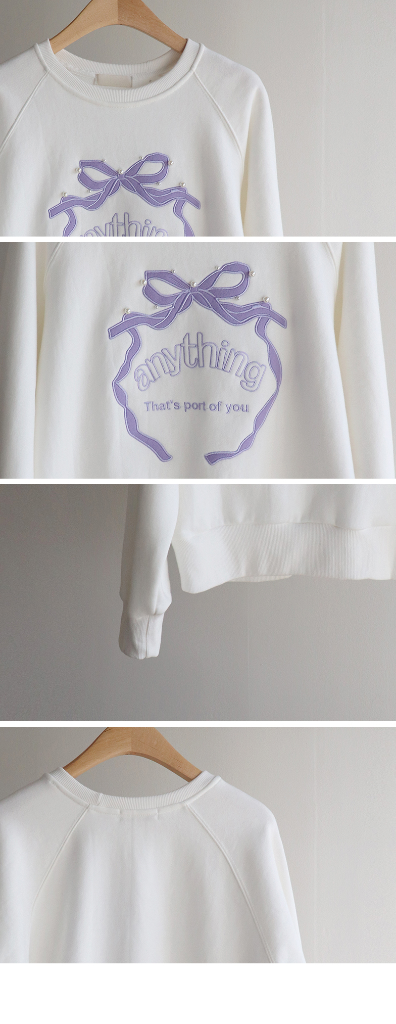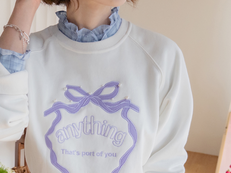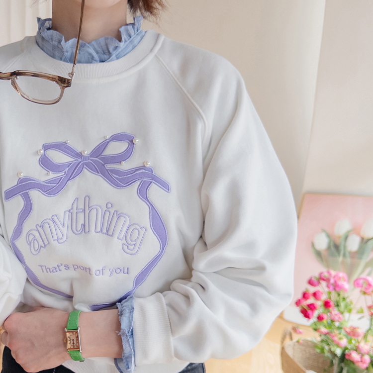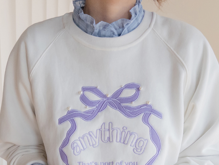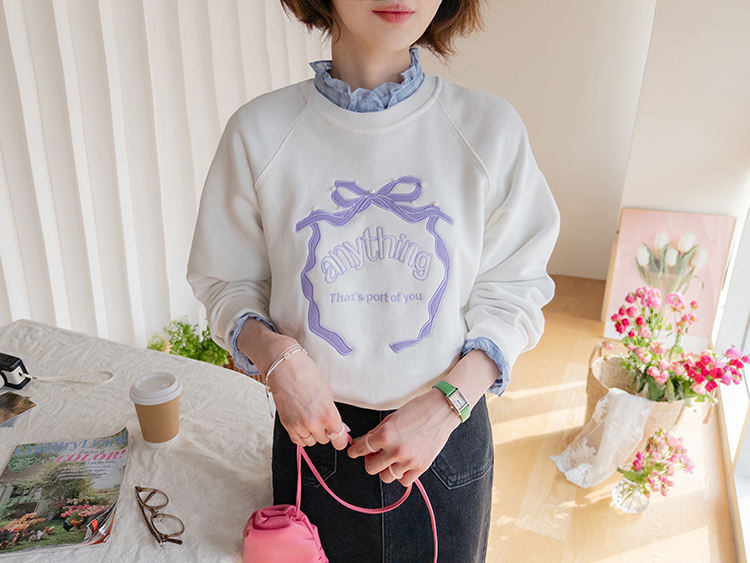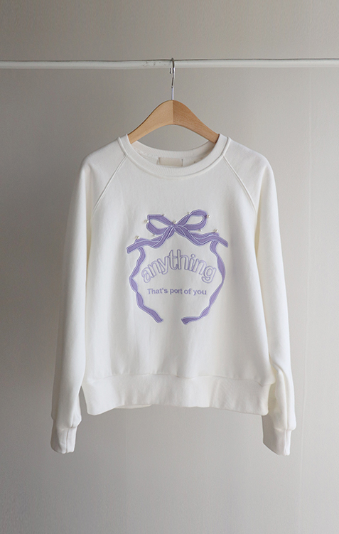 러블리한 감성이 돋보이는 리본 자수 맨투맨 소개드려요 ^^ 프론트 중앙에 더해진 리본 모양 자수와 레터링 디테일이 입체감 있게 포인트를 살려줘요~ 과하지 않은 디자인이라 캐주얼하면서도 은근히 사랑스러운 분위기로 데일리 코디에 딱 좋아요 ㅎㅎ 라운드 넥에 래글런 소매 라인으로 어깨선은 부드럽게 떨어지고 전체 실루엣은 깔끔하게 정리돼요 굿초이스 해주세요 ♥