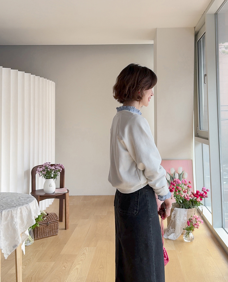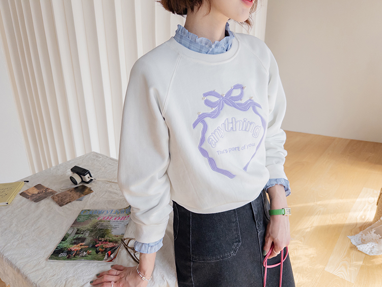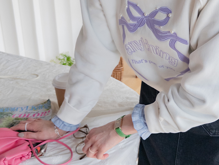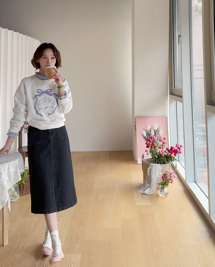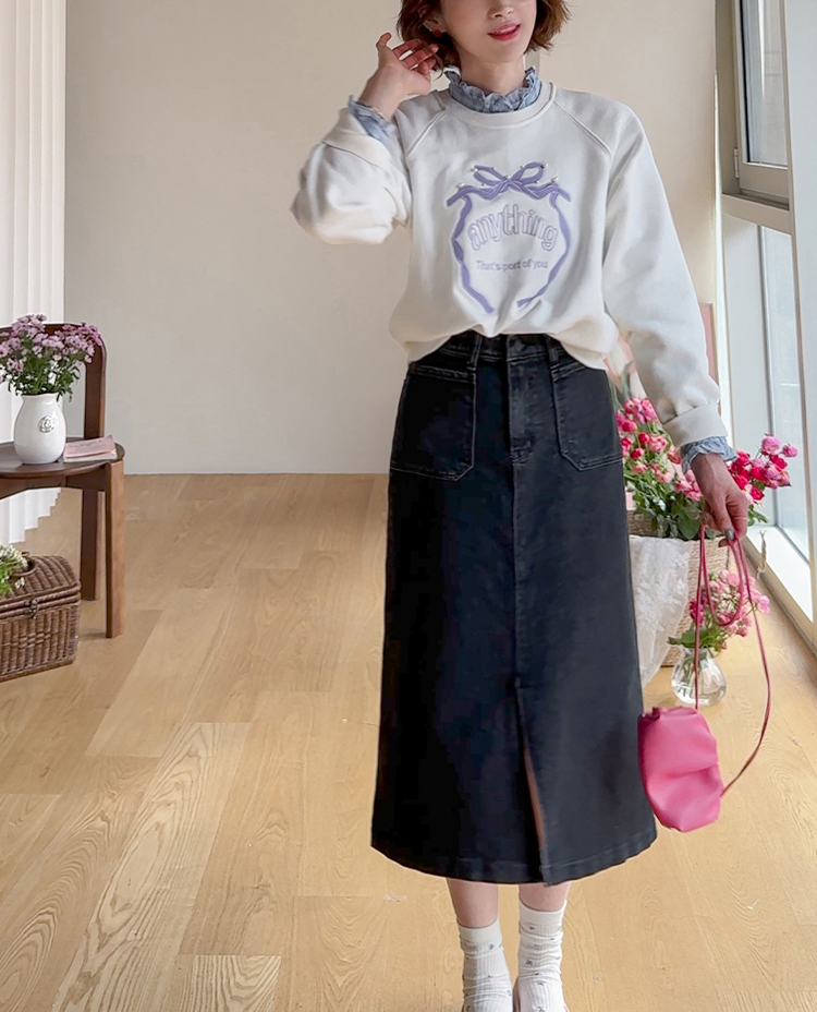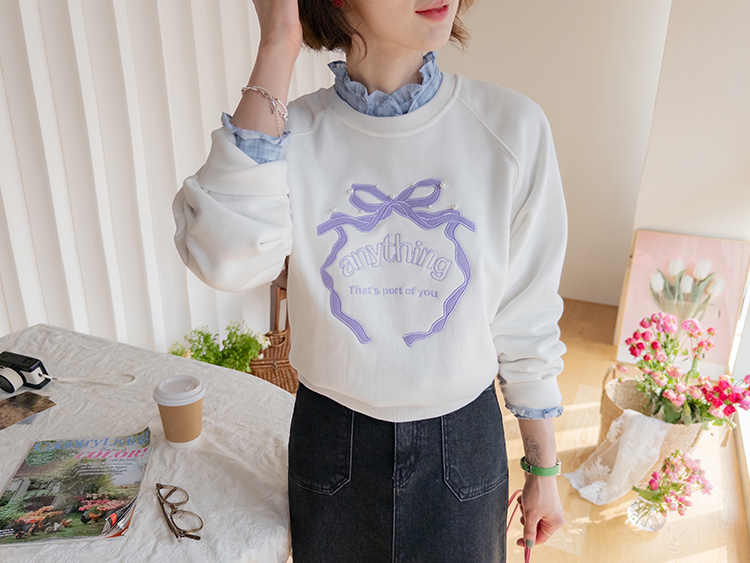 러블리한 감성이 돋보이는 리본 자수 맨투맨 소개드려요 ^^ 프론트 중앙에 더해진 리본 모양 자수와 레터링 디테일이 입체감 있게 포인트를 살려줘요~ 과하지 않은 디자인이라 캐주얼하면서도 은근히 사랑스러운 분위기로 데일리 코디에 딱 좋아요 ㅎㅎ 라운드 넥에 래글런 소매 라인으로 어깨선은 부드럽게 떨어지고 전체 실루엣은 깔끔하게 정리돼요 굿초이스 해주세요 ♥
