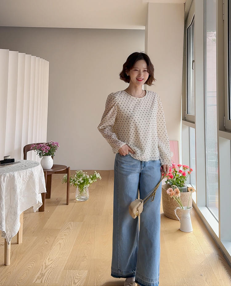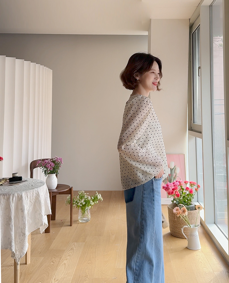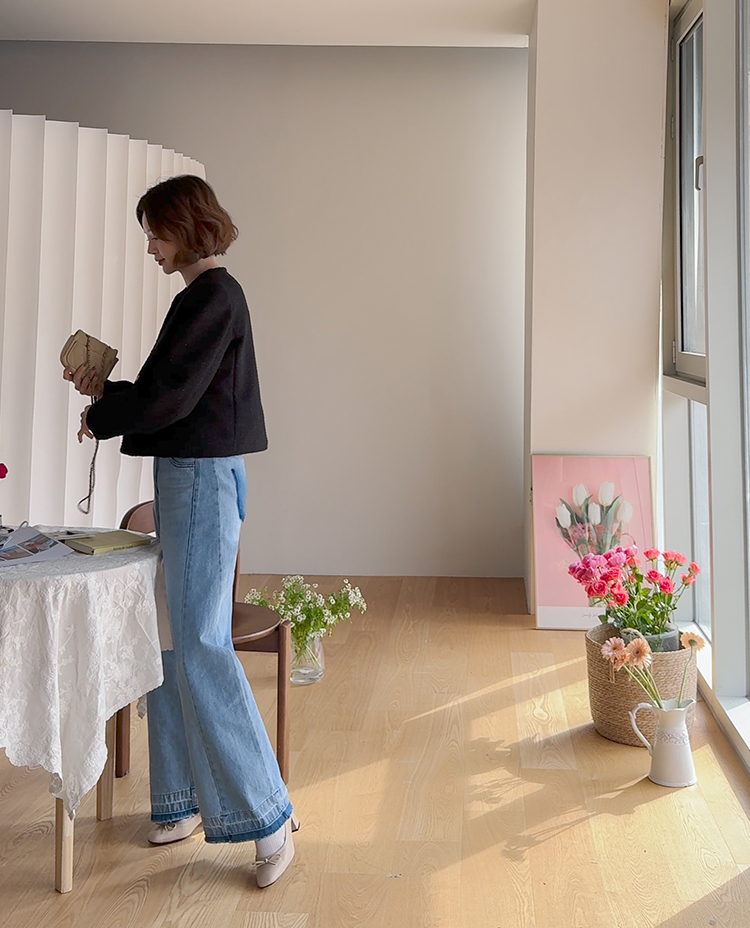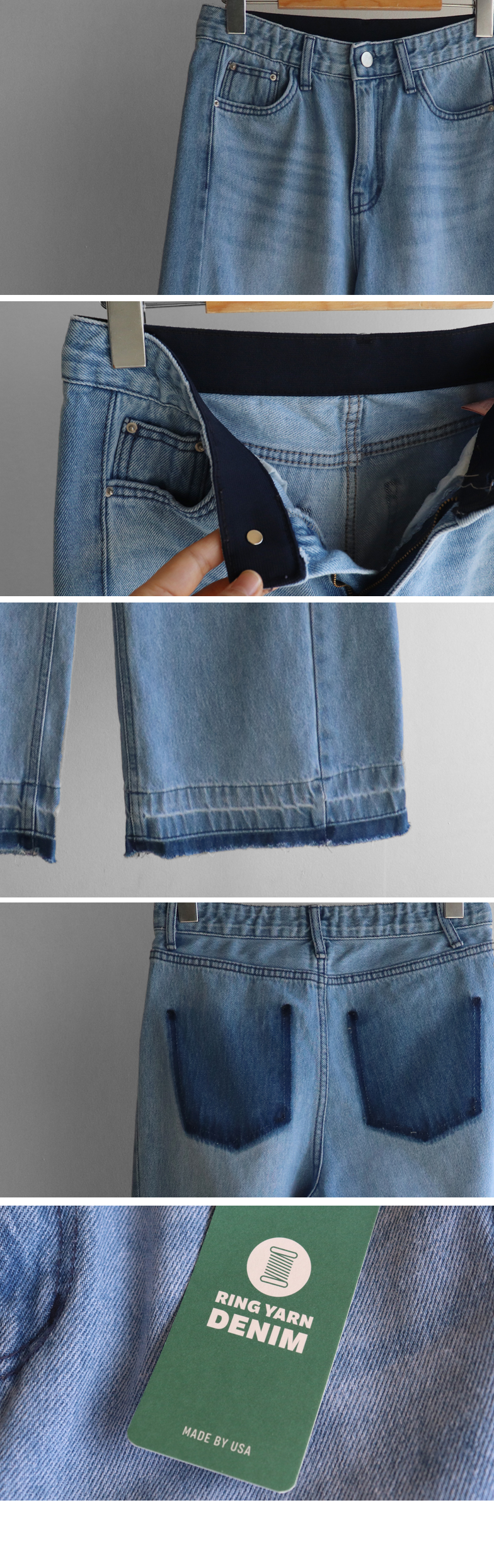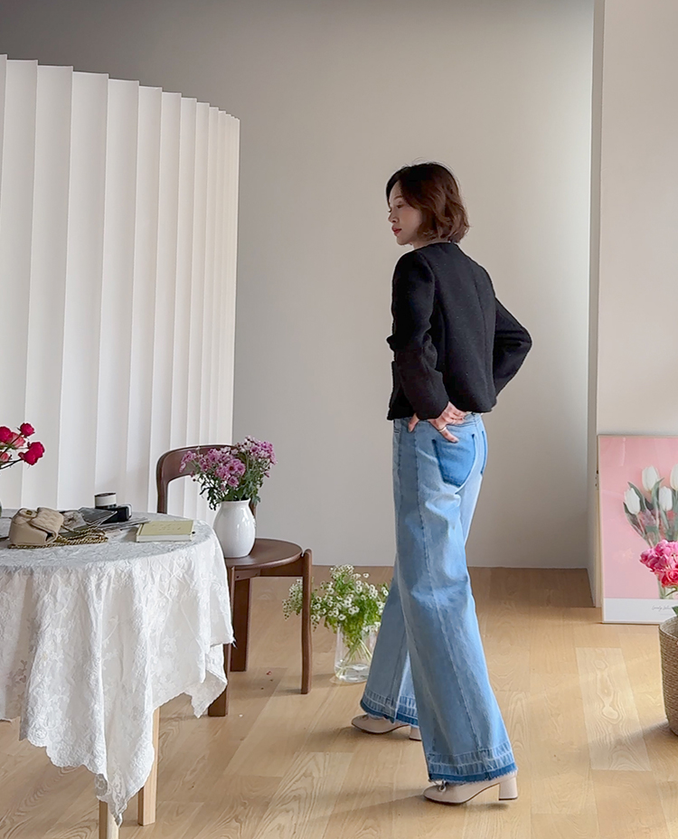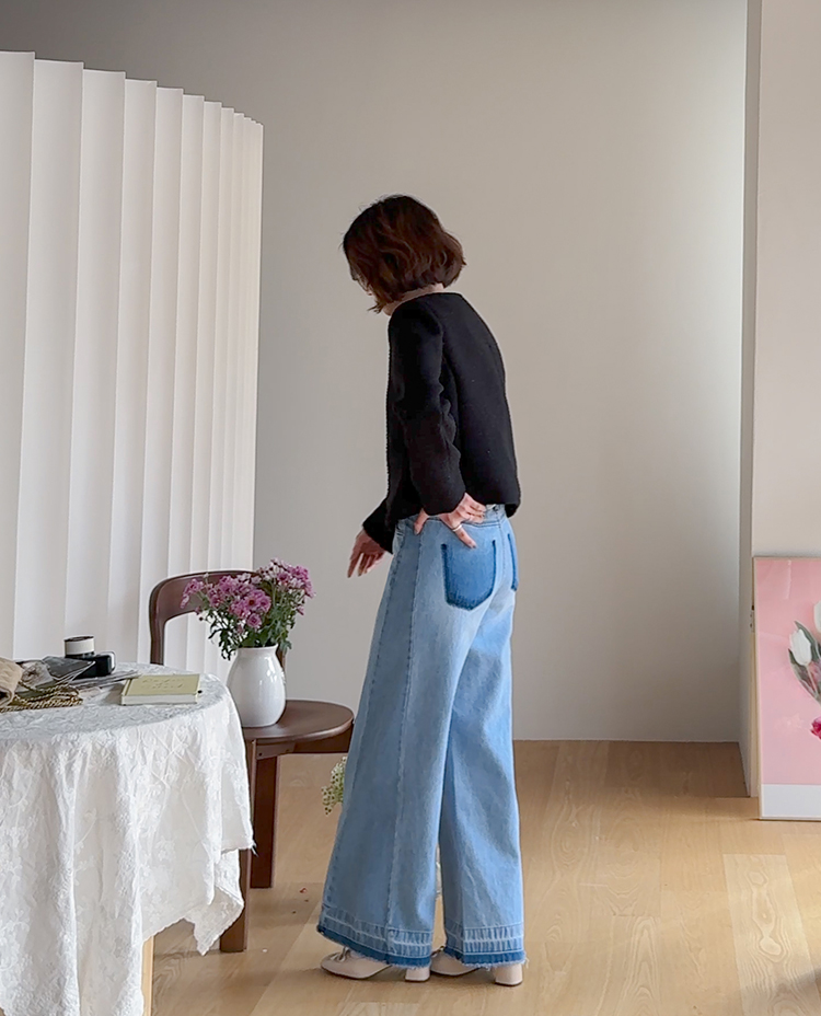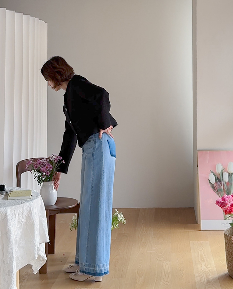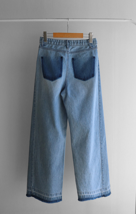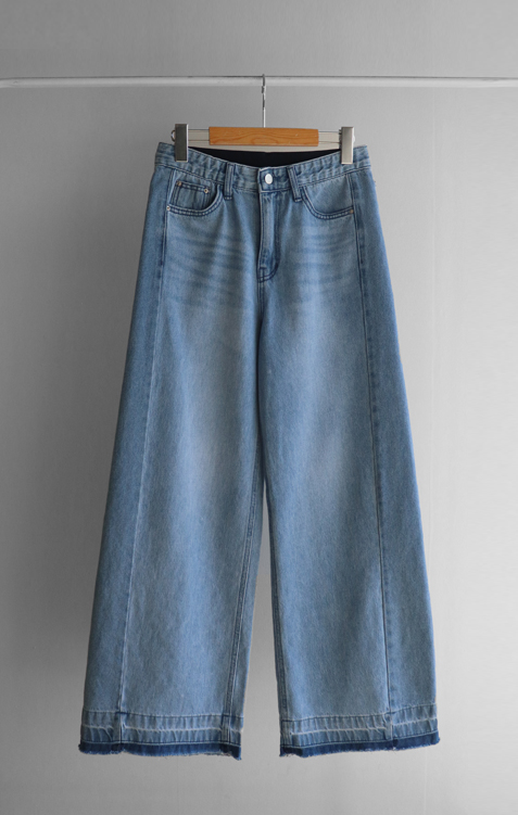 허리를 안정감 있게 잡아주는 하이웨스트 라인에 허벅지부터 여유있게 떨어지는 와이드 핏 팬츠예요 :) 밝은 워싱 컬러감이 전체적으로 화사한 인상을 주고 다리 라인을 자연스럽게 커버해줘 편안하게 착용돼요. 밑단에 더해진 레이어드 느낌의 디테일이 은근한 포인트가 되어주며, 뒷포켓 배색 디자인으로 뒷모습까지 밋밋하지 않게 완성해주는 아이템이에요 ♡