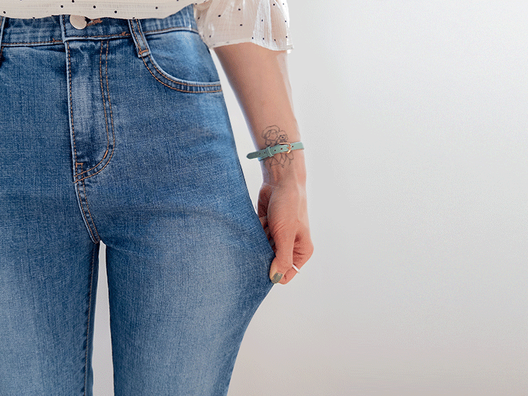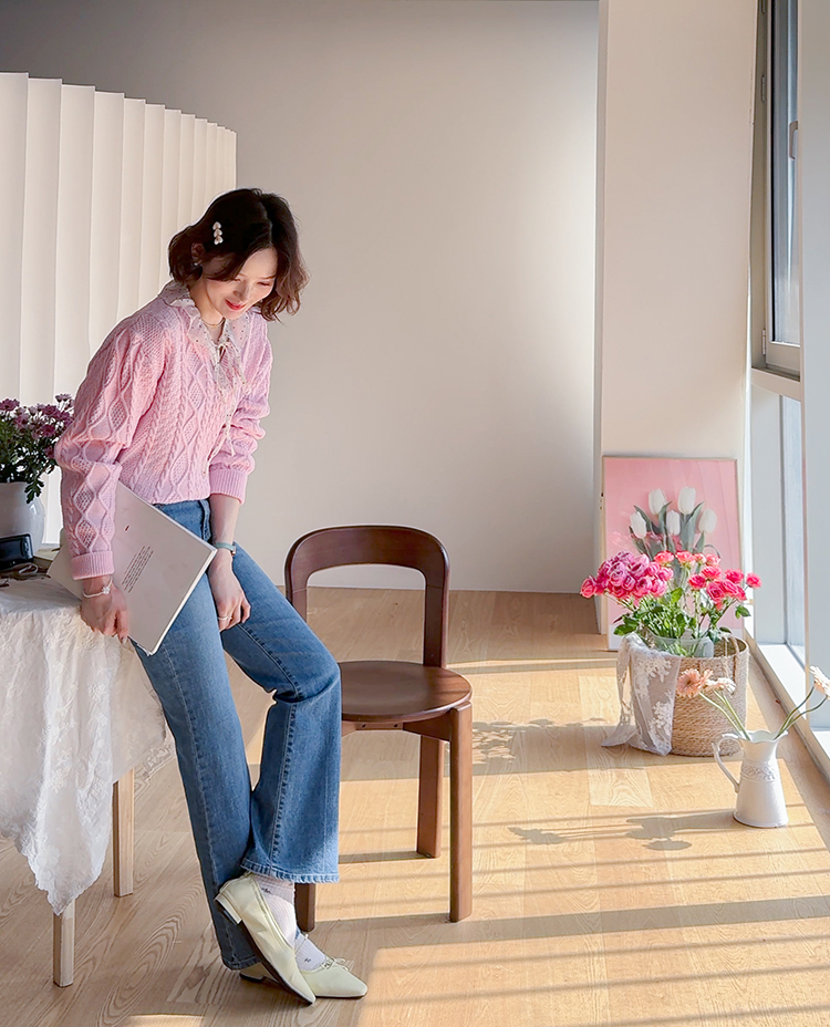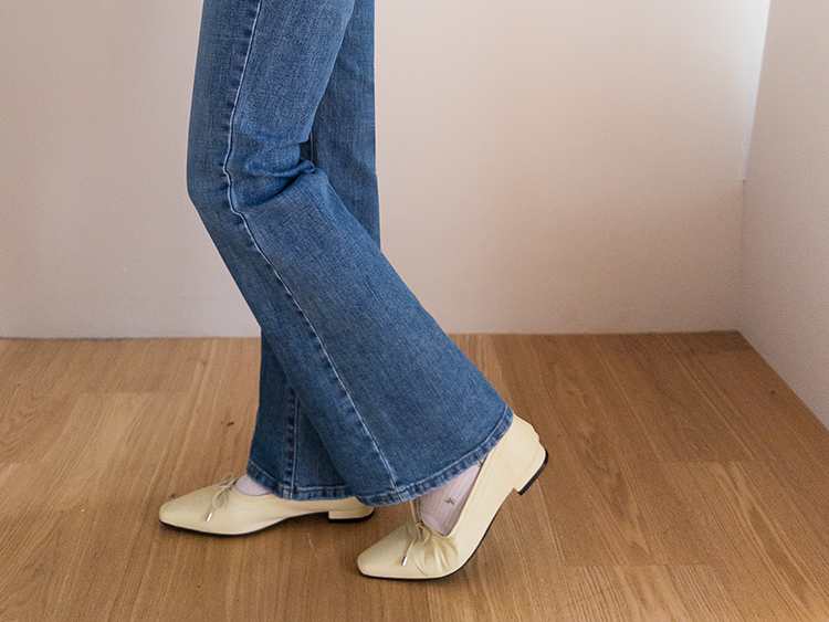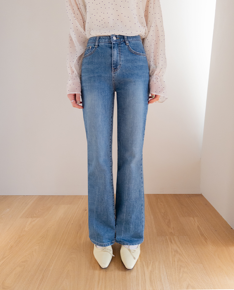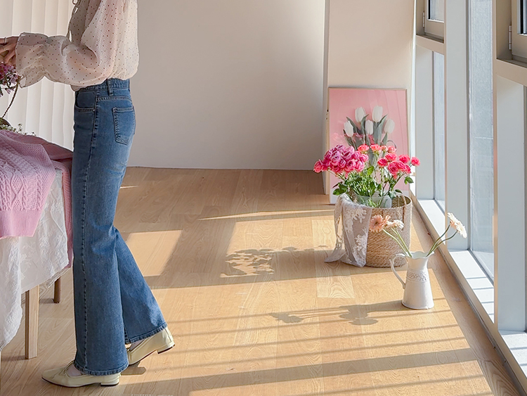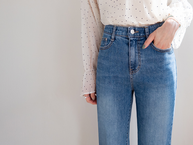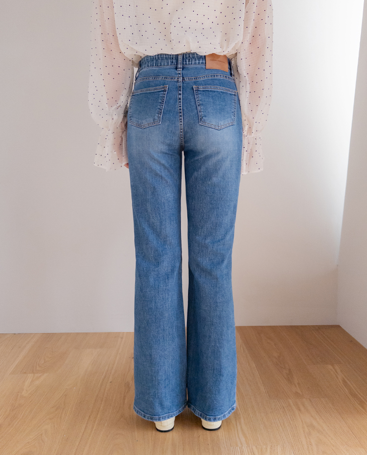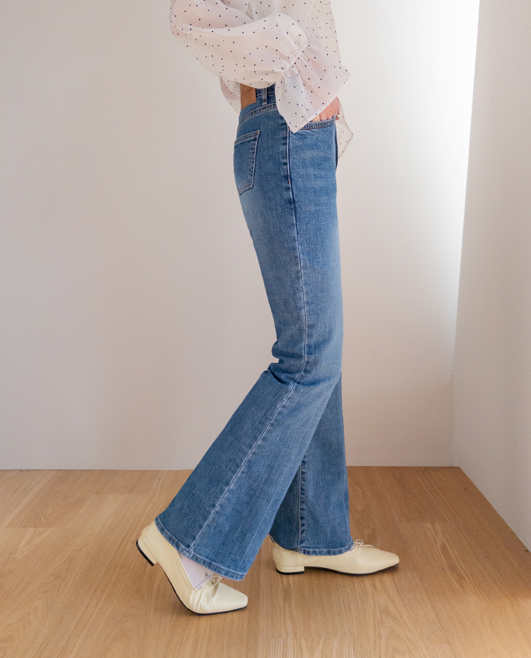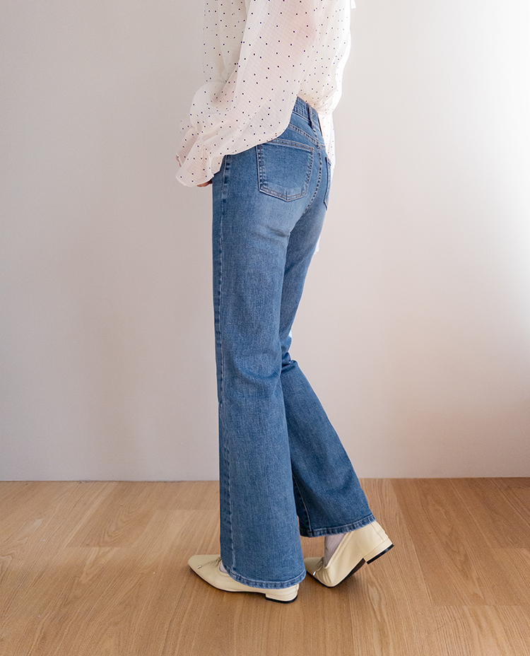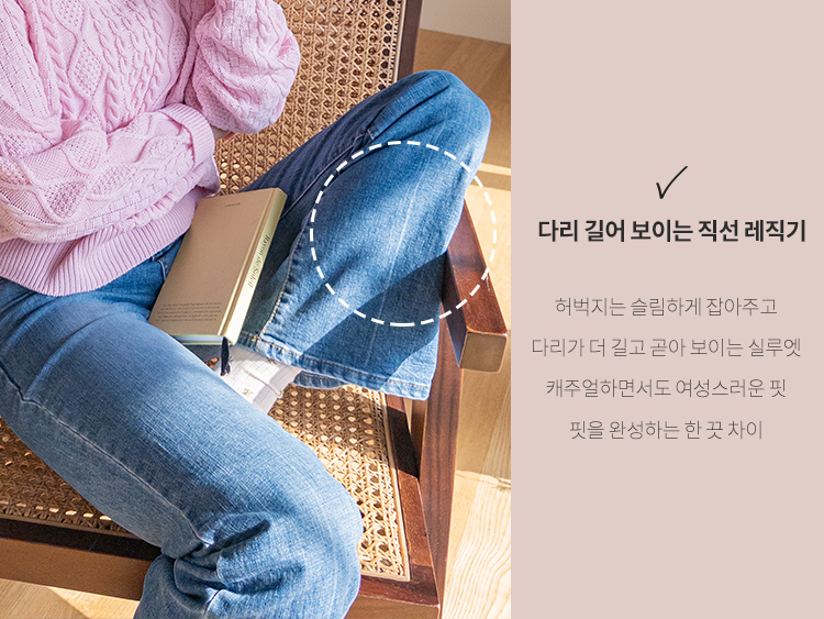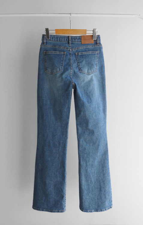 무릎 아래부터 자연스럽게 퍼지는 세미 부츠컷 데님이에요 :) 허벅지 라인은 슬림하게 잡아주고 밑단은 은은하게 퍼져 다리가 더욱 길어보여요. 과하지 않은 라인으로 부담 없이 데일리로 즐기기 좋구요. 블라우스, 맨투맨 어디에나 잘 어울려 손이 자주 가는 기본 데님이에요 ♡