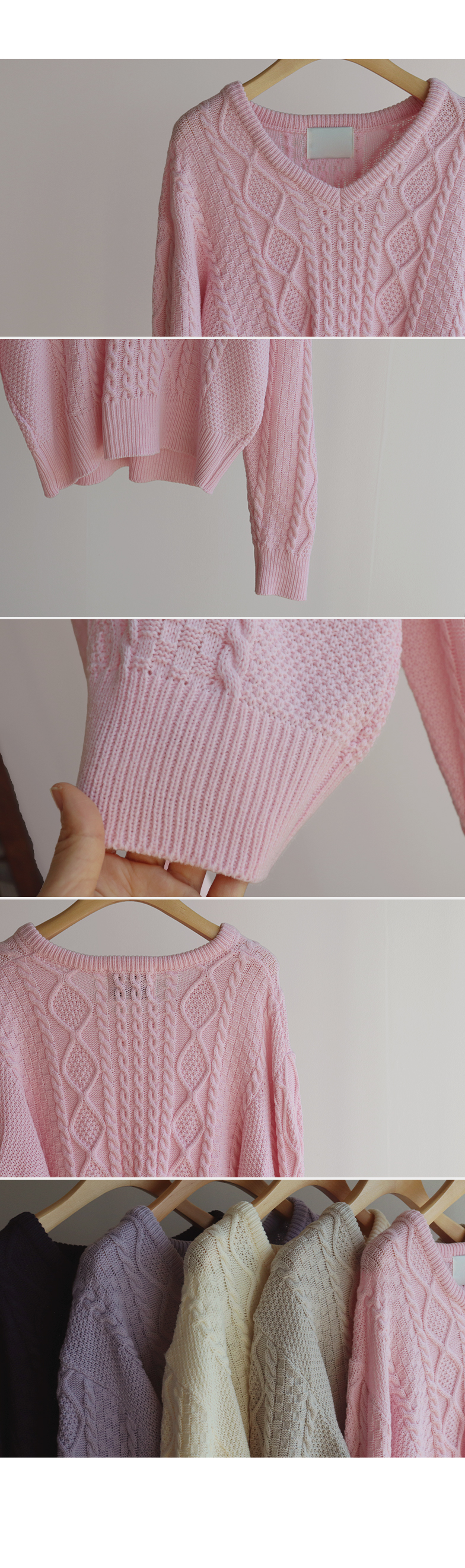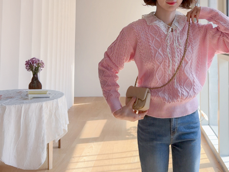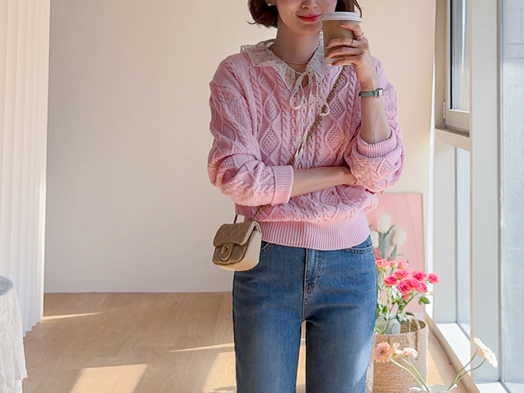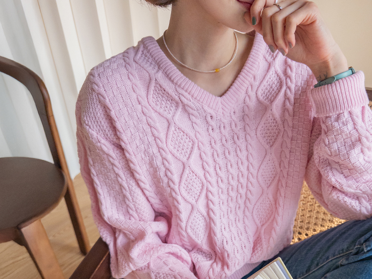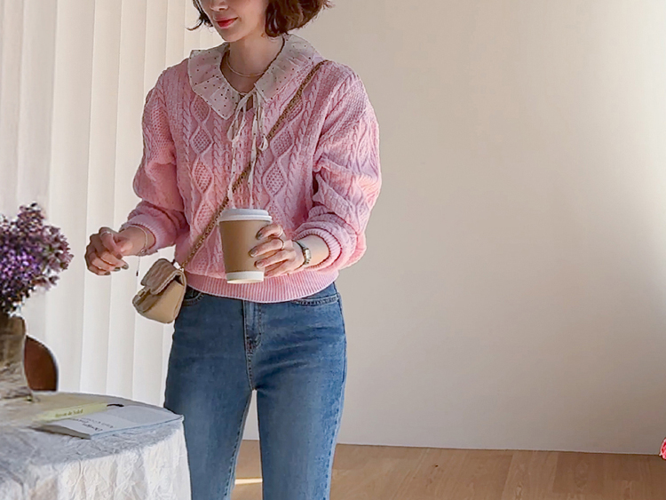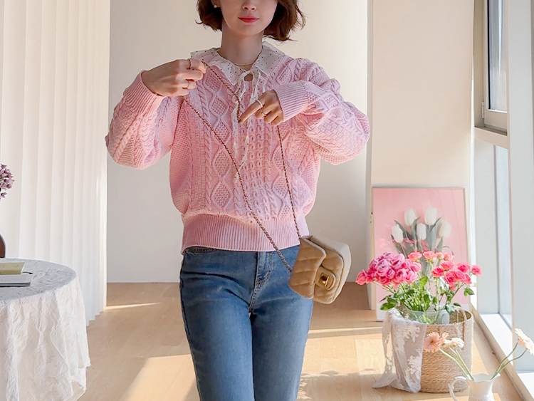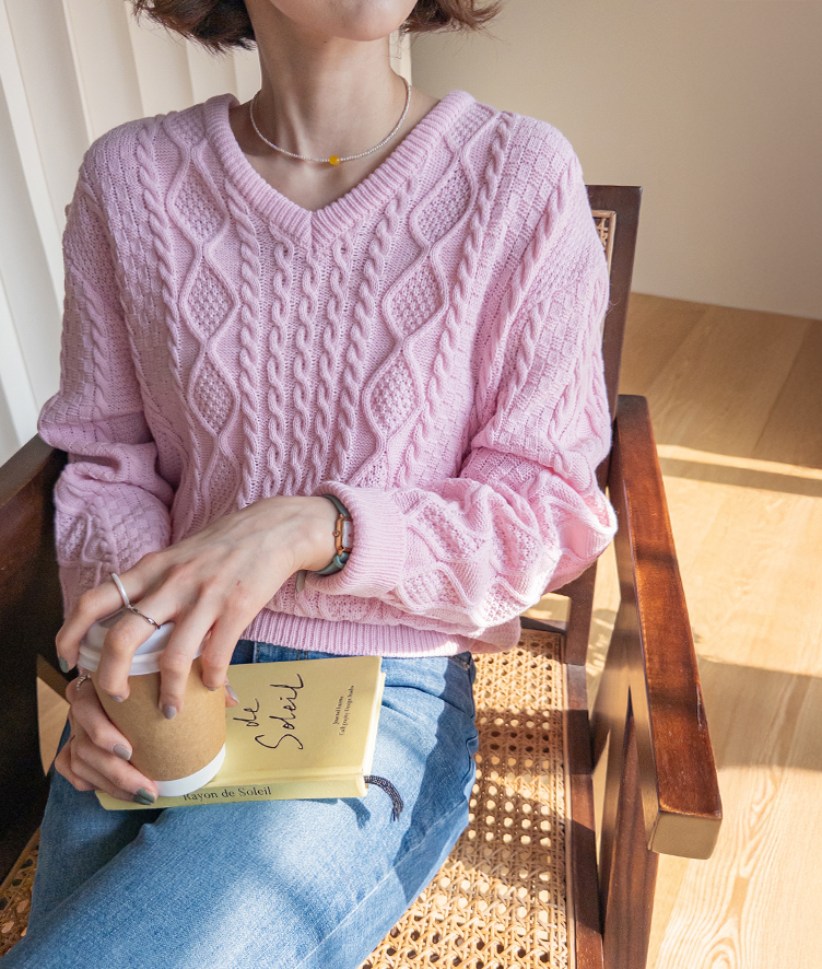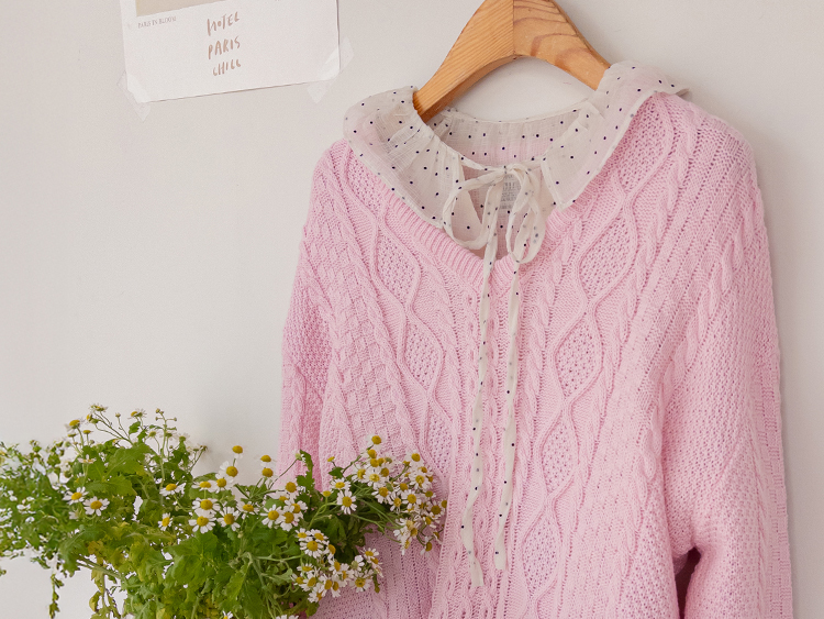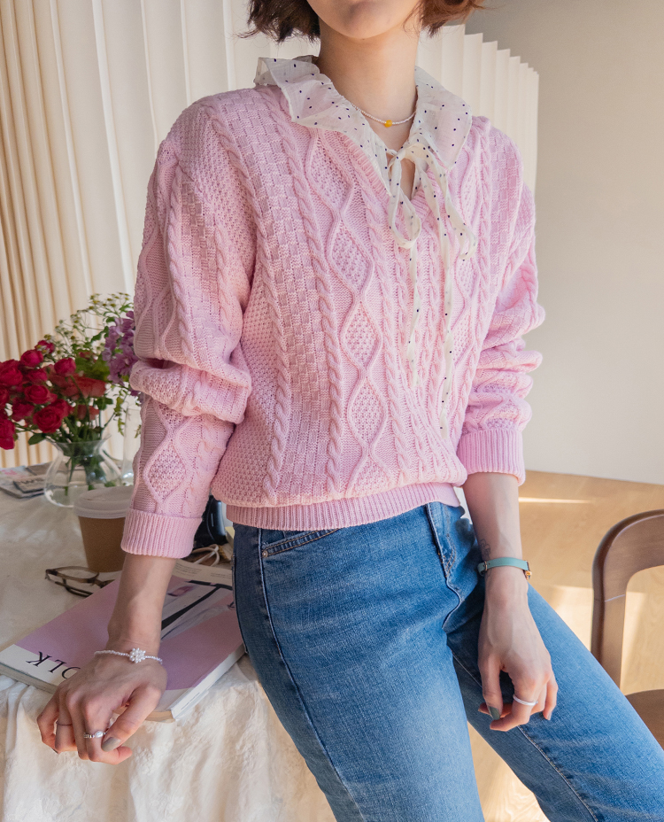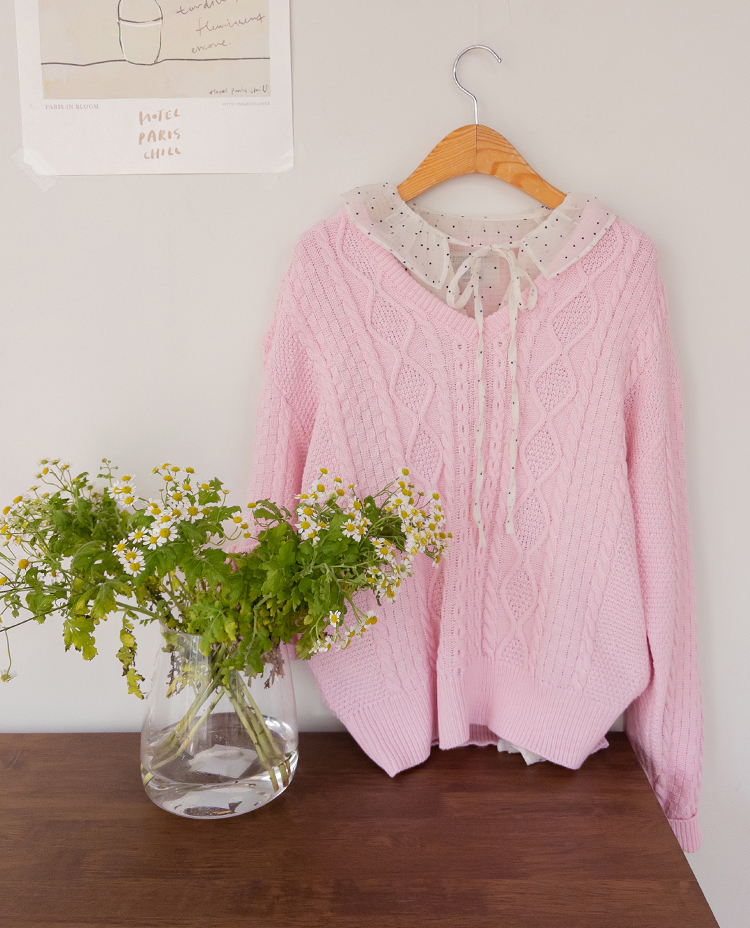 입체감 있는 케이블 짜임이 매력적인 니트예요 :) 부드러운 핑크 컬러감이 얼굴빛을 환하게 밝혀주구요. 카라 디테일이 더해져 단독으로 입어도 밋밋함 없이 포인트가 되어줘요. 블라우스와 함께 레이어드하면 더욱 사랑스러운 코디가 완성돼요 ♡