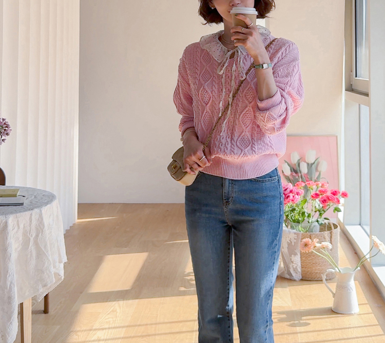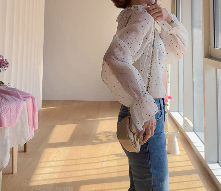 브이넥 라인이 답답함 없이 목선을 더욱 가늘어 보이게 연출해주는 블라우스예요 :) 잔잔하게 들어간 도트 패턴이 과하지 않게 포인트가 되어주구요. 넥 라인의 스트링 디테일로 리본 연출 또는 자연스럽게 풀어 다양한 분위기로 착용 가능해요. 가볍게 흐르는 소재감 덕분에 단독으로 입어도 여리여리한 실루엣이 살아나는 아이템이에요 ♡