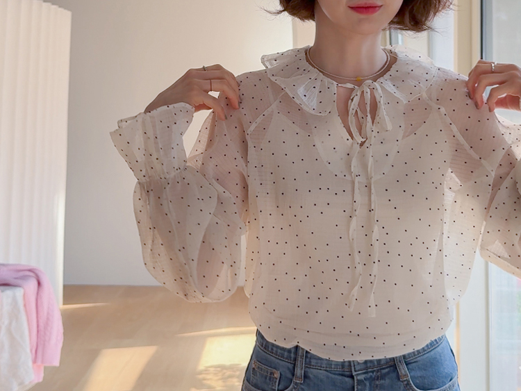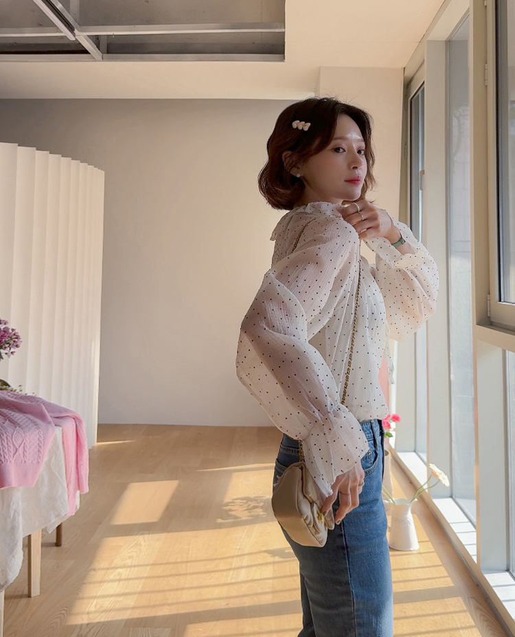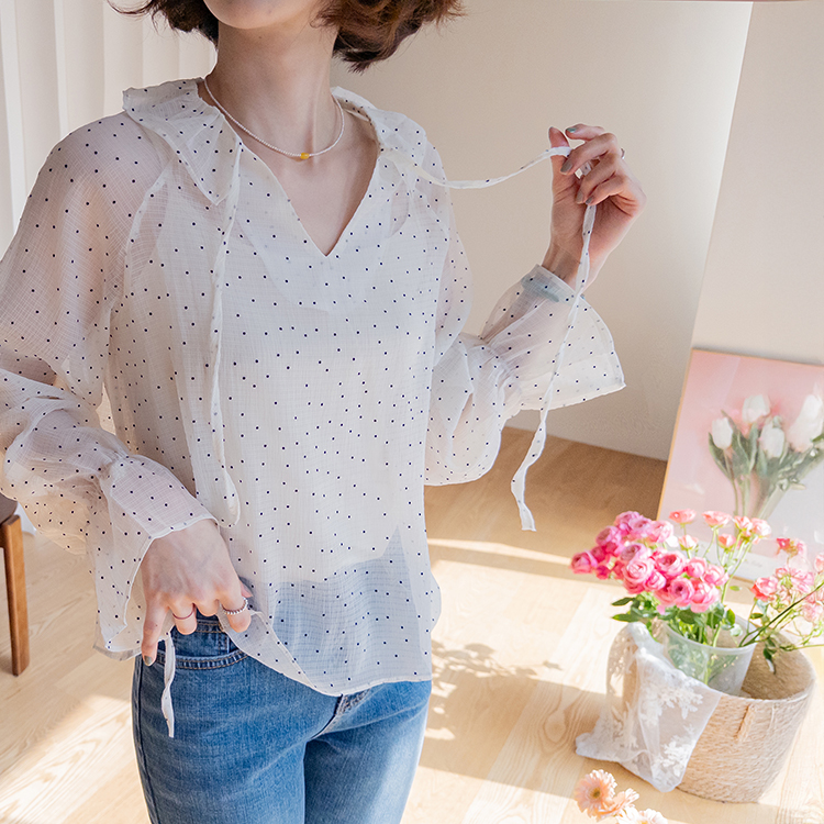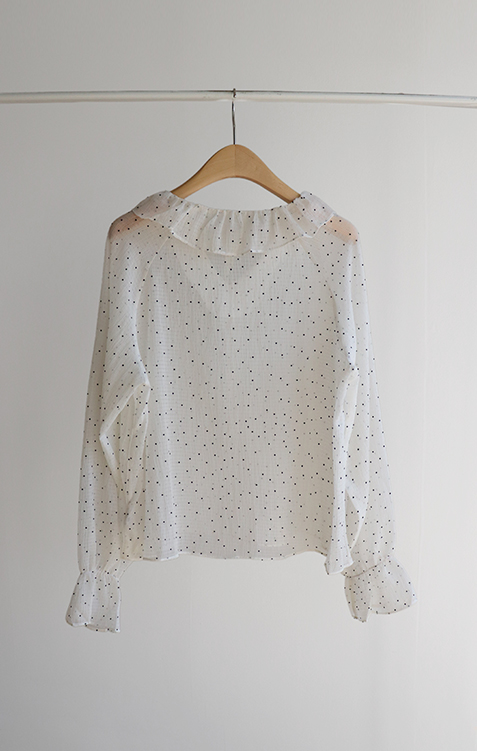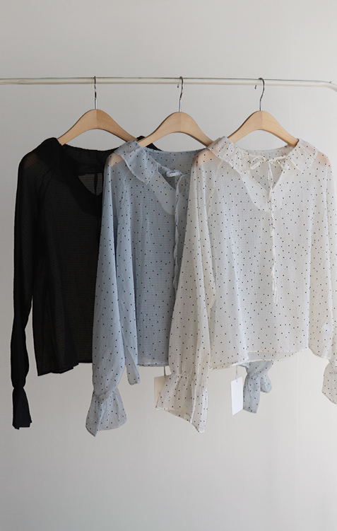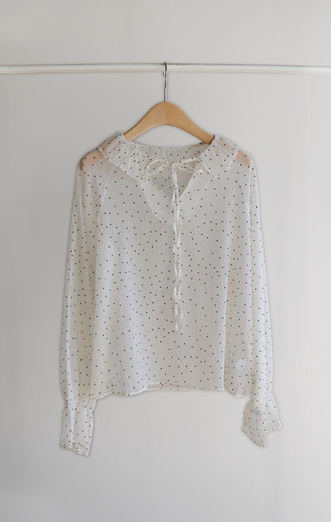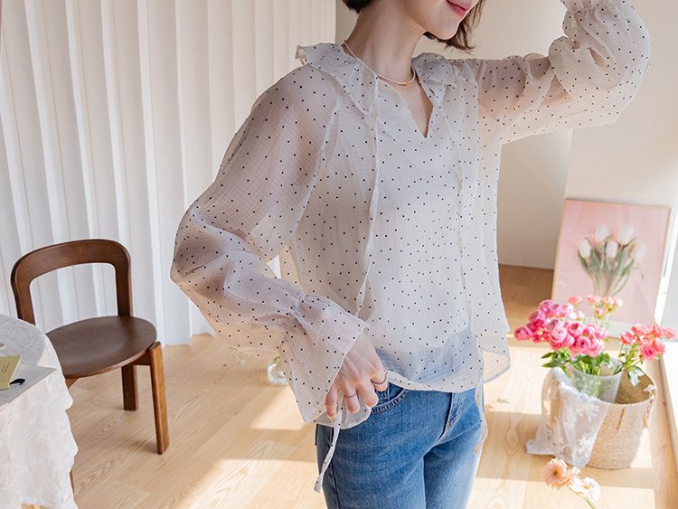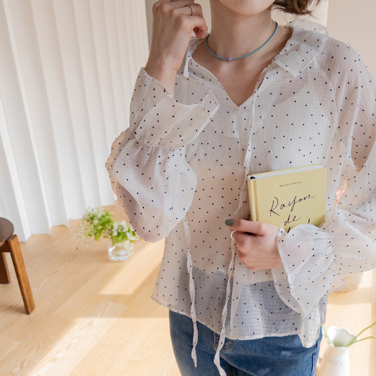 브이넥 라인이 답답함 없이 목선을 더욱 가늘어 보이게 연출해주는 블라우스예요 :) 잔잔하게 들어간 도트 패턴이 과하지 않게 포인트가 되어주구요. 넥 라인의 스트링 디테일로 리본 연출 또는 자연스럽게 풀어 다양한 분위기로 착용 가능해요. 가볍게 흐르는 소재감 덕분에 단독으로 입어도 여리여리한 실루엣이 살아나는 아이템이에요 ♡