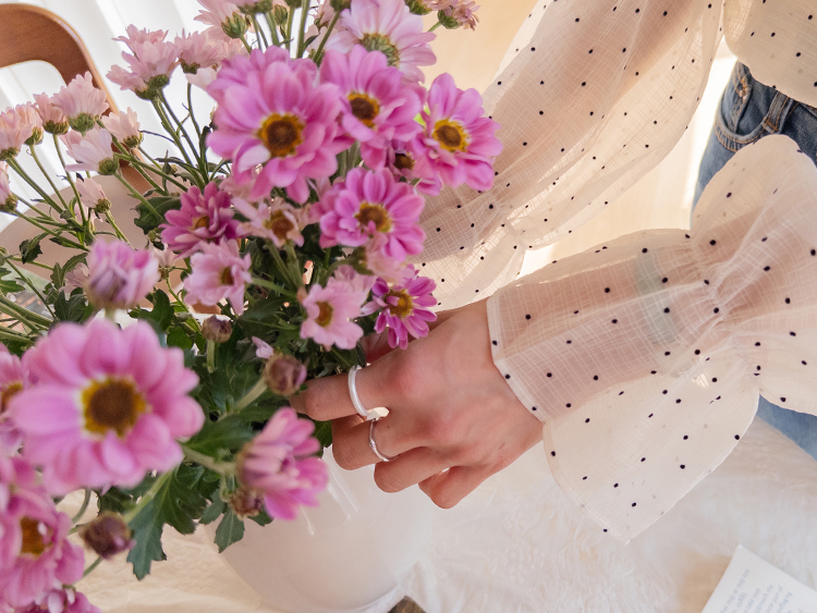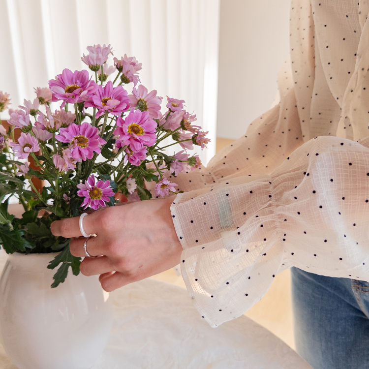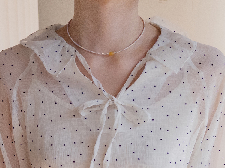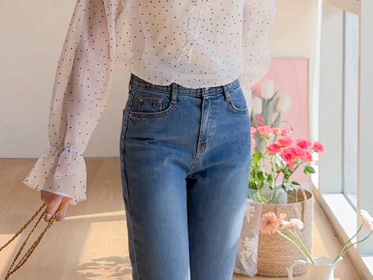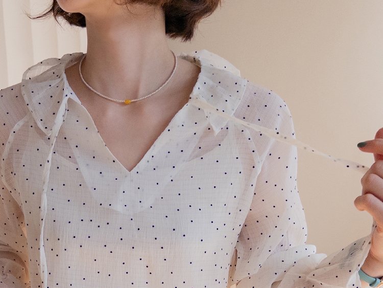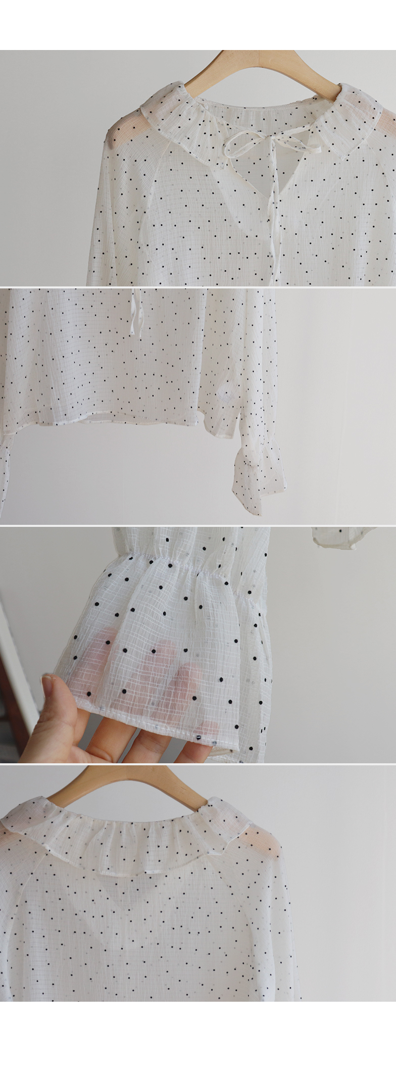 브이넥 라인이 답답함 없이 목선을 더욱 가늘어 보이게 연출해주는 블라우스예요 :) 잔잔하게 들어간 도트 패턴이 과하지 않게 포인트가 되어주구요. 넥 라인의 스트링 디테일로 리본 연출 또는 자연스럽게 풀어 다양한 분위기로 착용 가능해요. 가볍게 흐르는 소재감 덕분에 단독으로 입어도 여리여리한 실루엣이 살아나는 아이템이에요 ♡