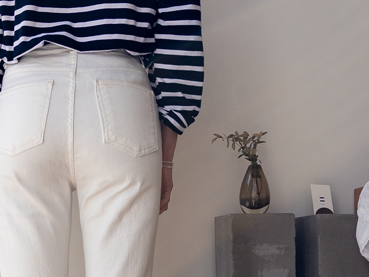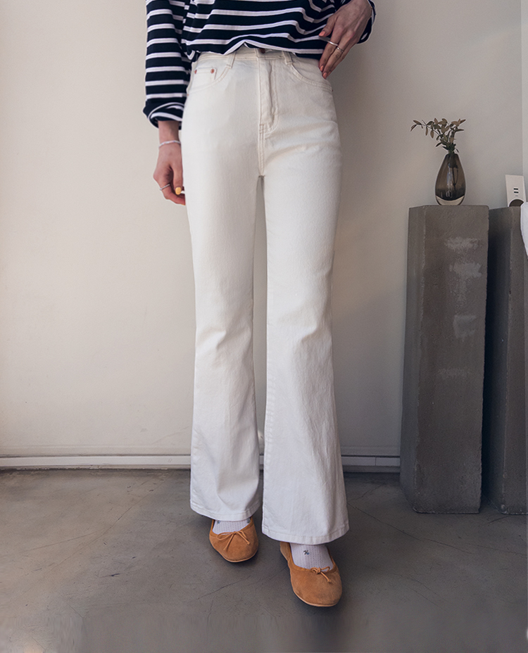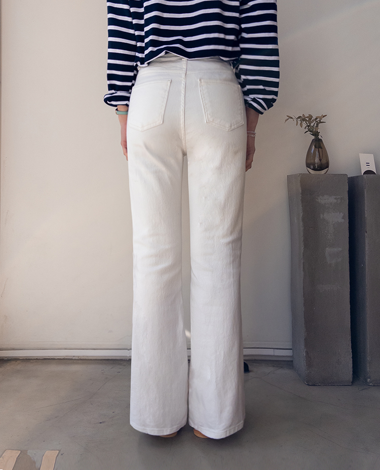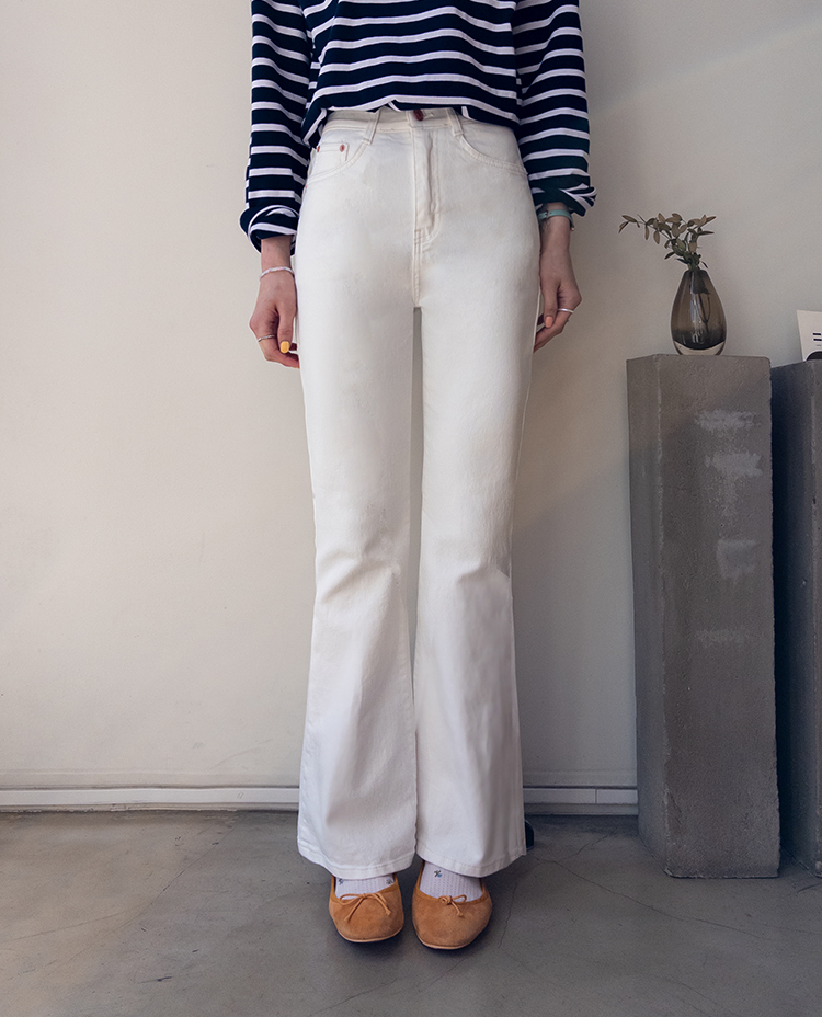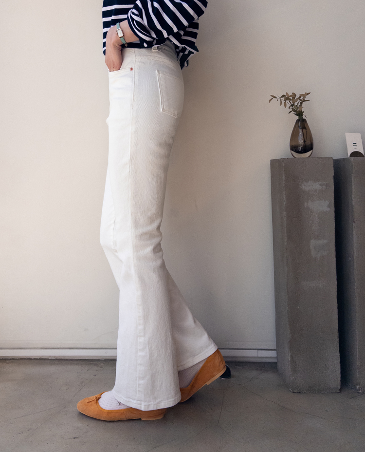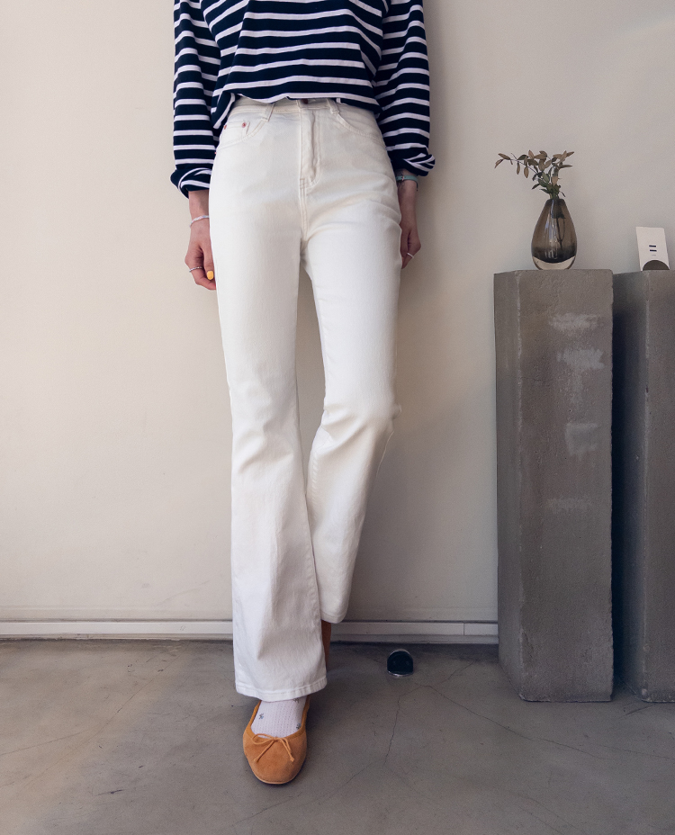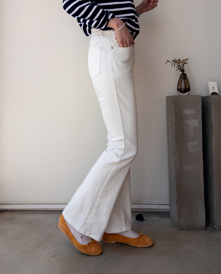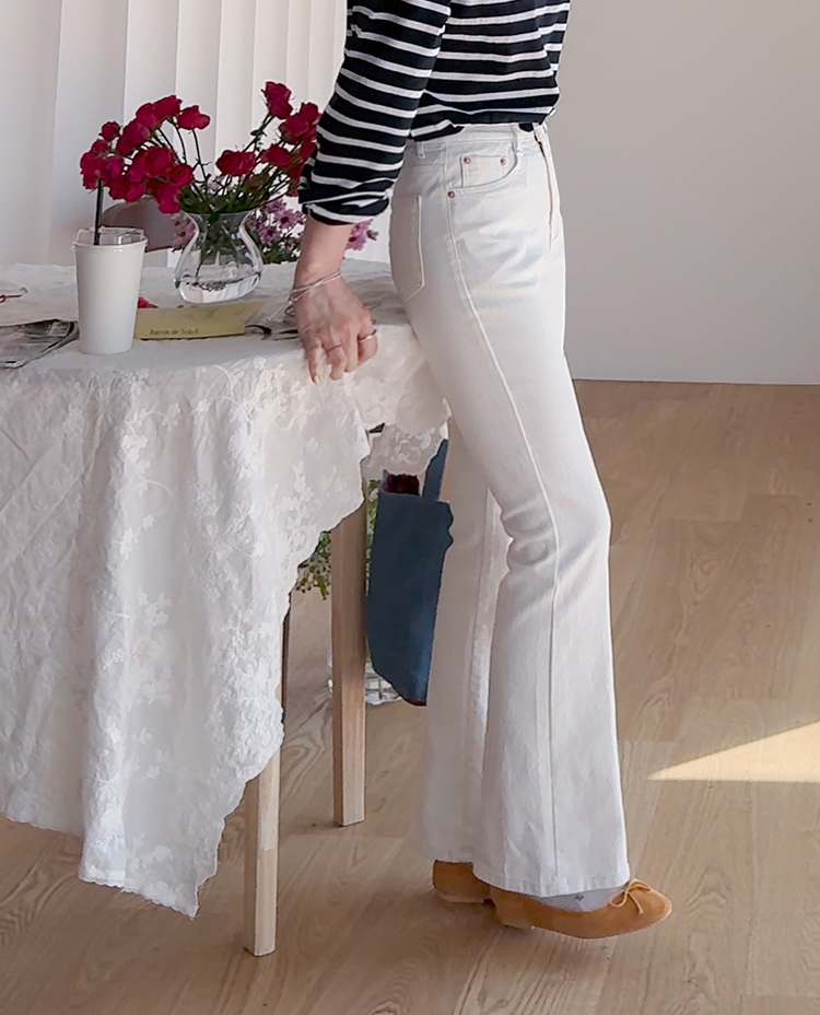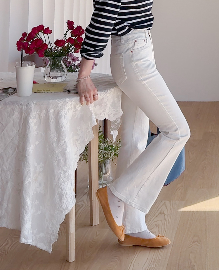 허벅지 라인은 잡아주고 밑단으로 갈수록 자연스럽게 퍼지는 세미 부츠컷 팬츠예요 :) 과하게 퍼지지 않아 부담 없으면서도 다리 라인을 한층 더 길어 보이게 연출해주구요. 허리와 힙을 안정감 있게 잡아줘 전체적인 실루엣이 깔끔하게 정리돼요. 어떤 상의와도 잘 어울려 데일리 팬츠로 추천드리는 아이템이에요 ♡