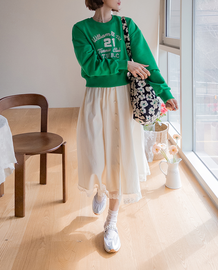 비비드한 컬러감이 시선을 사로잡는 레터링 맨투맨이에요 :) 여유있게 떨어지는 핏으로 부담 없이 입기 좋고 자연스럽게 체형을 커버해주구요. 탄탄한 코튼 소재로 늘어짐 걱정 없이 데일리하게 즐기기 좋아요. 원피스 위에 레이어드해도 예쁘고 데님, 스커트 어디에나 매치하기 좋은 활용도 높은 아이템이에요 ♡