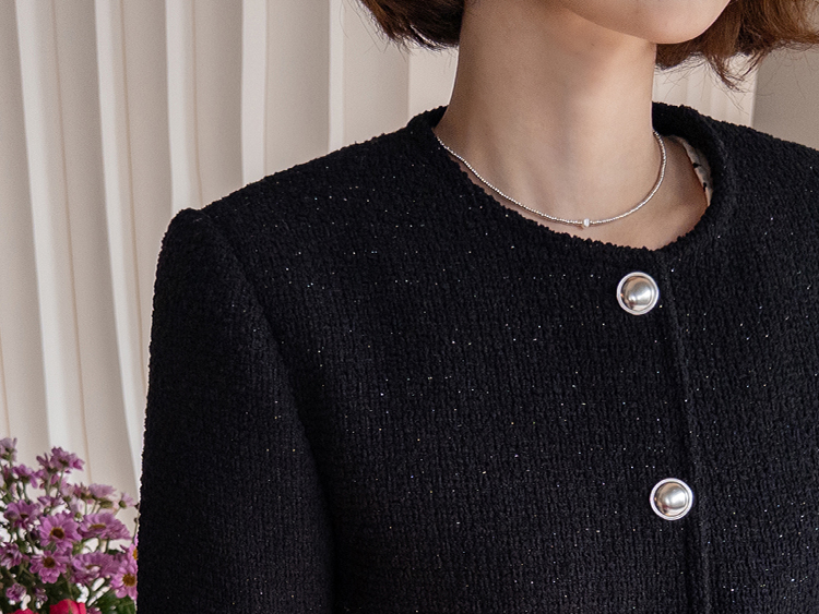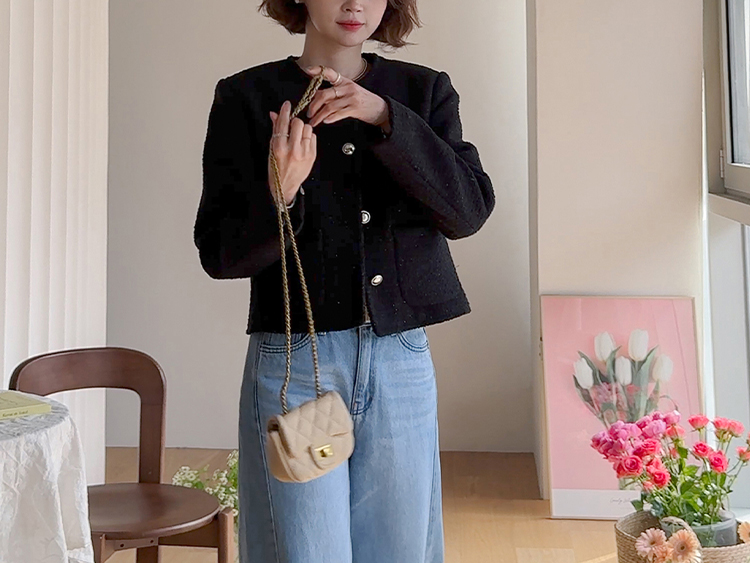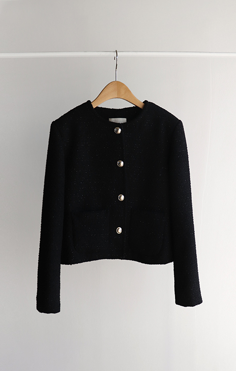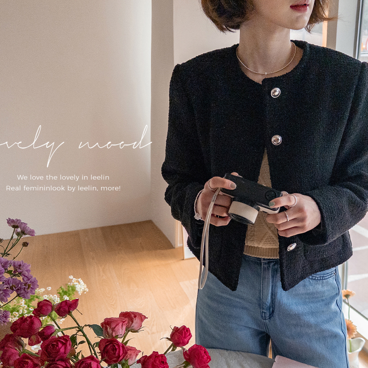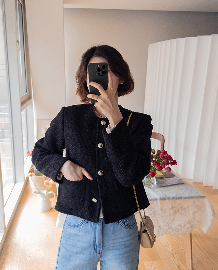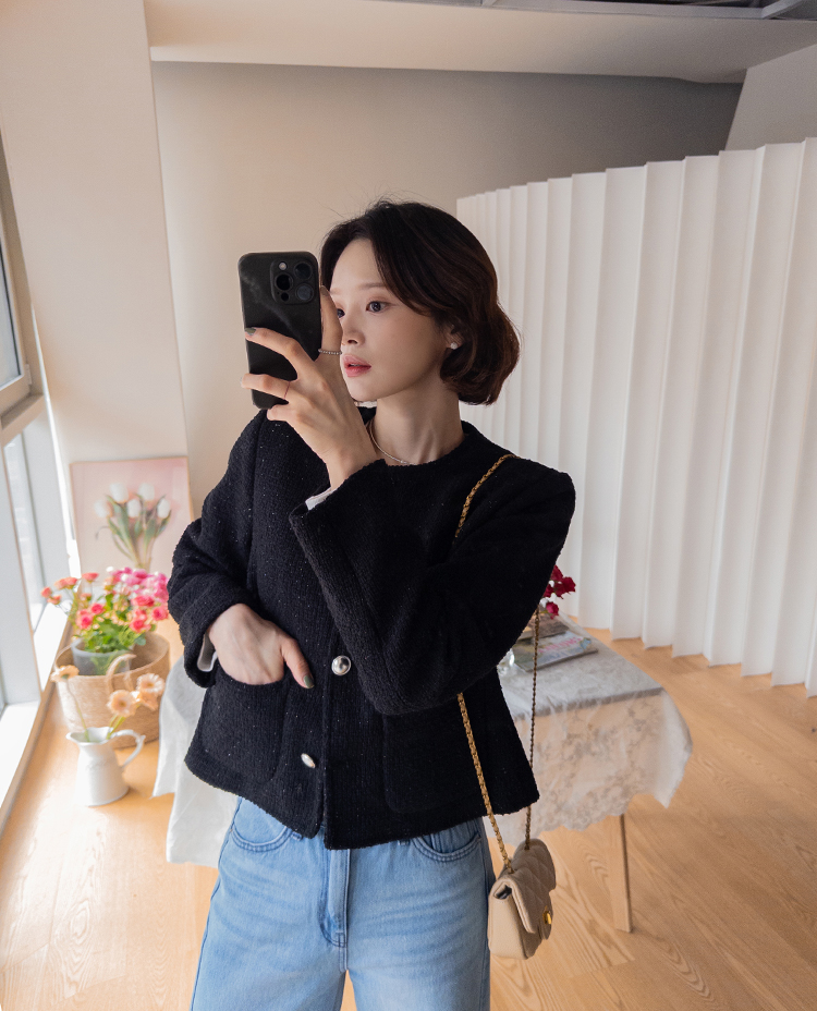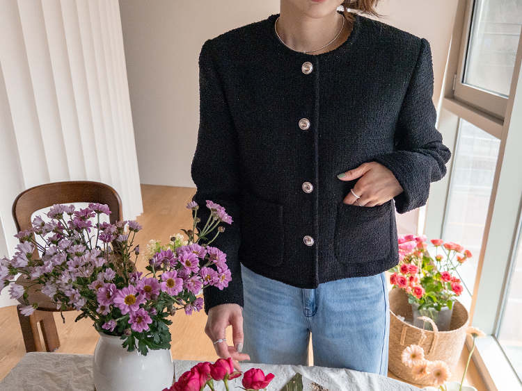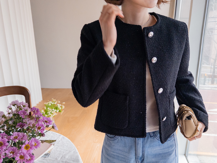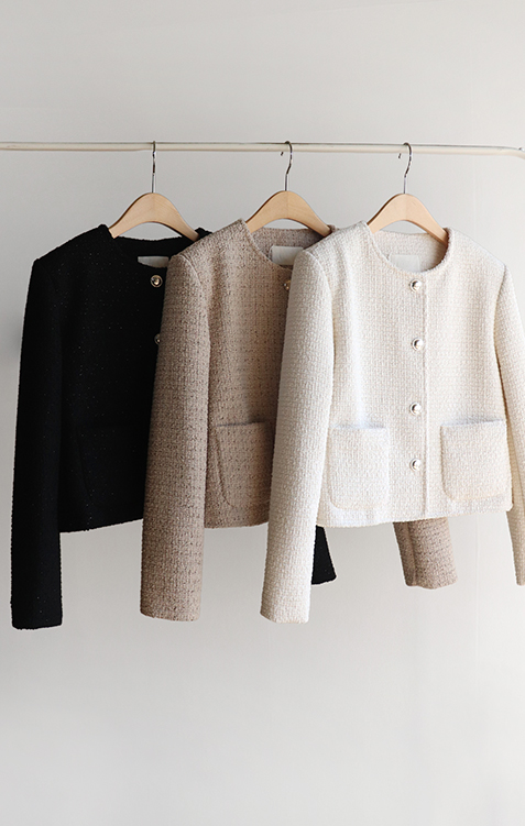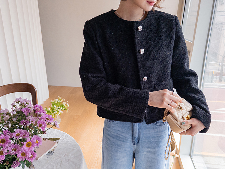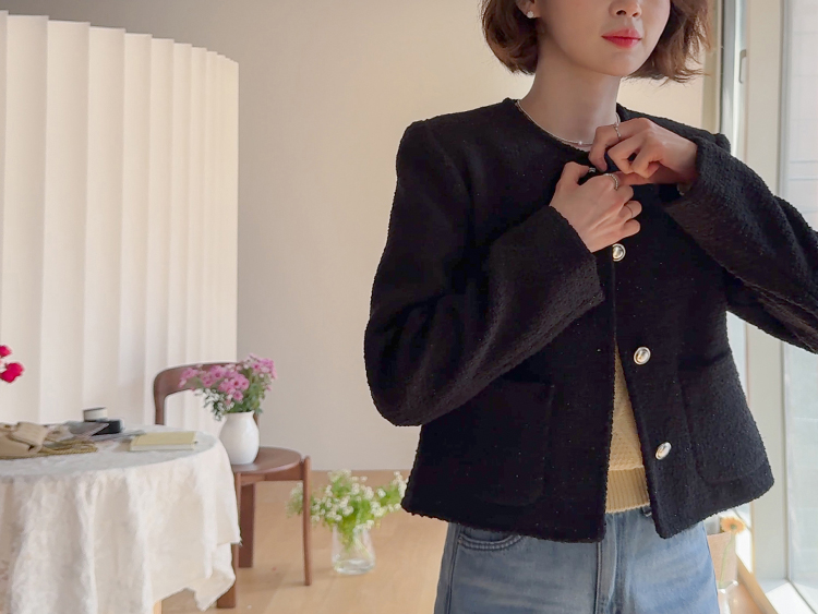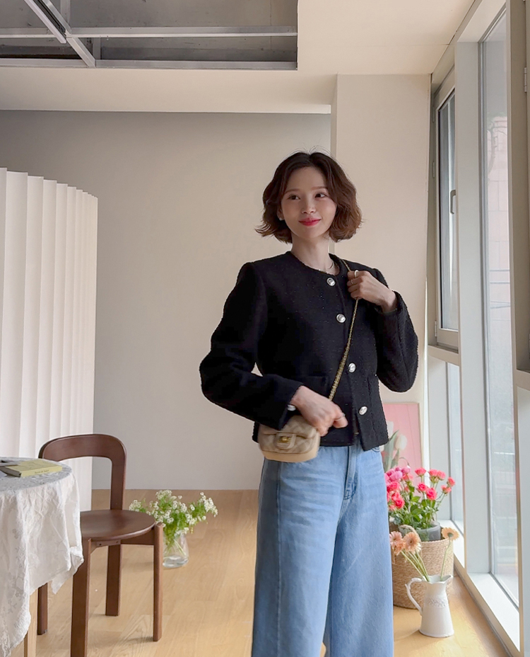 촘촘한 짜임이 돋보이는 트위드 원단으로 단정하면서도 클래식한 분위기가 느껴지는 자켓이에요 :) 군더더기 없이 정돈된 라운드 넥 라인과 은은하게 빛나는 버튼 디테일이 세련된 포인트가 되어주구요. 골반 위로 살짝 올라오는 세미크롭 기장이라 스커트, 팬츠와 매치했을 때 다리가 길어보여요. 하객룩, 데이트룩은 물론 데님과 캐주얼하게 믹스해도 잘 어울리는 아이템이에요 ♡