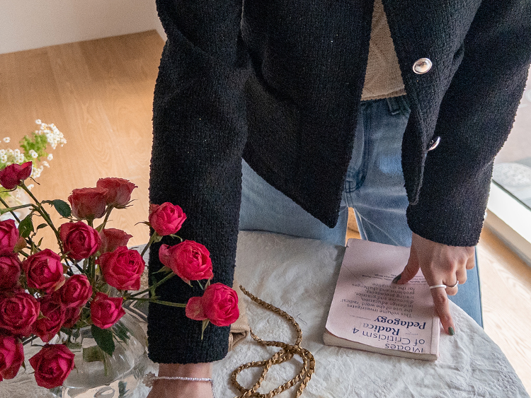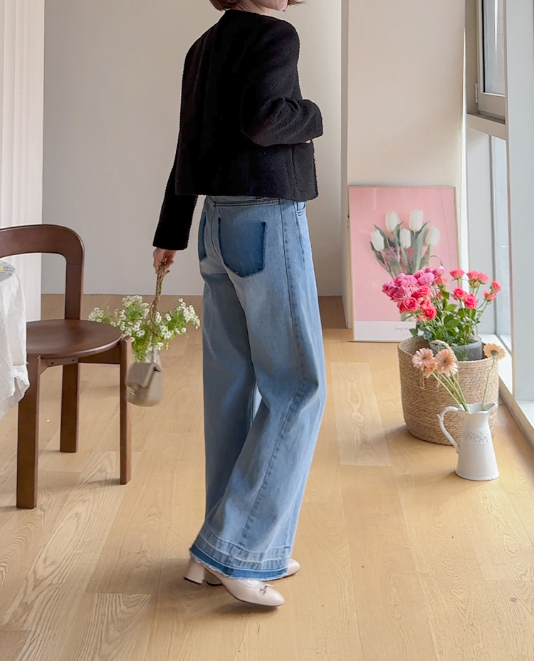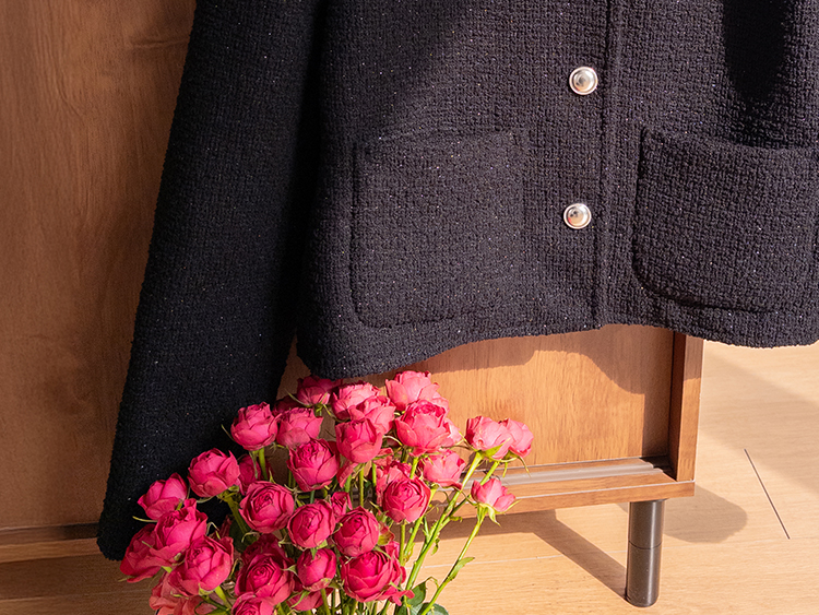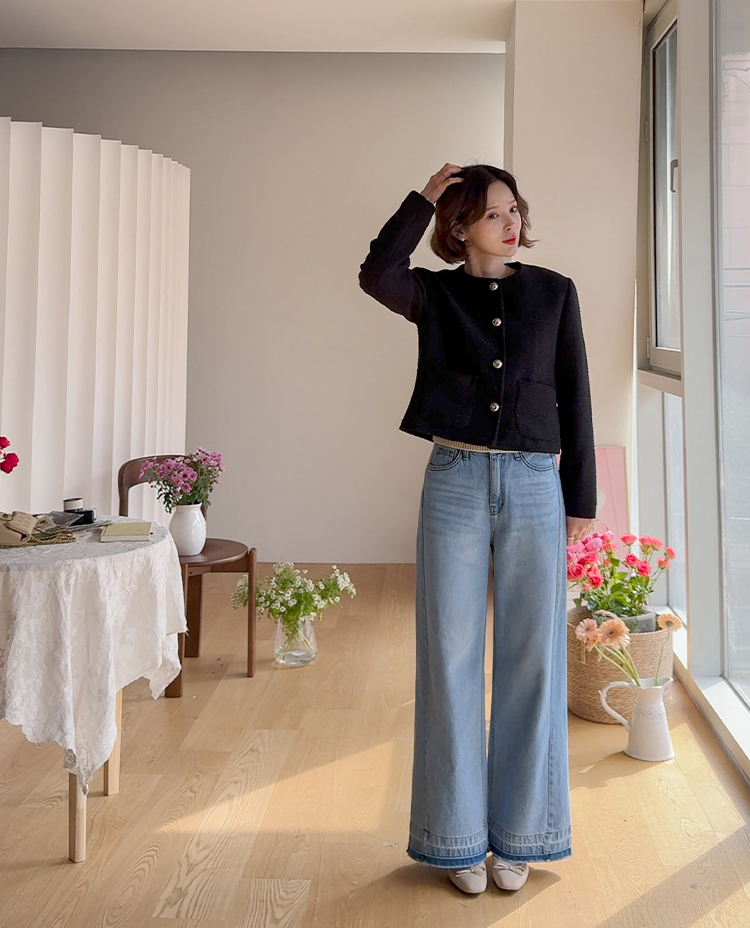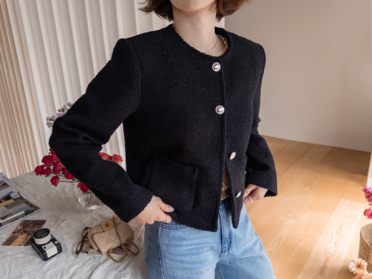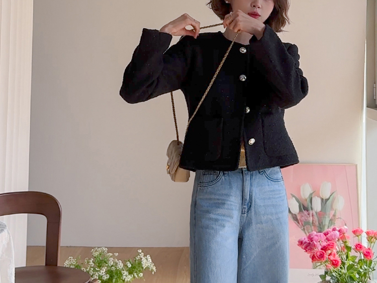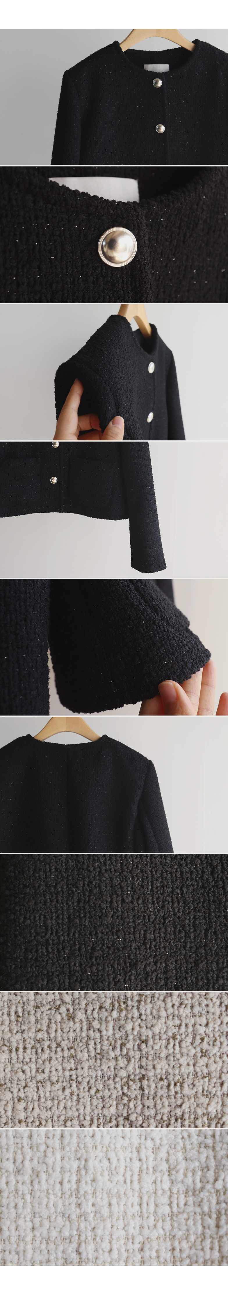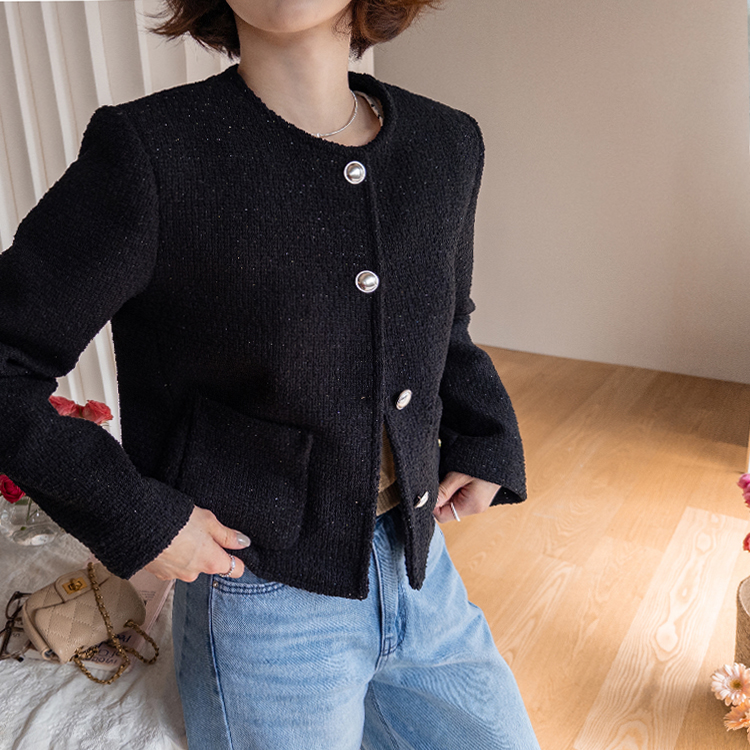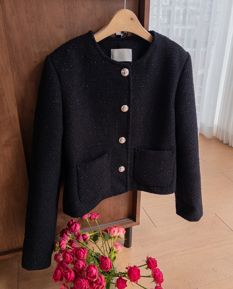 촘촘한 짜임이 돋보이는 트위드 원단으로 단정하면서도 클래식한 분위기가 느껴지는 자켓이에요 :) 군더더기 없이 정돈된 라운드 넥 라인과 은은하게 빛나는 버튼 디테일이 세련된 포인트가 되어주구요. 골반 위로 살짝 올라오는 세미크롭 기장이라 스커트, 팬츠와 매치했을 때 다리가 길어보여요. 하객룩, 데이트룩은 물론 데님과 캐주얼하게 믹스해도 잘 어울리는 아이템이에요 ♡