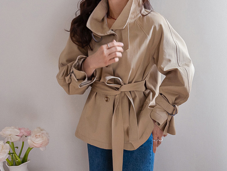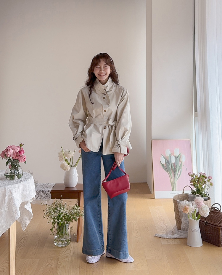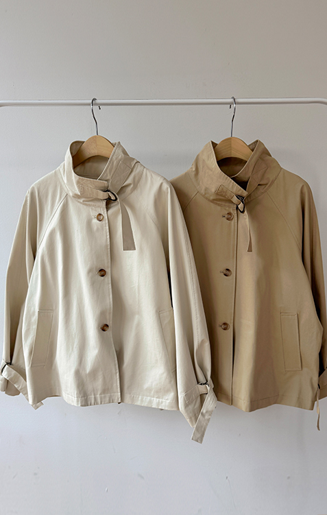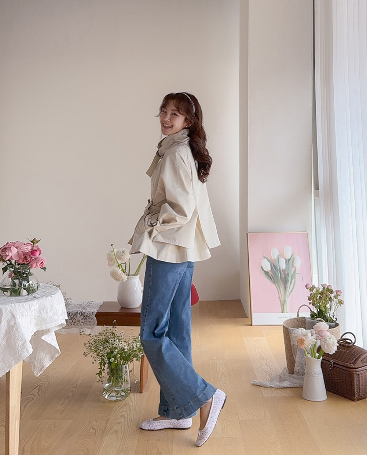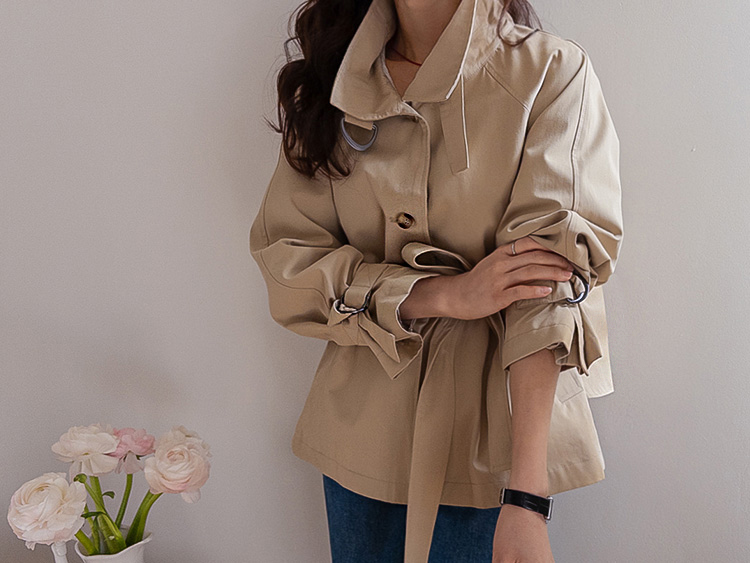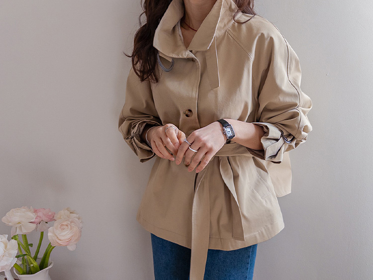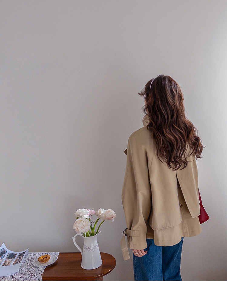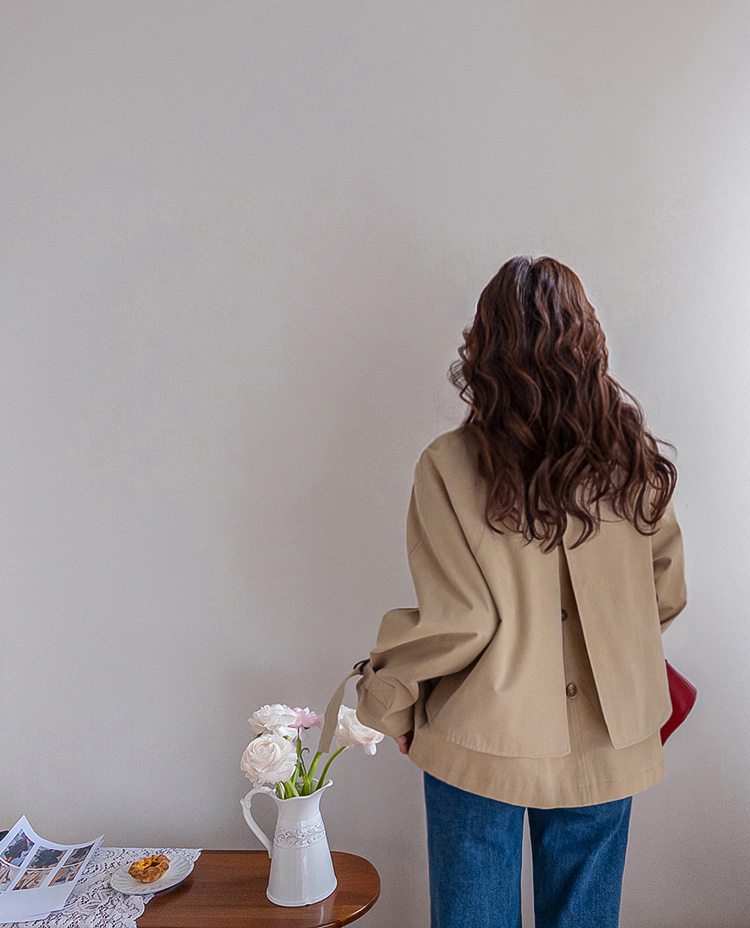 간절기에 가볍게 걸치기 좋은 A라인 하프 트렌치 소개드려요 ^^ 네크라인과 소매에 더해진 D링 비조 디테일이 트렌치 특유의 클래식한 분위기를 살려주며 깔끔하면서도 세련된 포인트가 되어줘요. 뒤에는 플랩 디테일과 뒷중심 버튼 장식이 더해져 움직일 때마다 중심이 살짝 벌어지며 디테일이 자연스럽게 드러나는 매력이 있어요. 허리 스트랩은 탈부착 가능해 툭 걸치면 내추럴한 A라인 핏으로, 묶어주면 허리선이 잡히면서 아래로 훌이 여성스럽게 퍼져 두 가지 분위기로 연출 가능한 트렌치랍니다 ♥