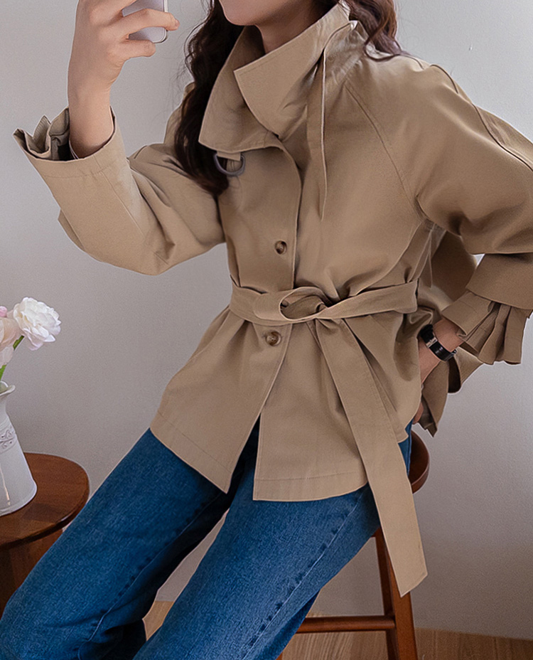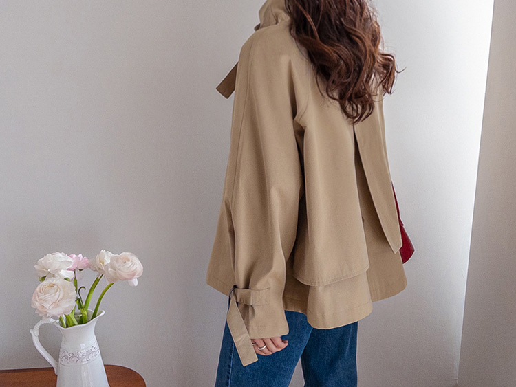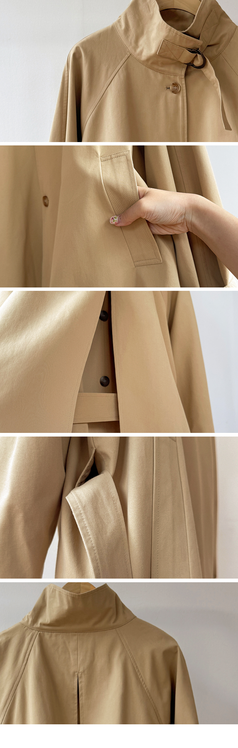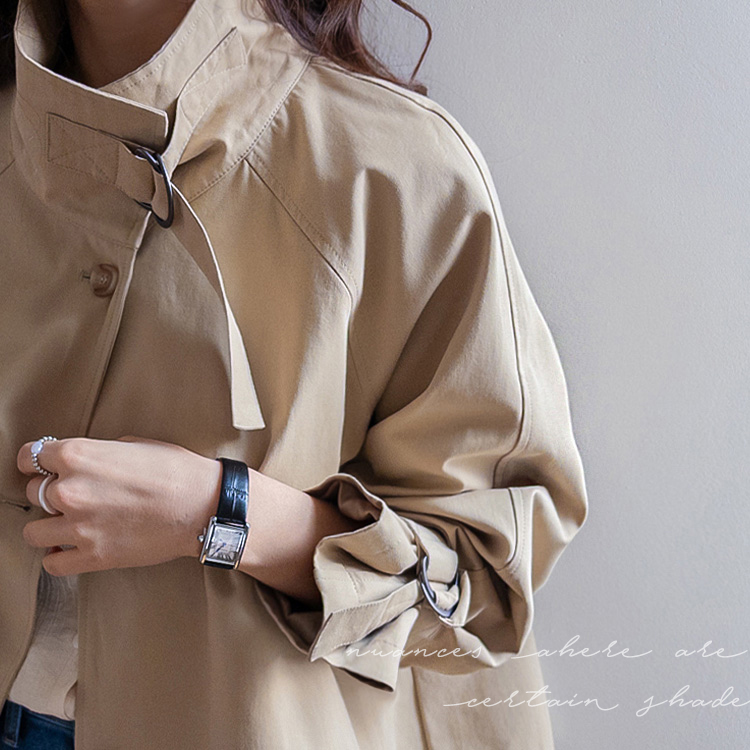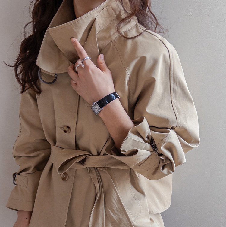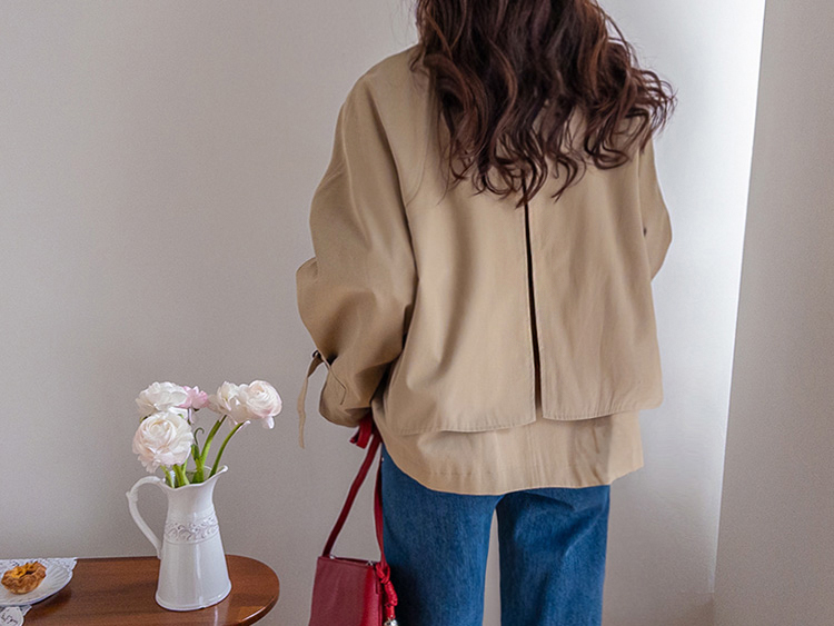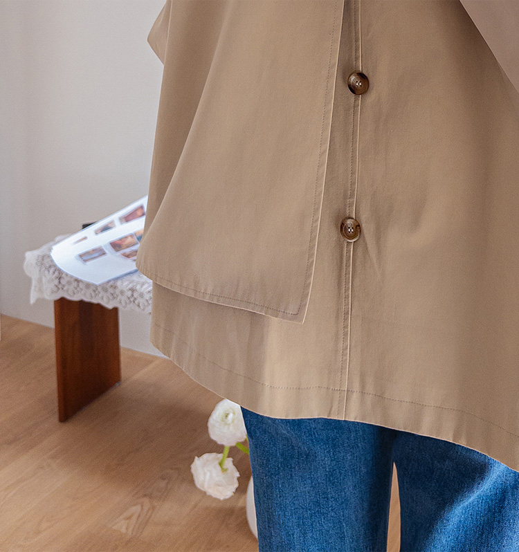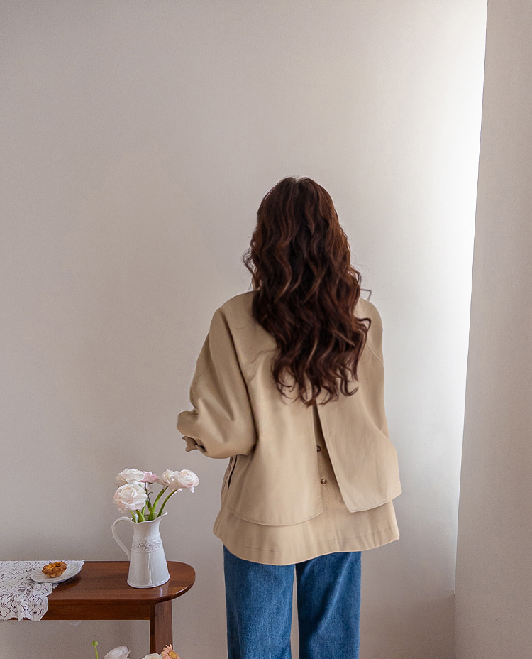 간절기에 가볍게 걸치기 좋은 A라인 하프 트렌치 소개드려요 ^^ 네크라인과 소매에 더해진 D링 비조 디테일이 트렌치 특유의 클래식한 분위기를 살려주며 깔끔하면서도 세련된 포인트가 되어줘요. 뒤에는 플랩 디테일과 뒷중심 버튼 장식이 더해져 움직일 때마다 중심이 살짝 벌어지며 디테일이 자연스럽게 드러나는 매력이 있어요. 허리 스트랩은 탈부착 가능해 툭 걸치면 내추럴한 A라인 핏으로, 묶어주면 허리선이 잡히면서 아래로 훌이 여성스럽게 퍼져 두 가지 분위기로 연출 가능한 트렌치랍니다 ♥