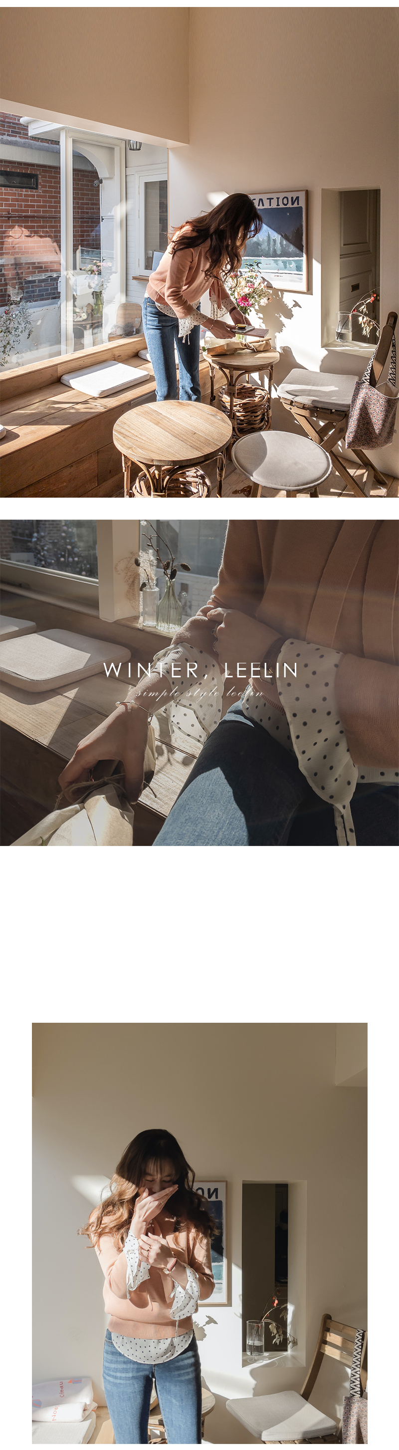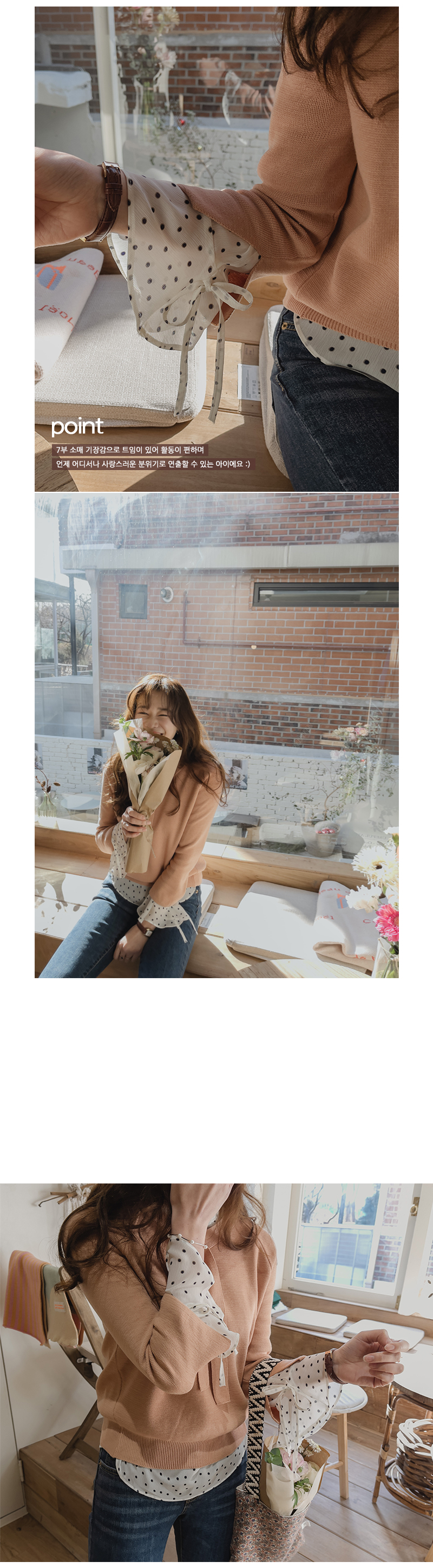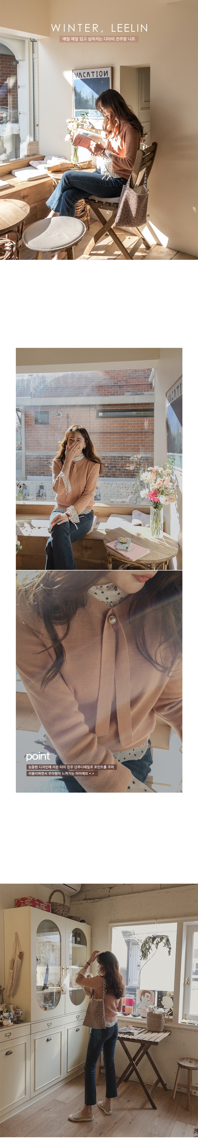 우아하고 여성스러운 니트를 소개해드릴게요 ~ 첫 인상은 몽글몽글하고 귀여운 느낌으로 딱 떨어지는 센스있는 핏 때문에 입었을 때 훨씬 더 만족했던 제품이에요 ! 심플한 디자인에 리본 진주 포인트로 러블리하고 우아함을 돋보여줘 밋밋함을 줄였고 포인트를 줄 수 있는 아이에요 소매부분에는 한번 더 접어서 포인트를 주어 베이직하고 깔끔한 디자인의 기본 아이템이라 언제 어디서나 가볍게 단품으로 입기 좋았어요 ^^ 색감까지 하나하나 매력적이게 나와서 포인트용으로도 코디하실 수 있는 세미니트로 단품으로 입어도 은은한 느낌이 느껴지는 제품이라 사랑스러운 분위기로 입어보기에 좋아요 골반 위로 떨어지는 기장감으로 다리가 더욱 길어보이고 핏 자체는 심플한 편이지만 목라인, 시보리가 도톰하게 짜여져서 쉽게 늘어지지 않고 캐주얼한 느낌도 나서 여러가지로 매치하기 쉬우실거에요 ! 낑기지 않는 세미루즈핏이여서 어깨 부분이 넓으면서 품이 꽤 넉넉한 편이라 흐르듯 자연스러운 실루엣을 연출해줘요 부드럽고 유연한 아크릴 소재로 제작되어 피부가 예민하신 분들도 편안하게 착용되고 신축성이 좋아 자연스럽게 체형에 맞게 밀착되어 볼륨감있는 라인을 연출해 주는 아이템이에요 ~ 맨살에 바로 입어보실 수 있는 부드러운 니트이고 몽글몽글한 분위기에 보드러워지는 소재감으로 포근하게 코디해보시기 좋답니다 '*' 청바지, 스커트, 원피스에 코디하셔서 입기 좋아서 추천드리는 아이템입니다 ♡